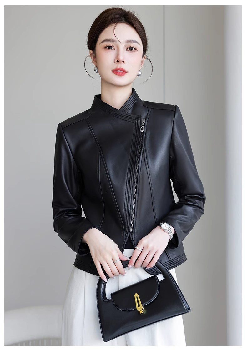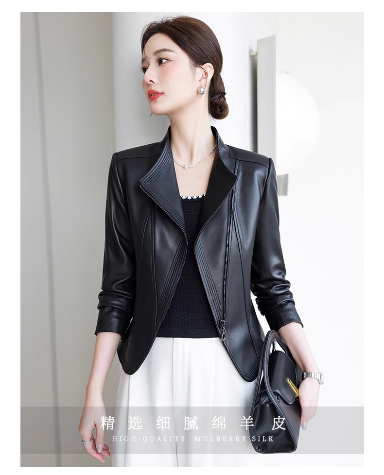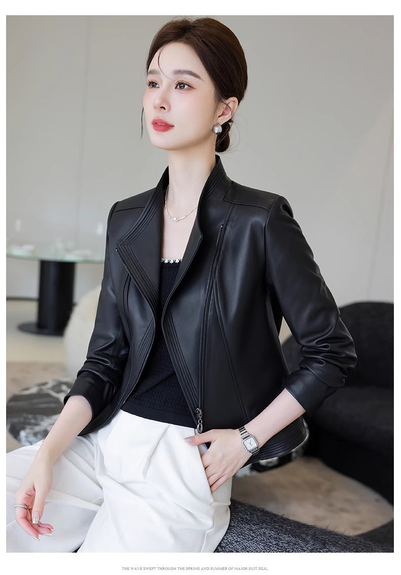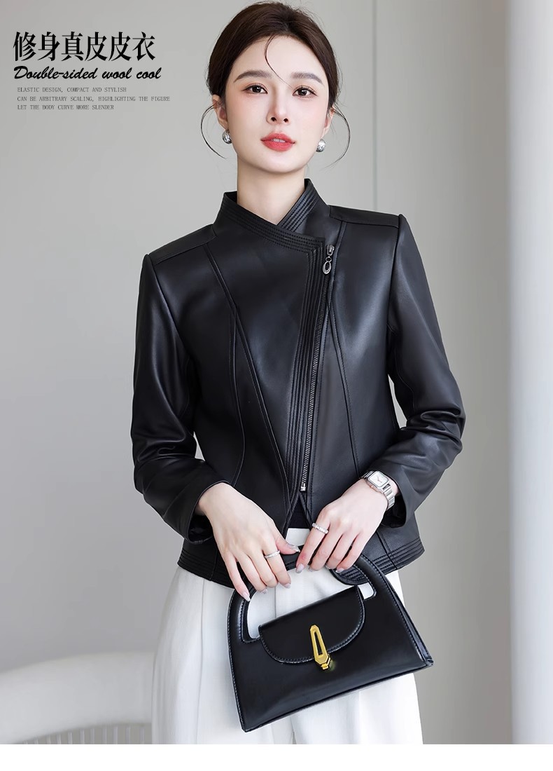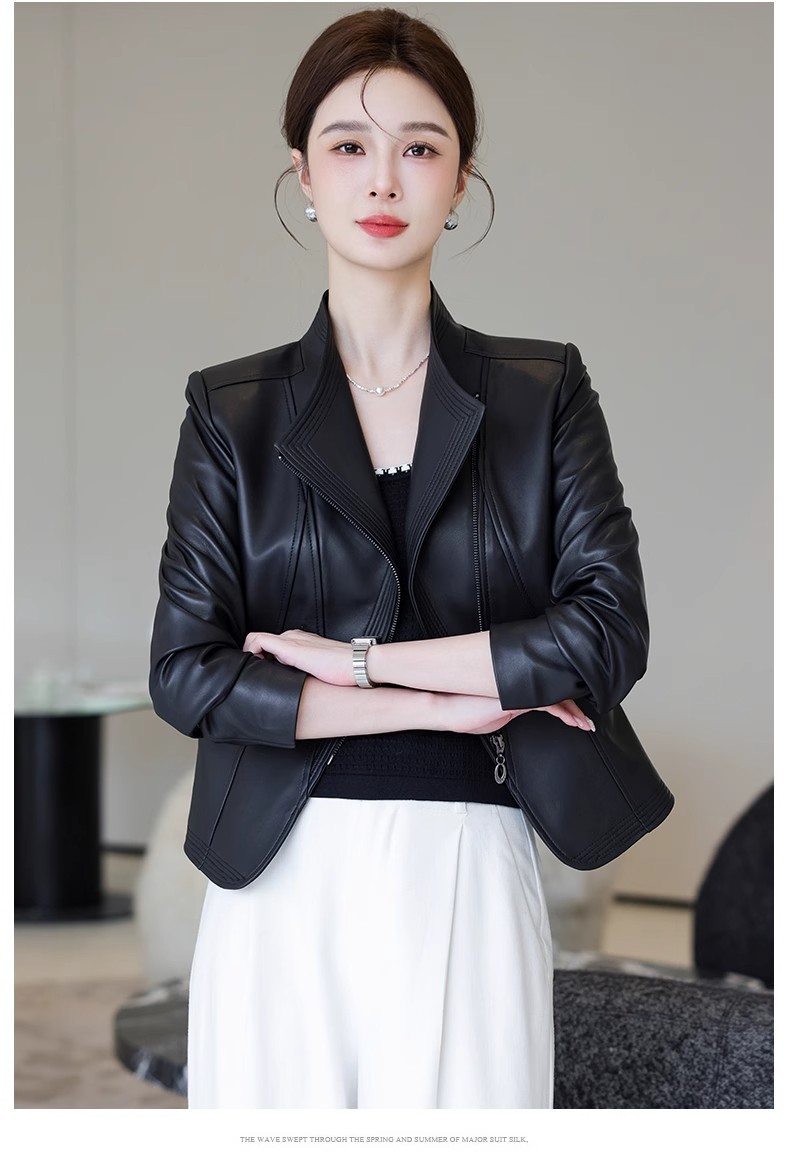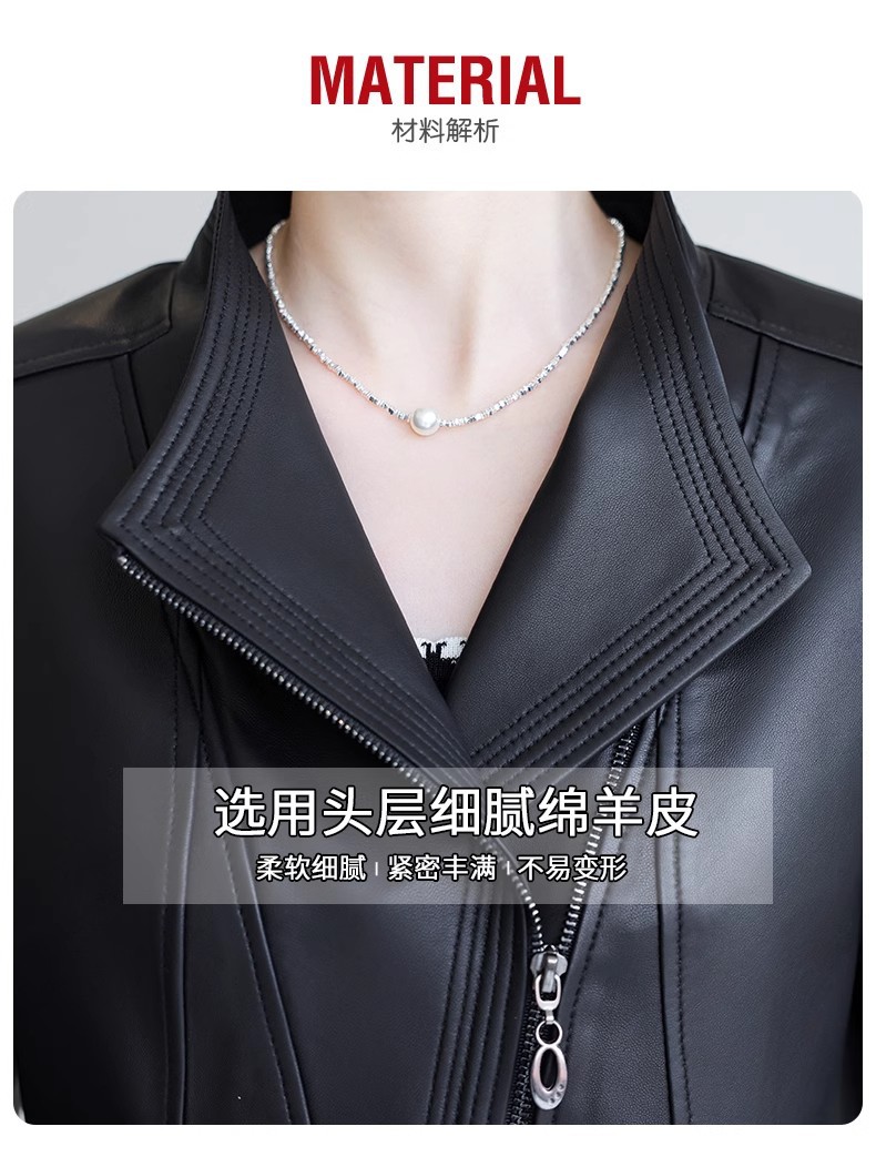 2026 봄 신상 여성용 가죽 자켓, 짧은 스타일, 스탠드 칼라, 슬림핏, 허닝산 오토바이 양가죽 자켓, 슬리밍 효과스토어 가기