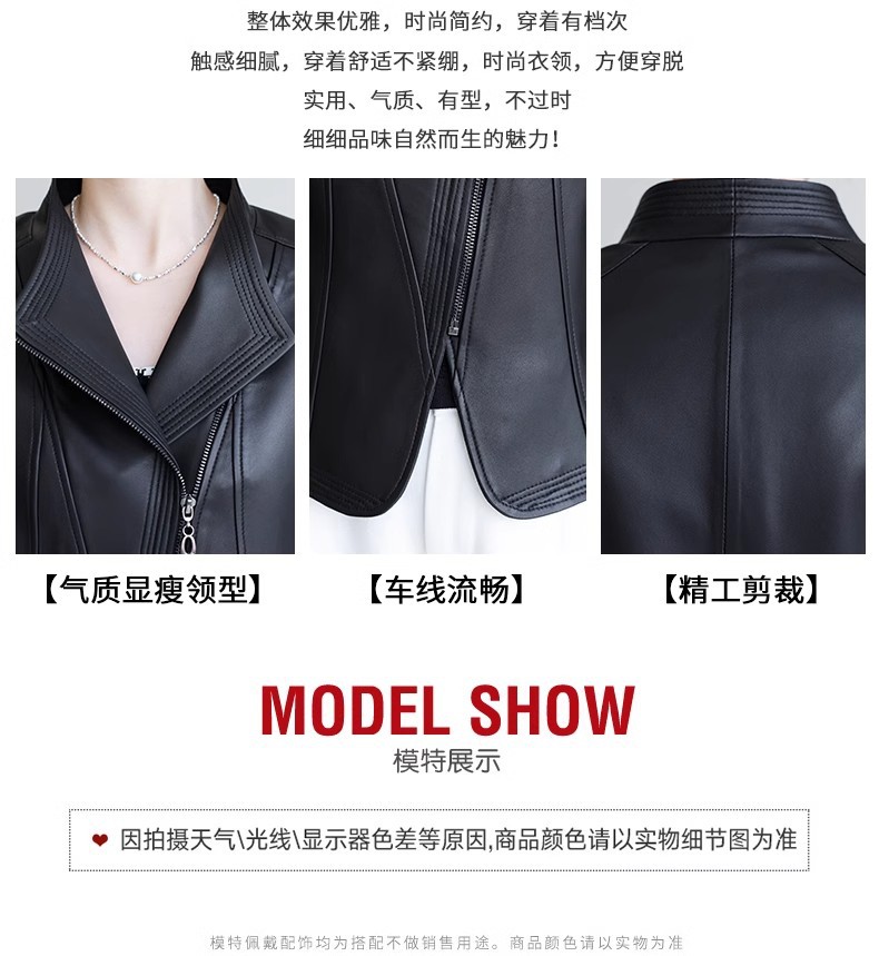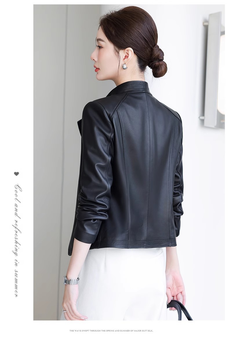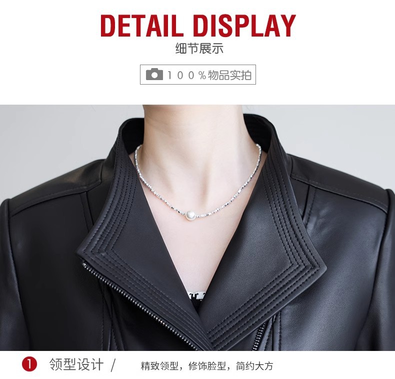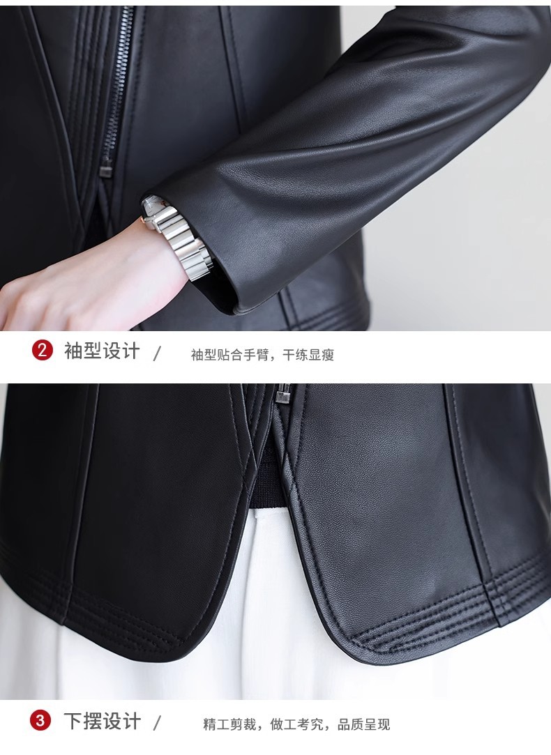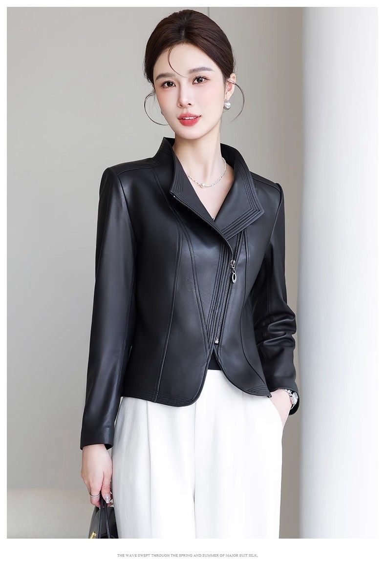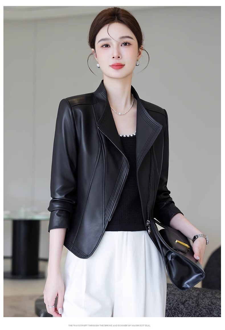 2026 봄 신상 여성용 가죽 자켓, 짧은 스타일, 스탠드 칼라, 슬림핏, 허닝산 오토바이 양가죽 자켓, 슬리밍 효과스토어 가기