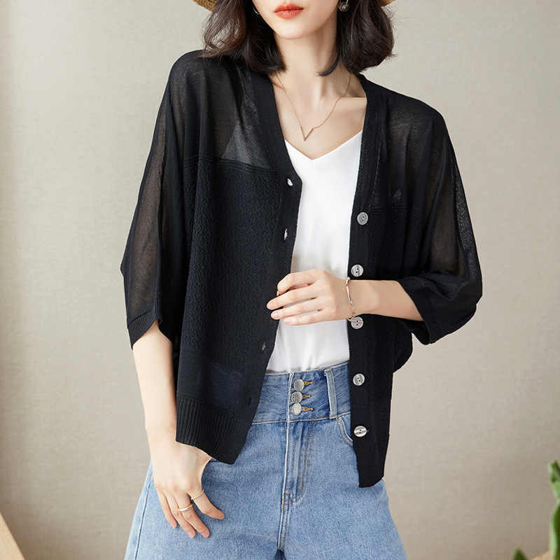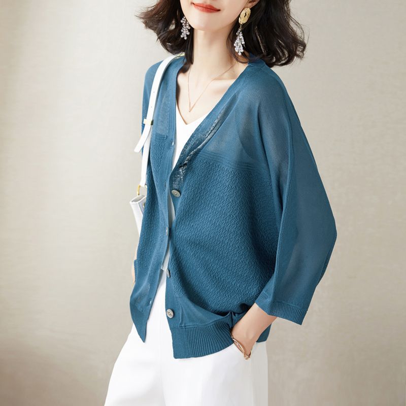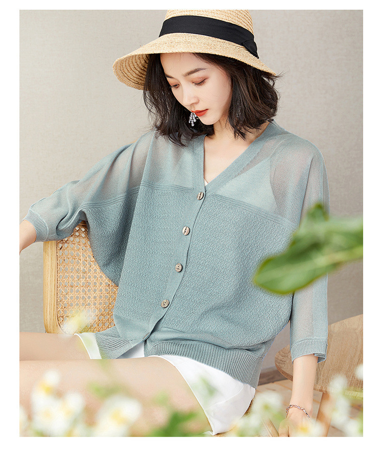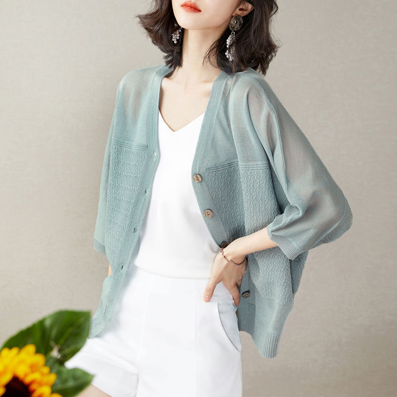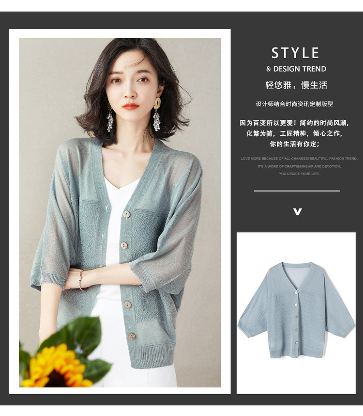 200 진 웨어러블 카디건 티셔츠 여성용 루즈 플러스 사이즈 여름 새로운 아이스 실크 세븐 포인트 슬리브 얇은 선스크린 니트 탑스토어 가기