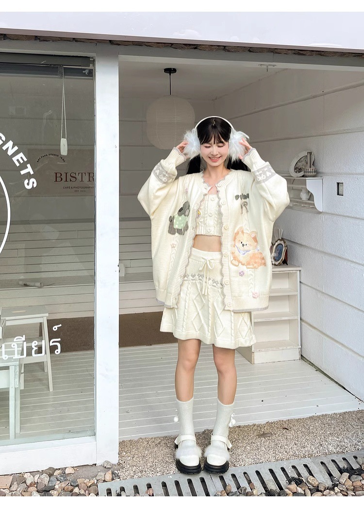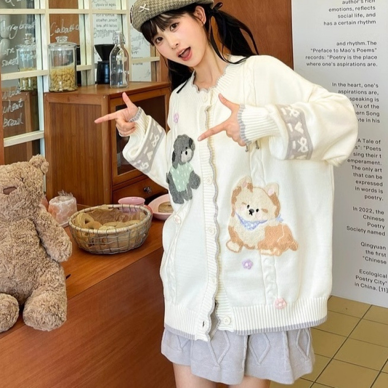 귀여운 강아지 자수 스웨터 니트 카디건 작은 꽃 입체 장식 귀여운 코트 따뜻한