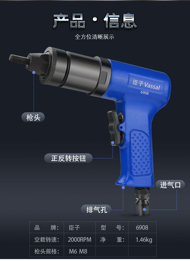 • Chenzi 산업용 등급 공압 너트 건 6908(M6/M8 건 헤드) + 무료 착용 부품 패키지