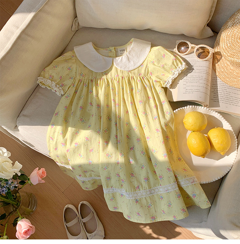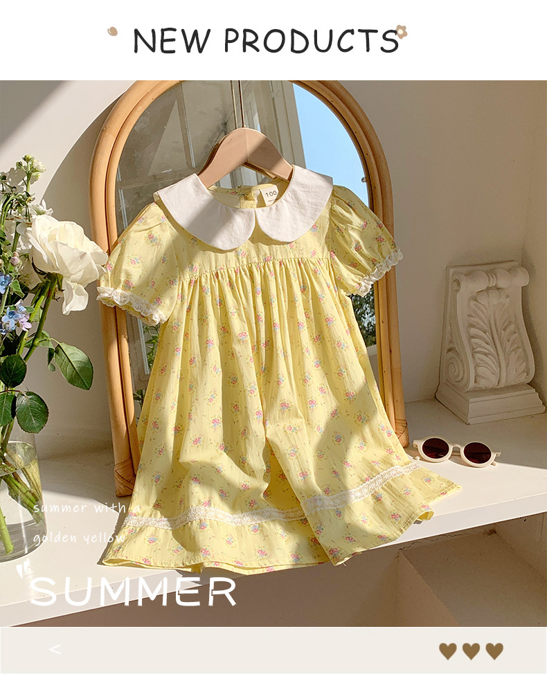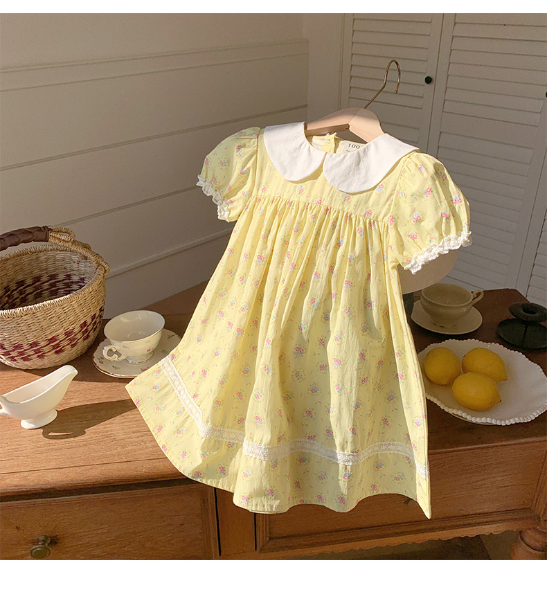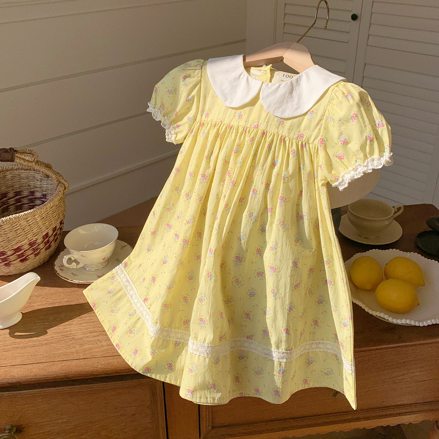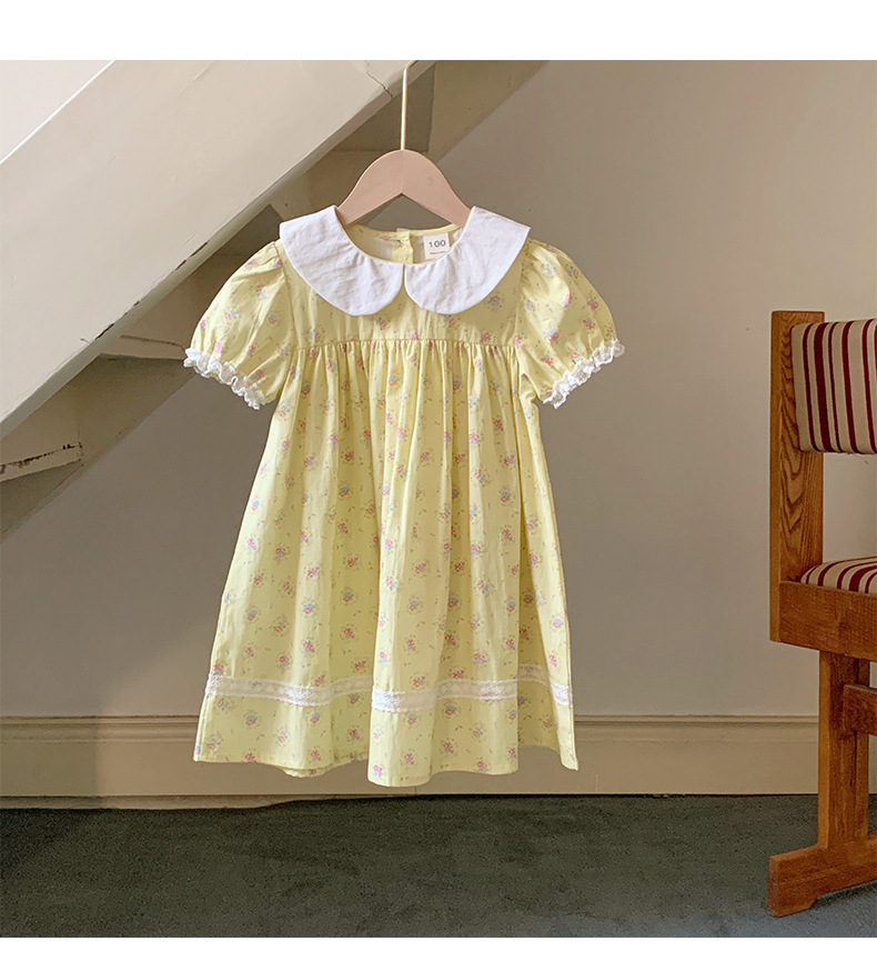 2025 년 여름 신형 인형 칼라 대조 컬러 걸스 원피스 레이스 레이스 레이스 버블 반소매 공주 원피스 한국 아동복스토어 가기