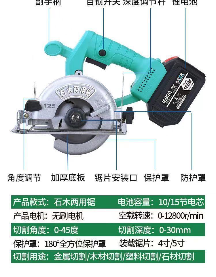 5 인치 전기 원형 본 리튬 전기 절단 기계 다기능 전기 톱 충전식 휴대용 범용 48/88VF 전기 톱 목공 톱