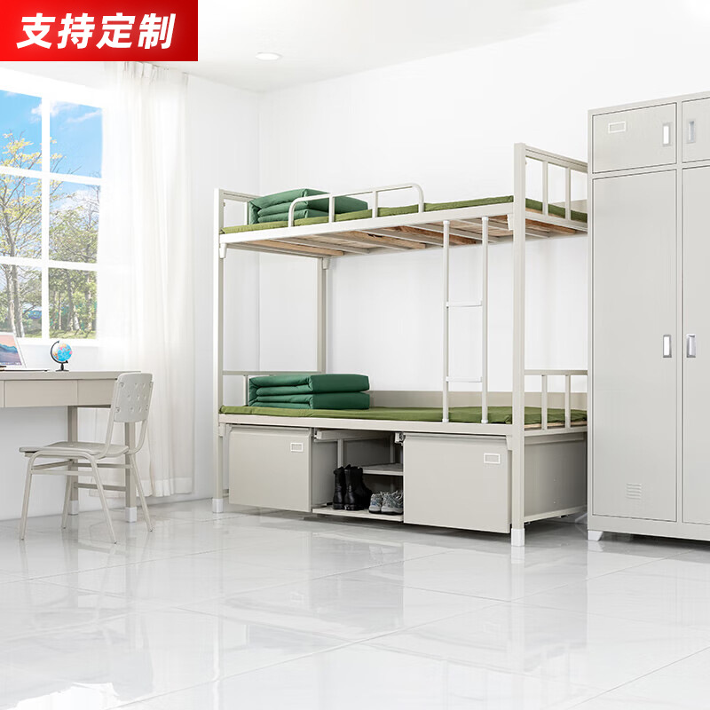 표준 캠프 장비 이층 침대 유닛 이층 철제 프레임 침대 직원 기숙사 상단 침대 및 하단 책상 내부 캐비닛 학습 테이블스토어 가기