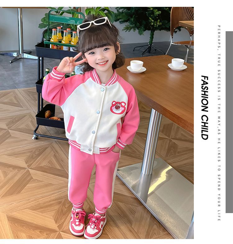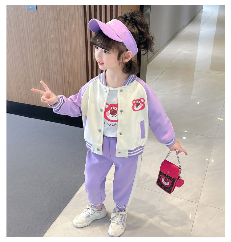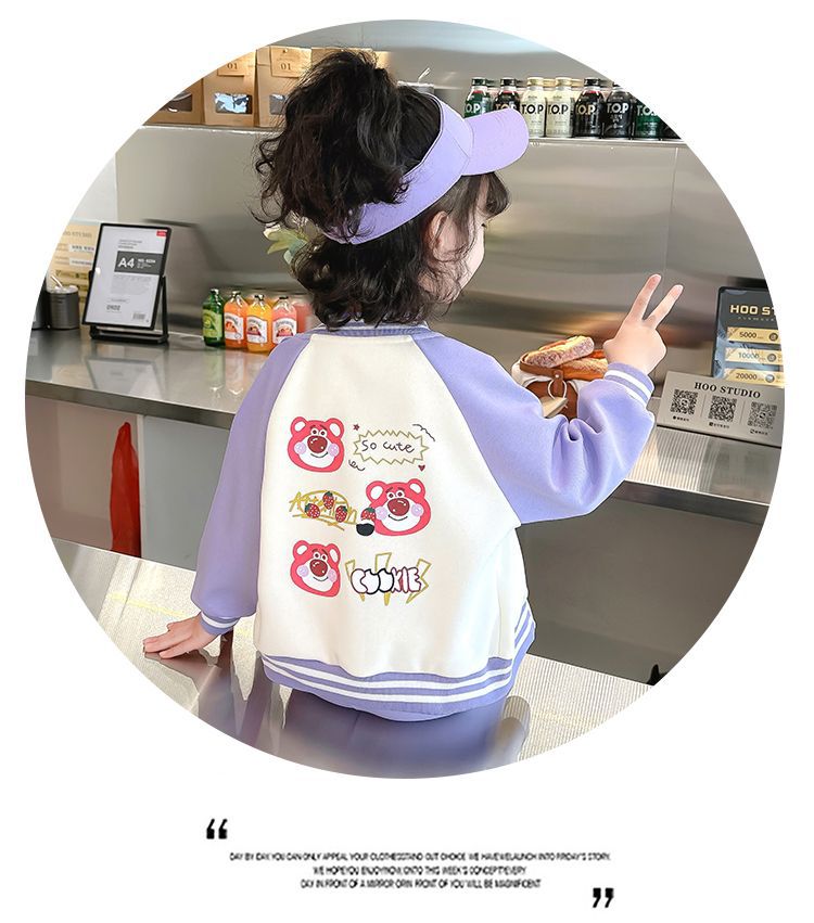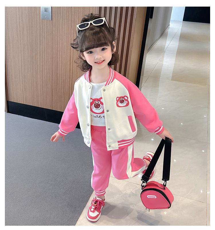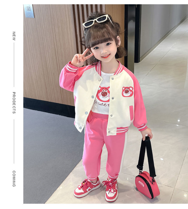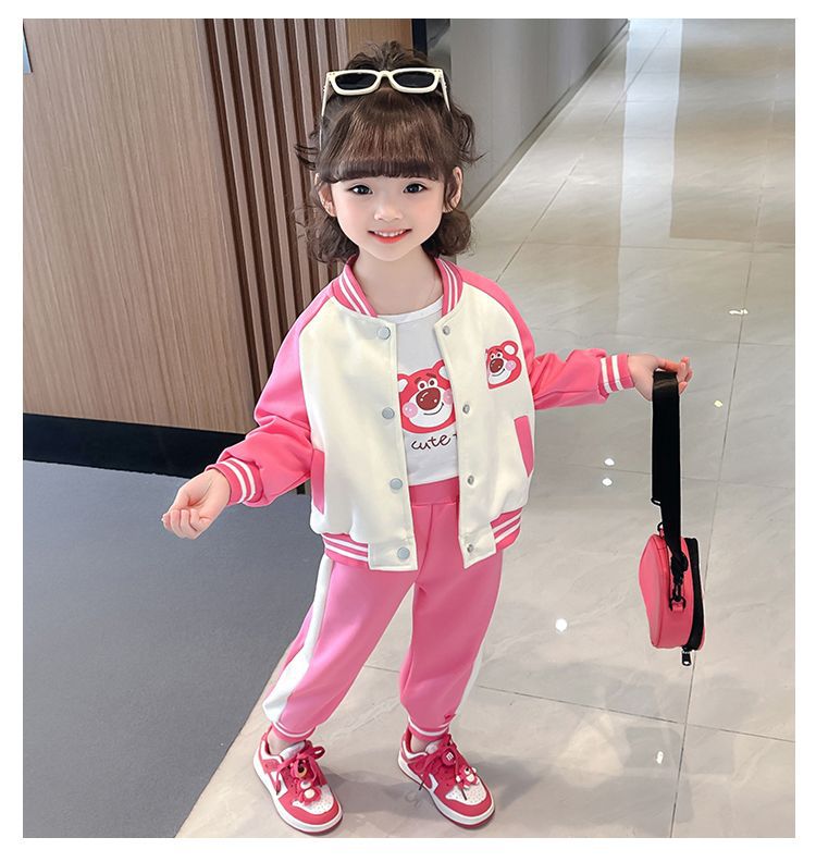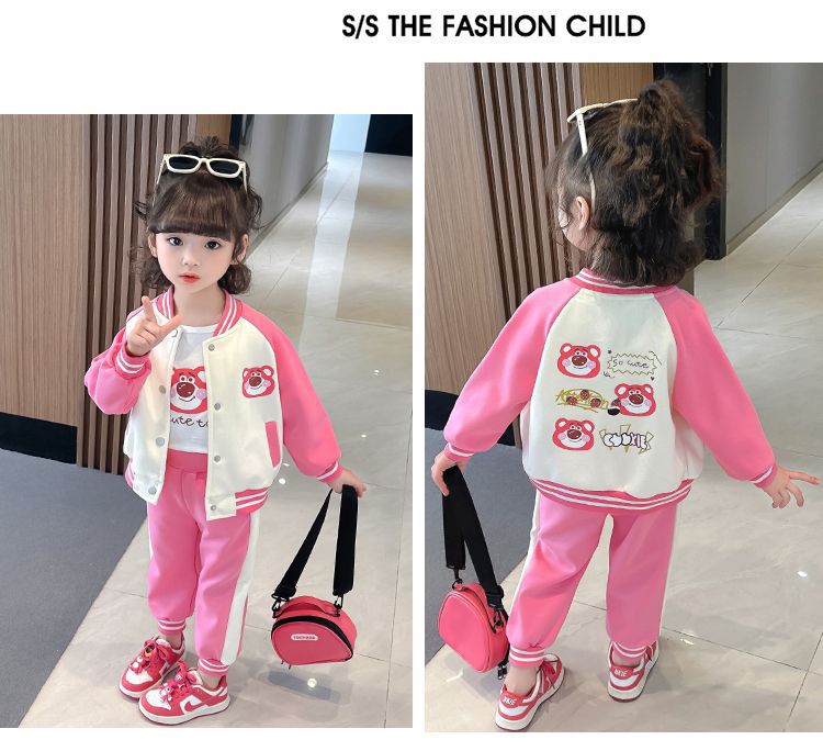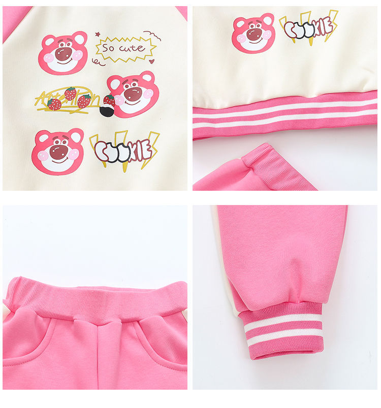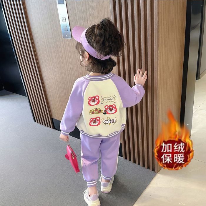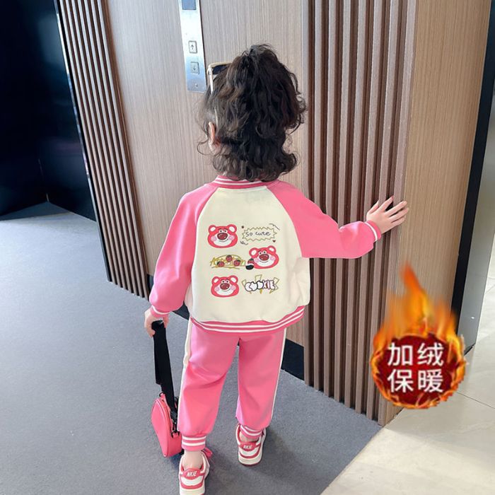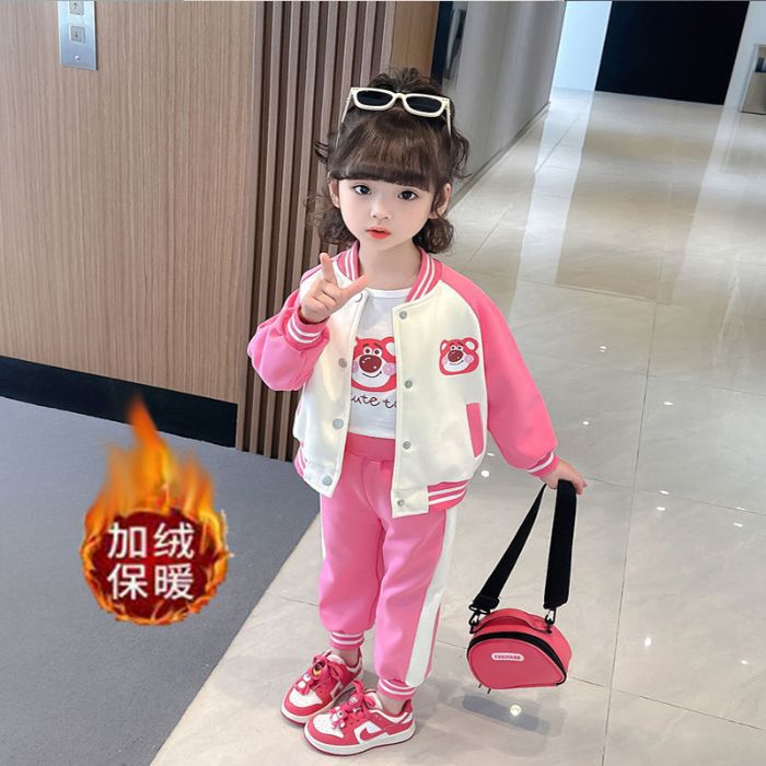 어린 소녀 겨울 옷 기모 두꺼운 딸기 곰 아기 소녀 캐주얼 야구 세트 세트 스타일 공주 3 피스 세트