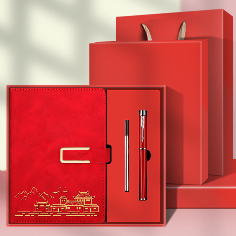 • 중국 빨간색 A5 부드러운 가죽 책 + 플라스틱 펜 + 선물 상자 (선물 가방 없음)