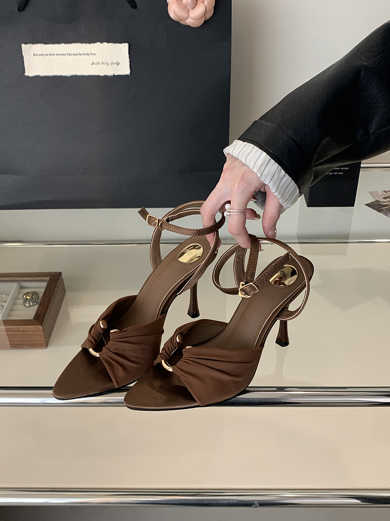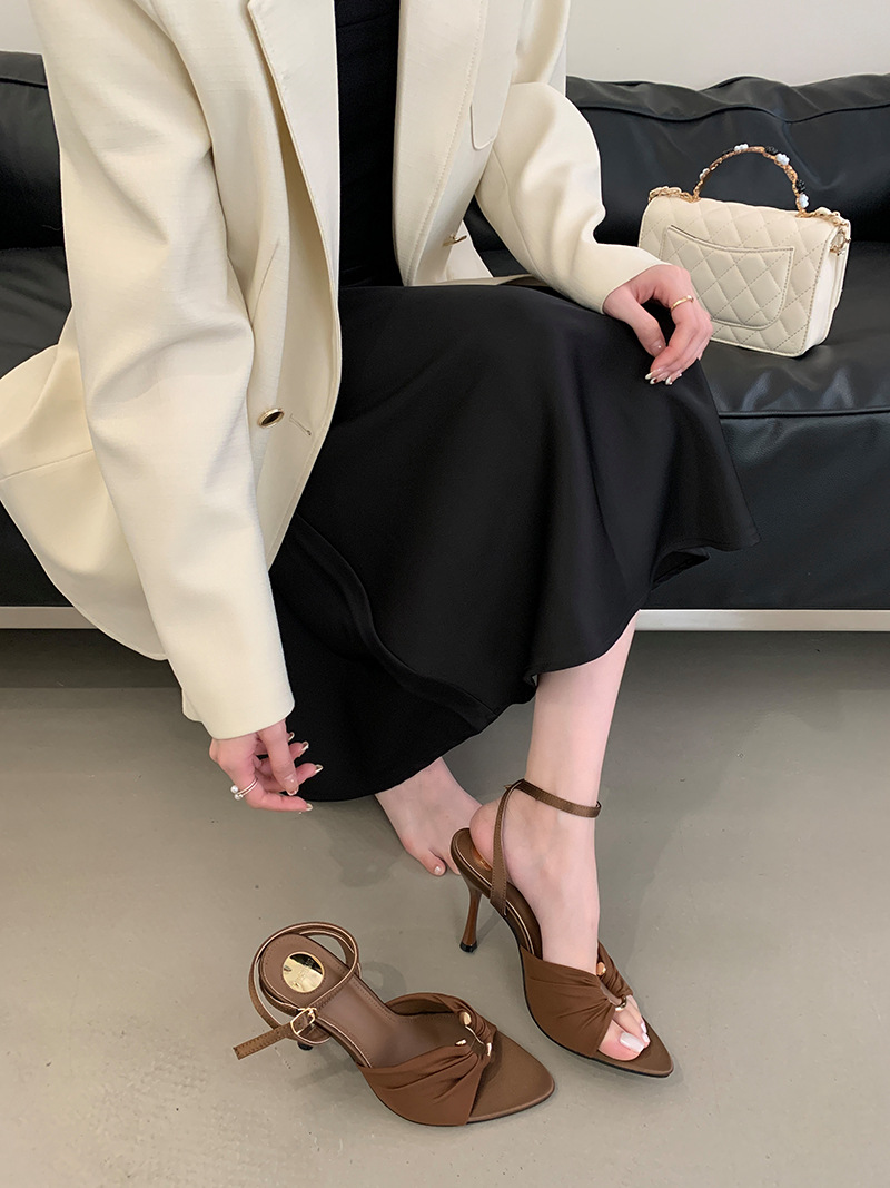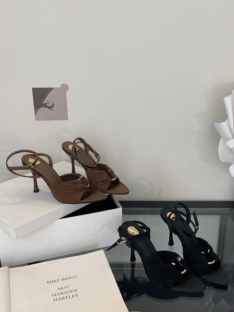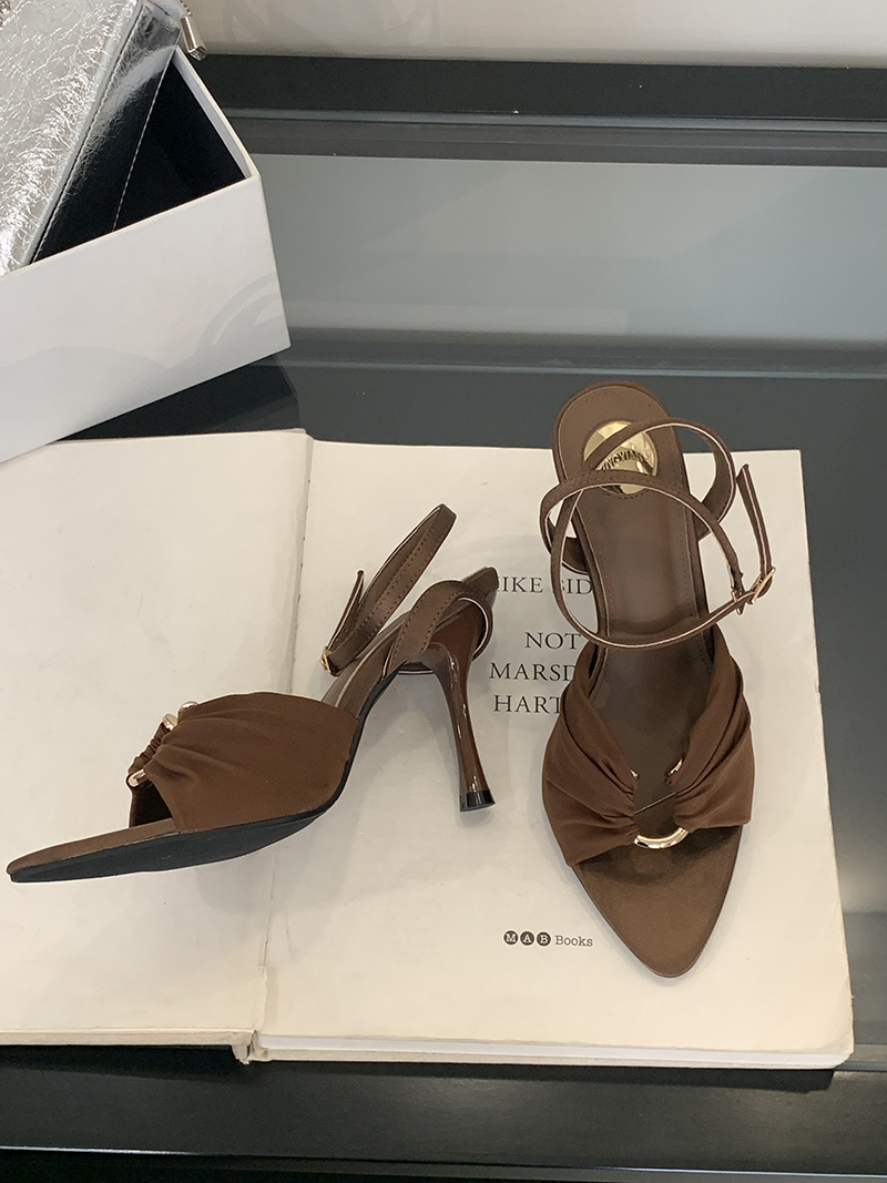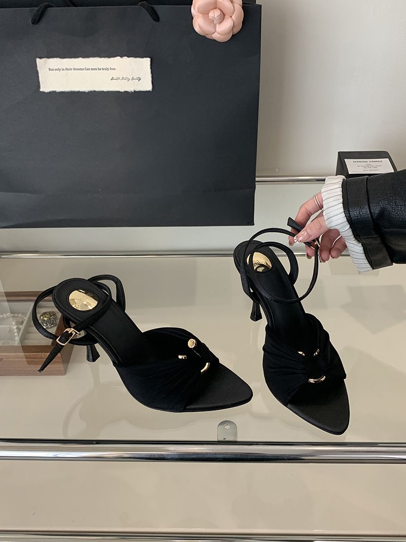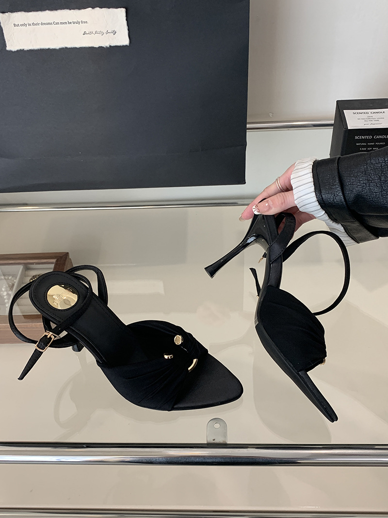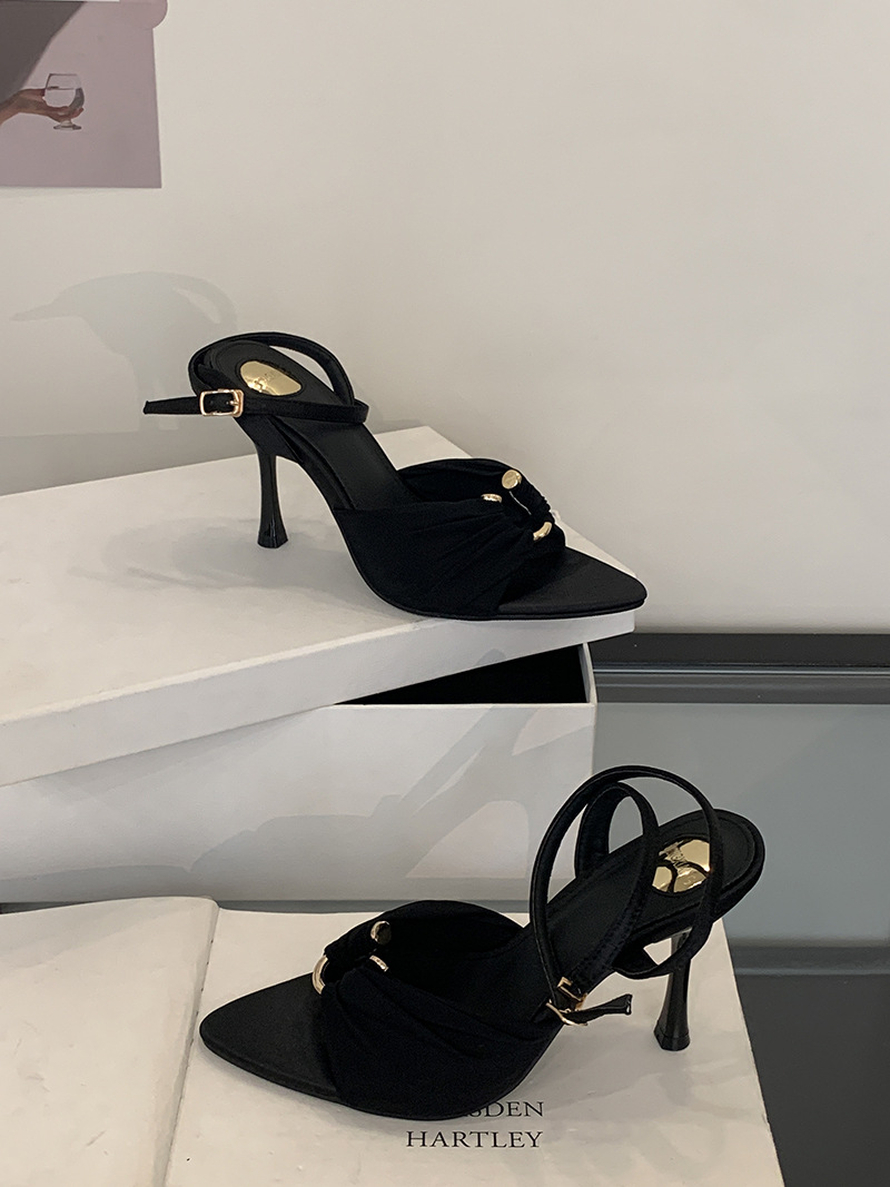 2025 여름 패션 오픈 토 여성 신발, 레이디 스타일 포인티드 토 새틴 샌들, 유럽과 미국 스타일의 메탈 버클 하이힐스토어 가기