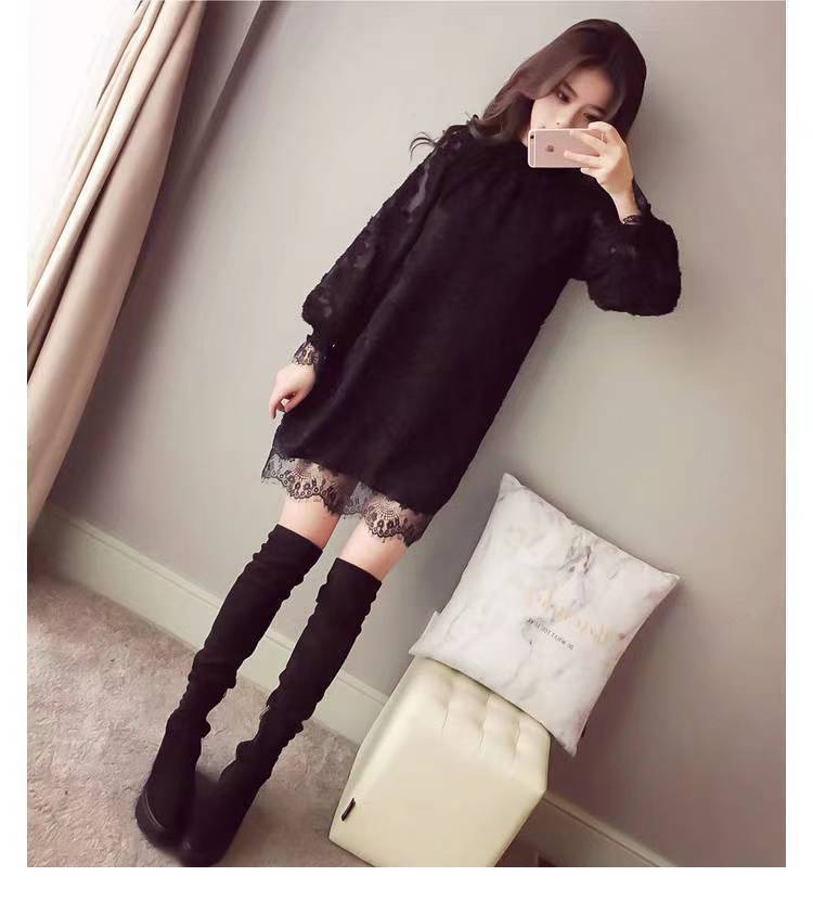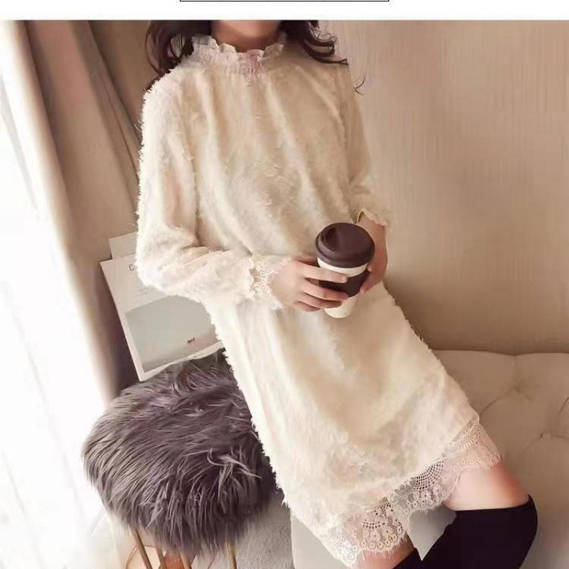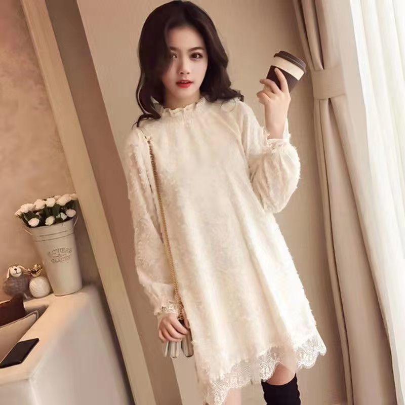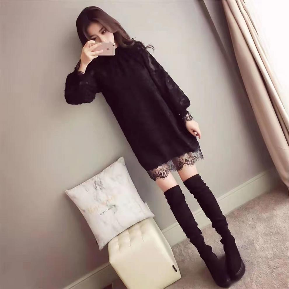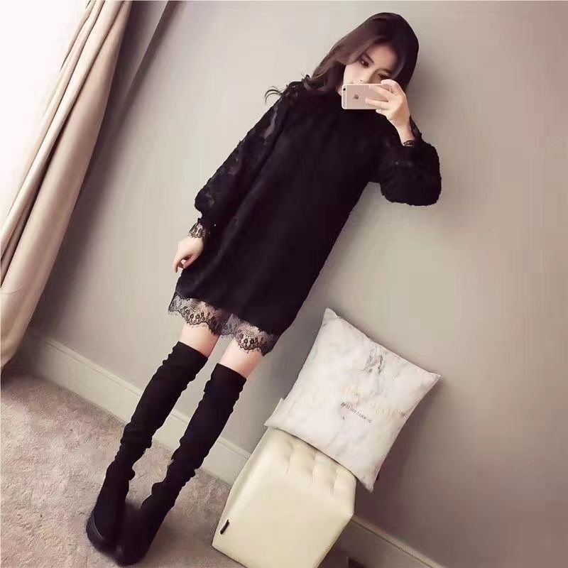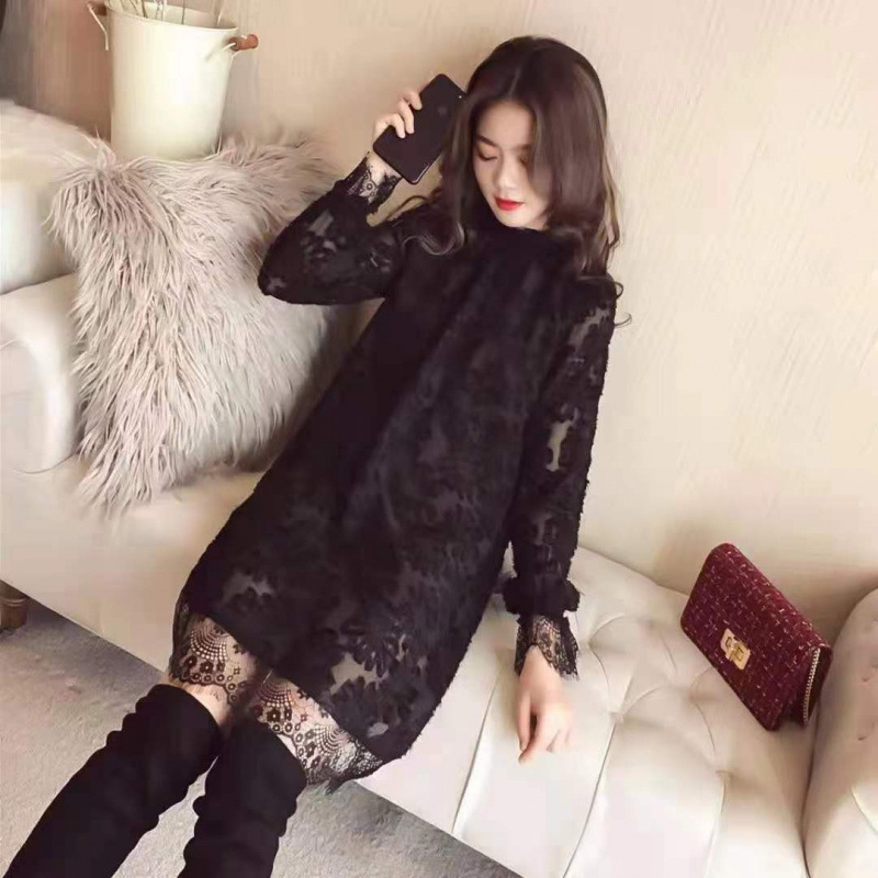 중간 길이의 레이스 두꺼운 티셔츠베이스 셔츠 여성의 봄과 가을 새로운 한국식 느슨한 슬리밍 쉬폰 원피스 탑