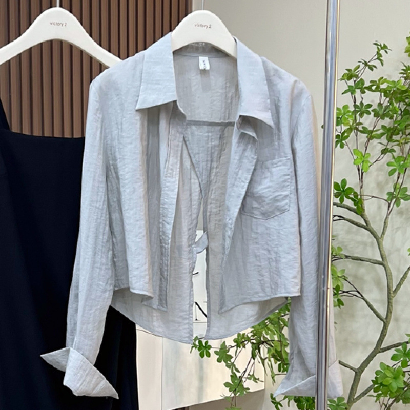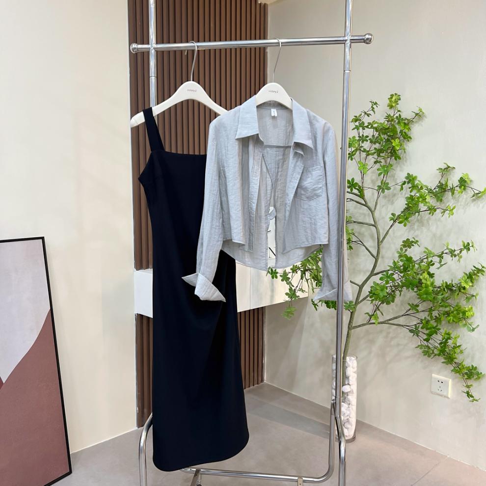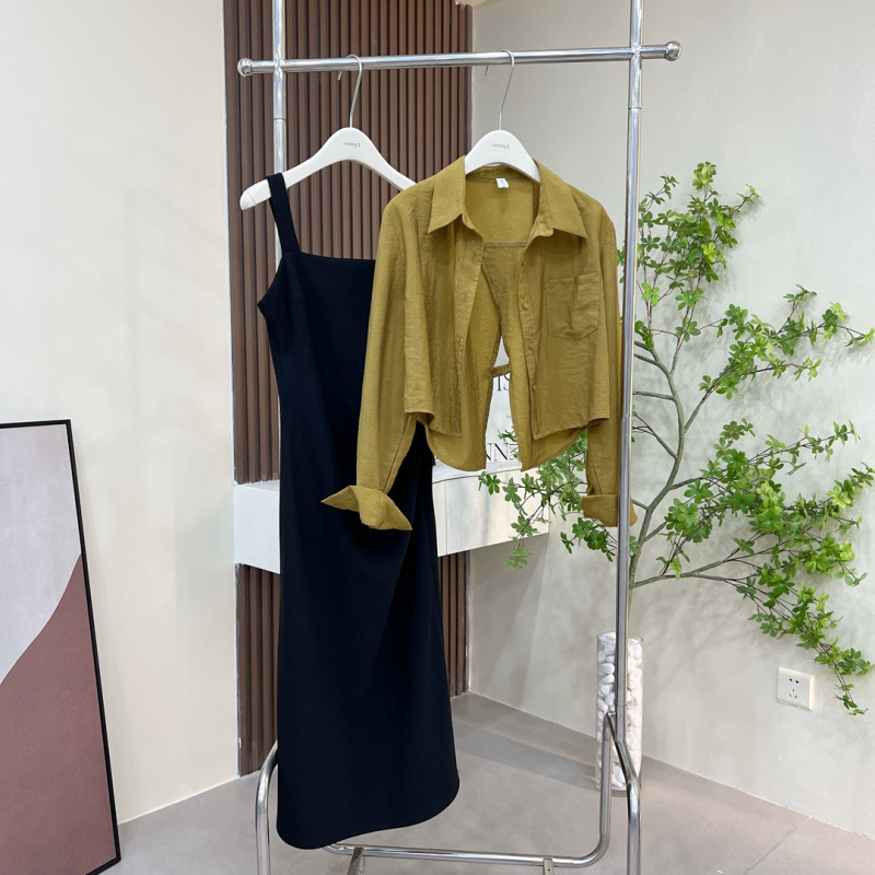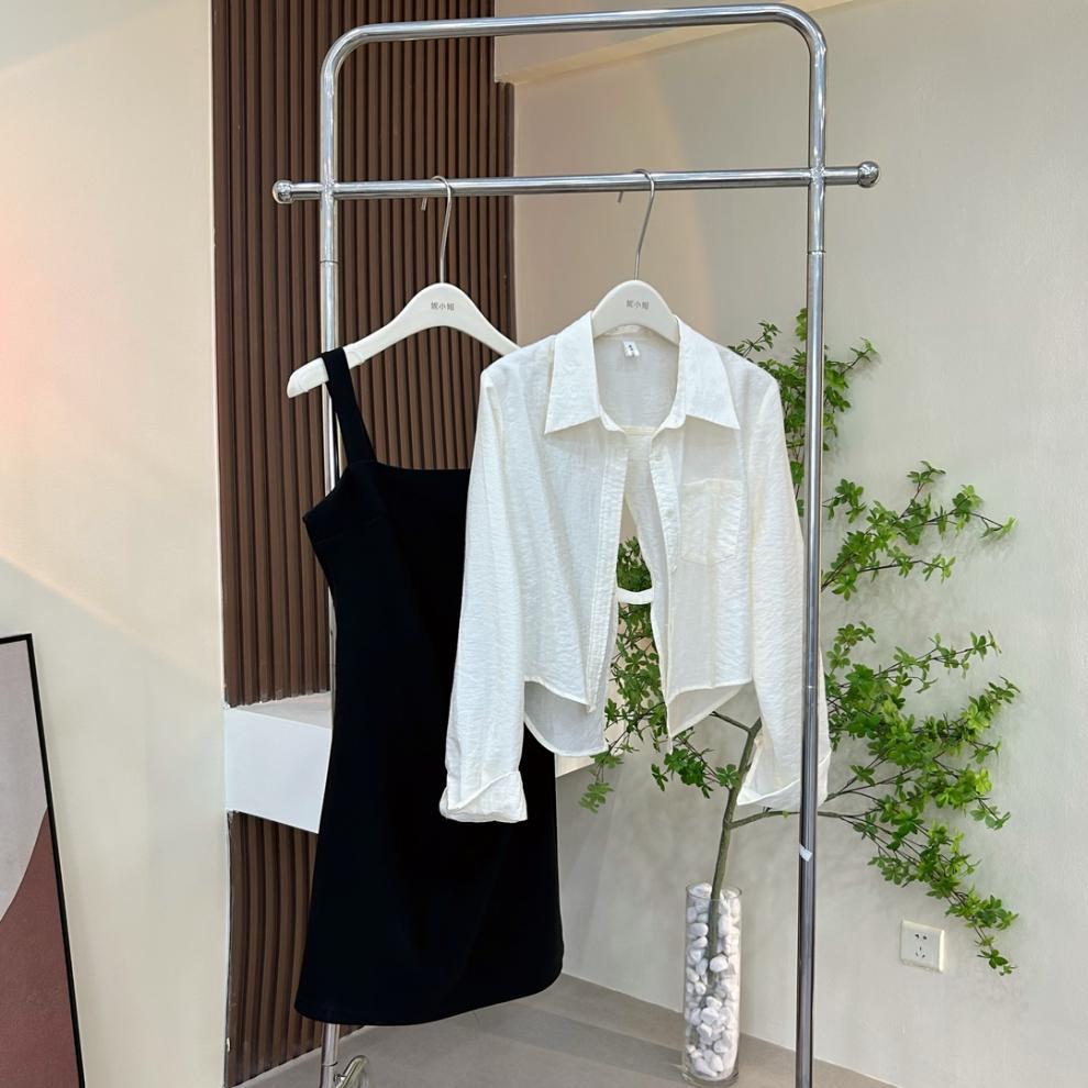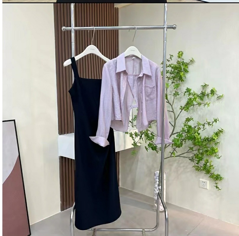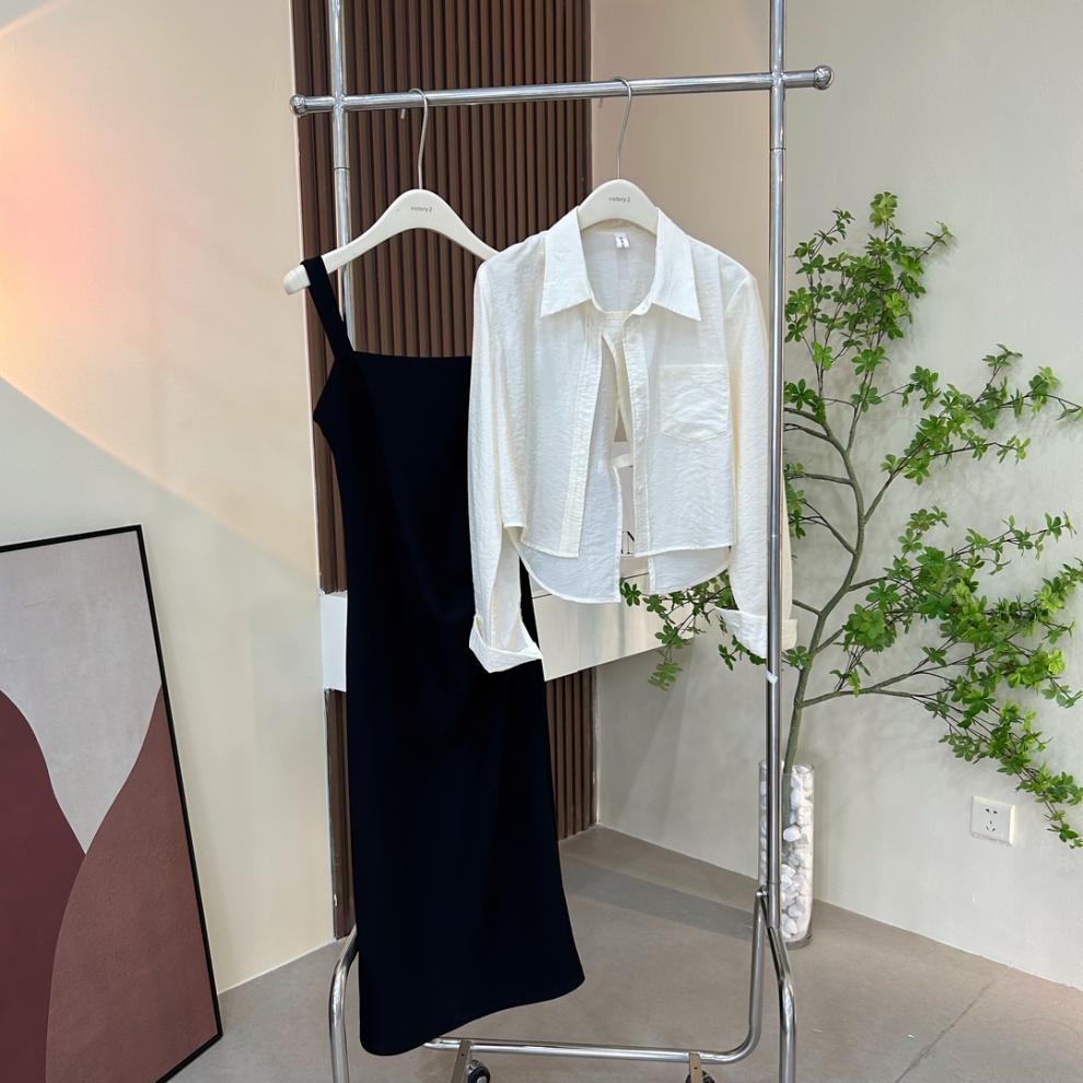 짧은 뒤 분할 긴 소매 태양 셔츠 여자의 2025 여름 새로운 주름 슬립 스커트 세트 외부 카디건스토어 가기