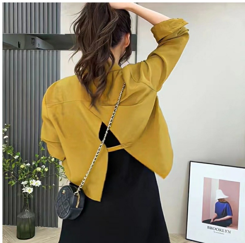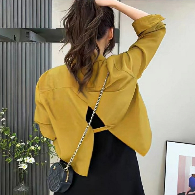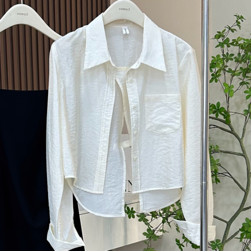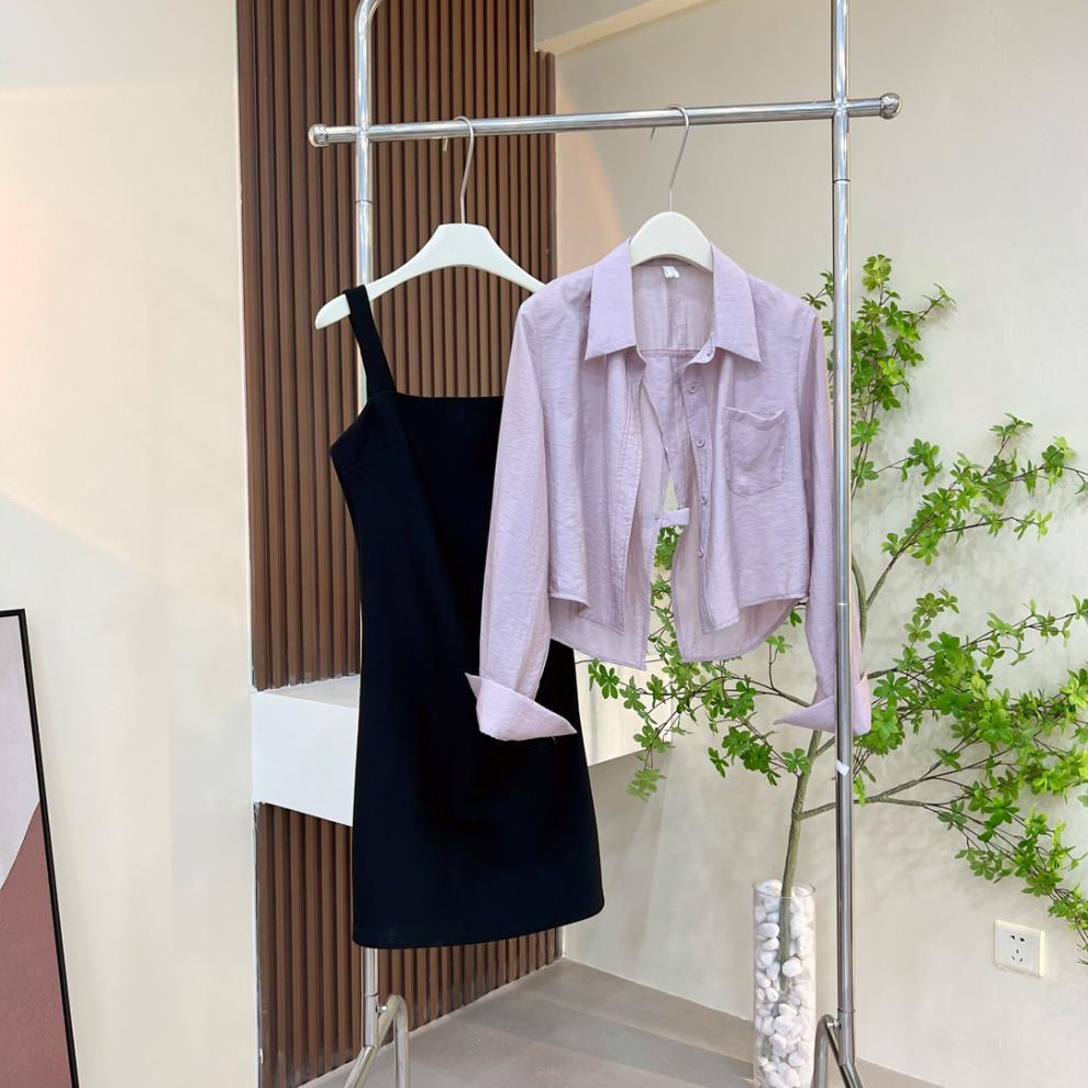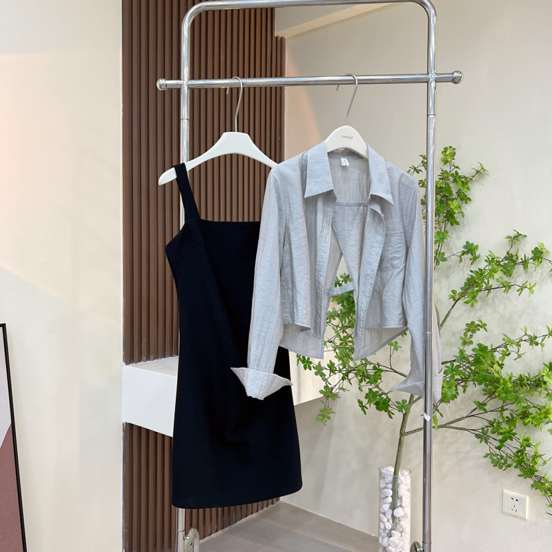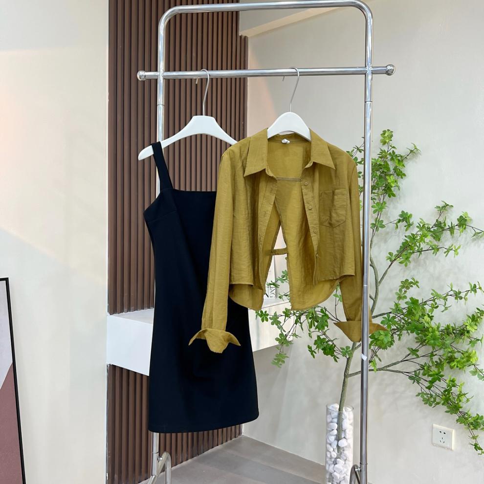 짧은 뒤 분할 긴 소매 태양 셔츠 여자의 2025 여름 새로운 주름 슬립 스커트 세트 외부 카디건스토어 가기