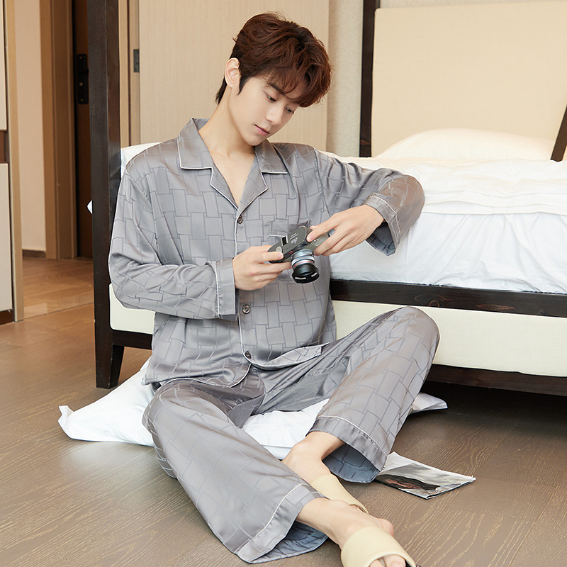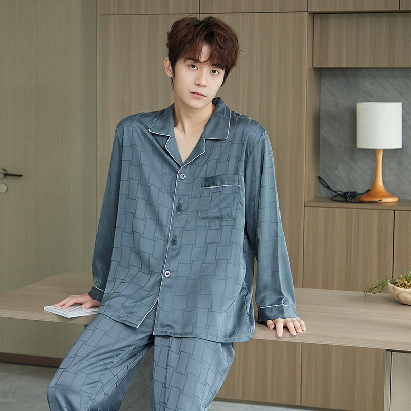 잠옷 남자 아이스 실크 긴팔 바지 봄과 가을 인쇄 하이 엔드 센스 남성 실크 홈 의류 세트 플러스 사이즈스토어 가기