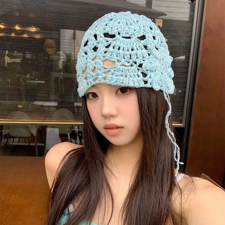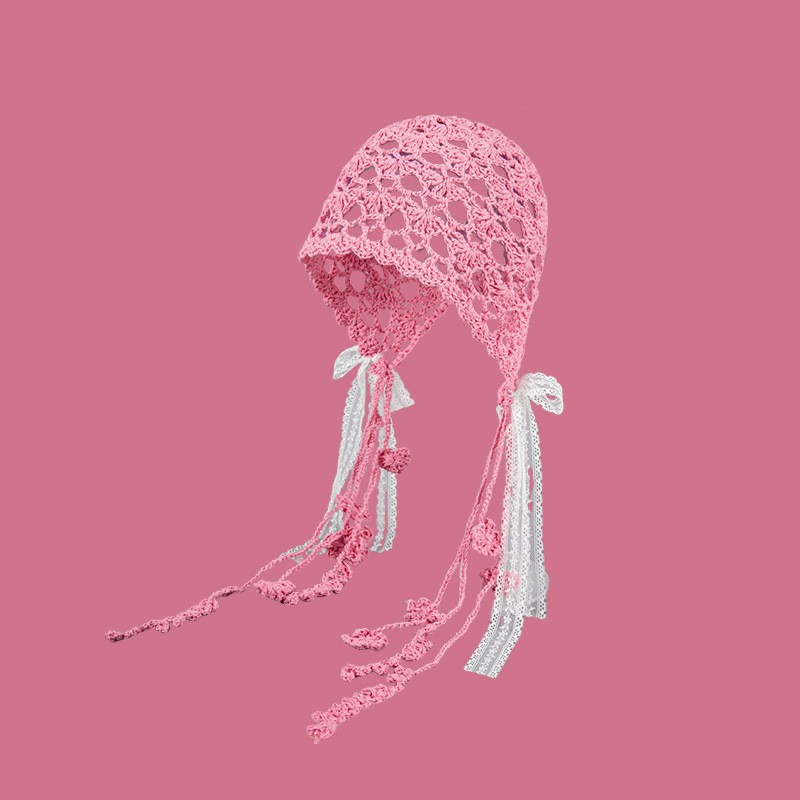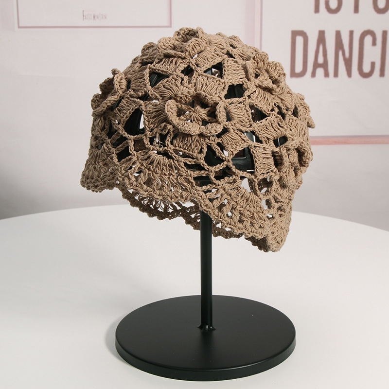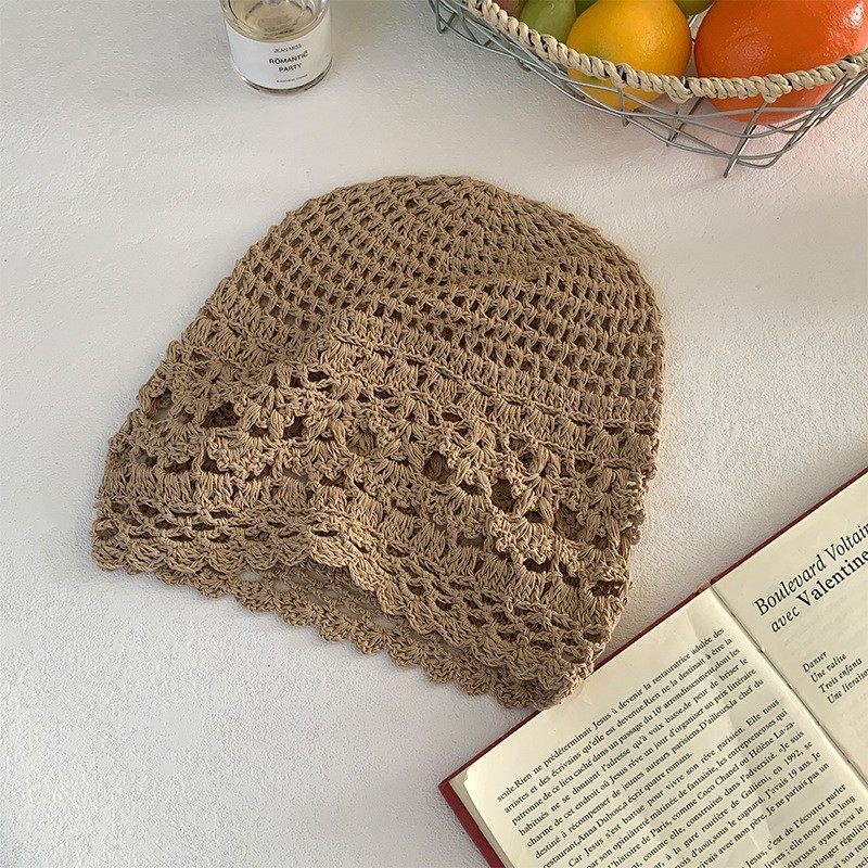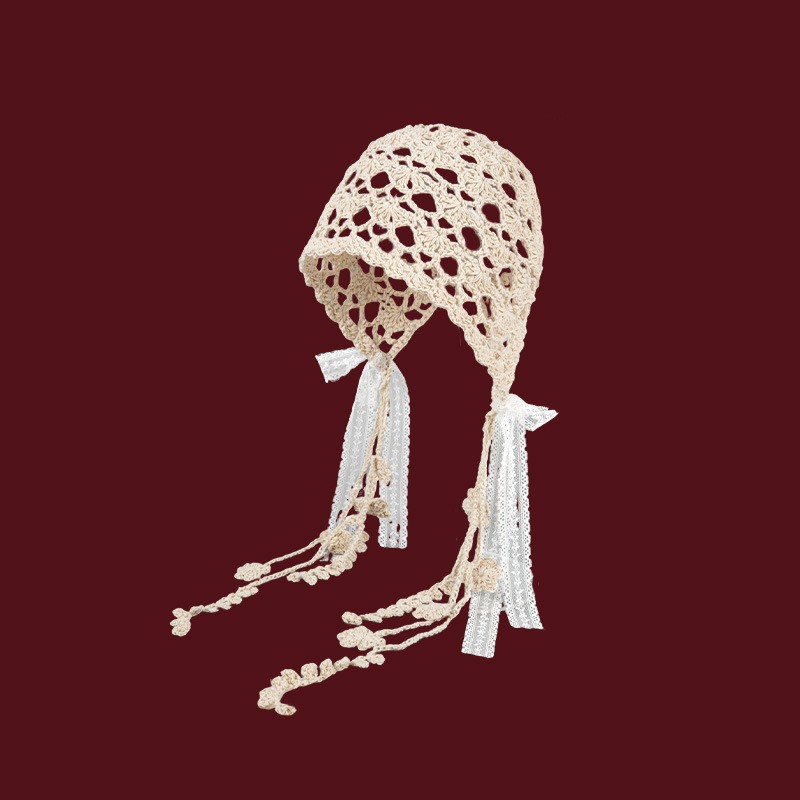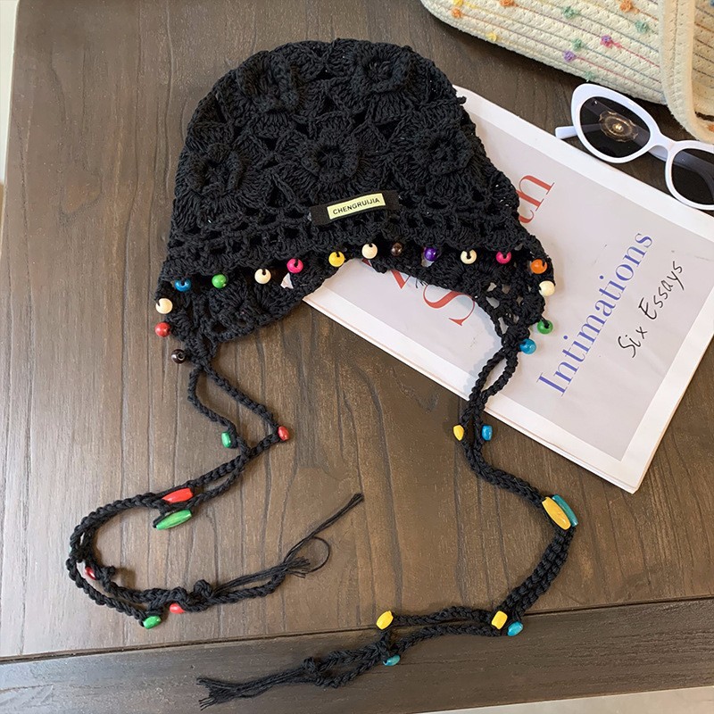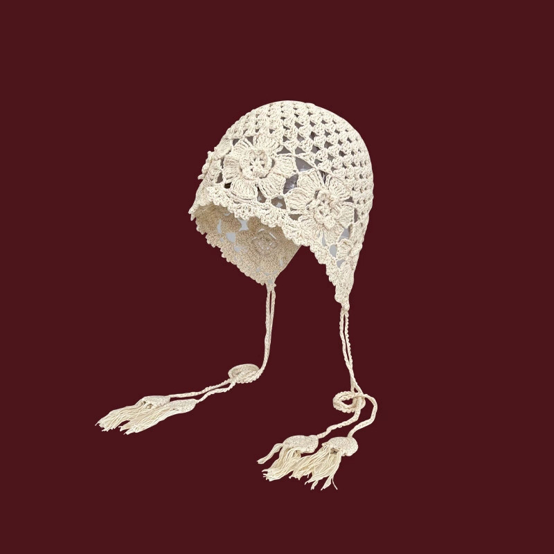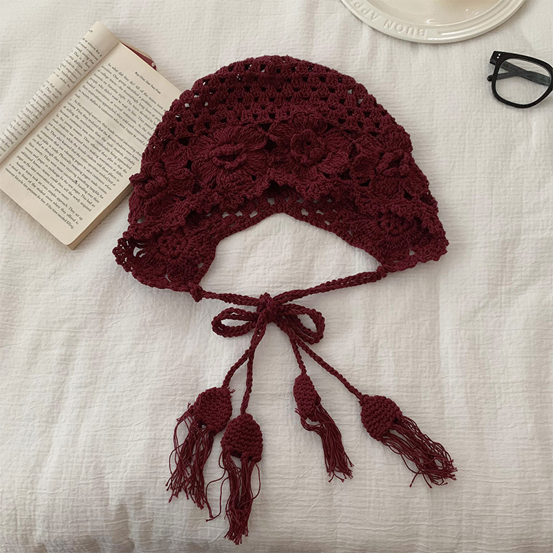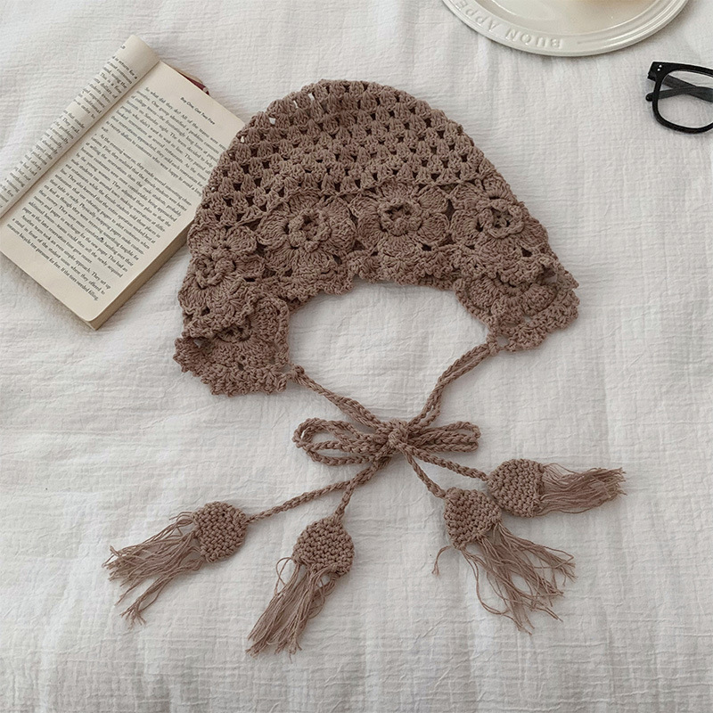 여성용 봄 여름 손으로 짠 중공 바오터우 모자, 뜨개질 민족 스타일 술 스트랩 풀오버 니트 모자, 다용도
