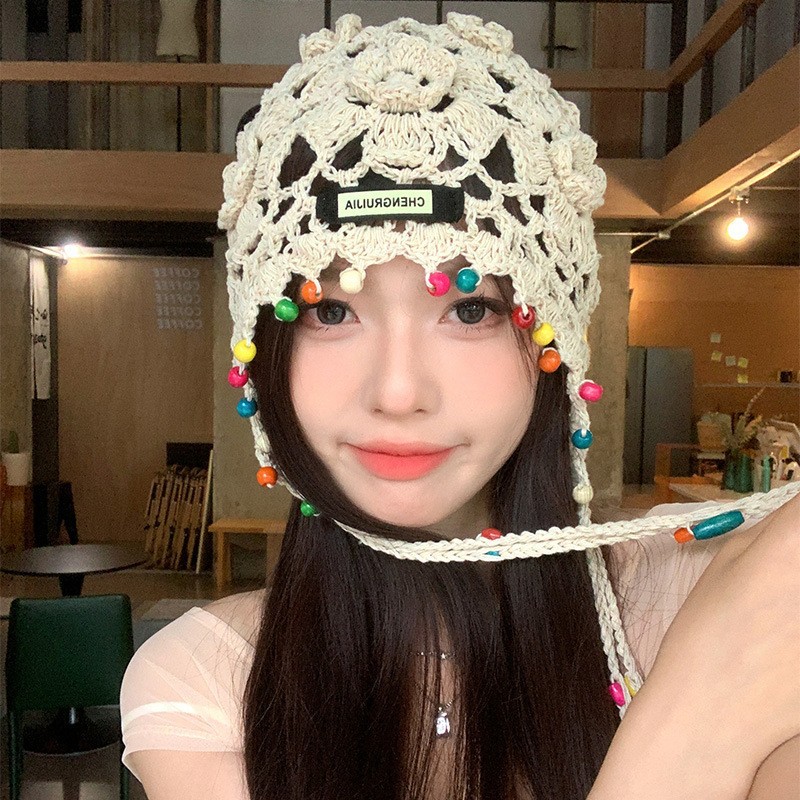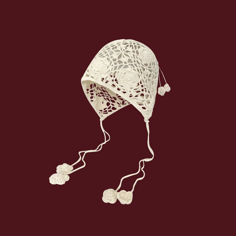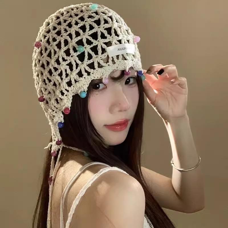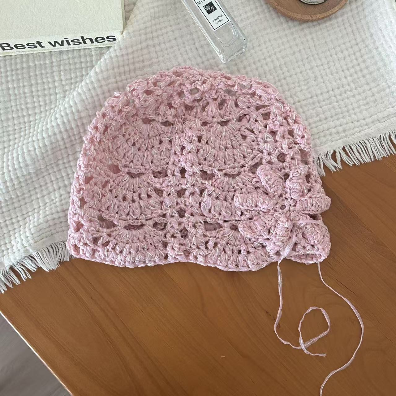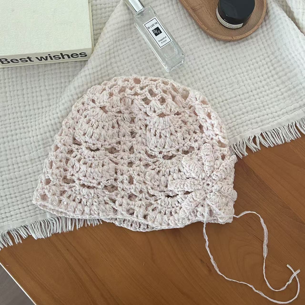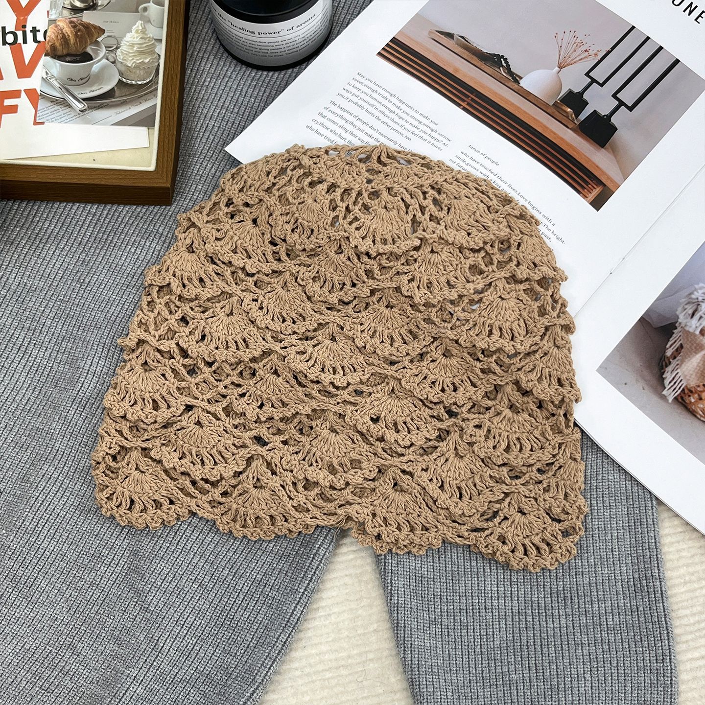 여성용 봄 여름 손으로 짠 중공 바오터우 모자, 뜨개질 민족 스타일 술 스트랩 풀오버 니트 모자, 다용도