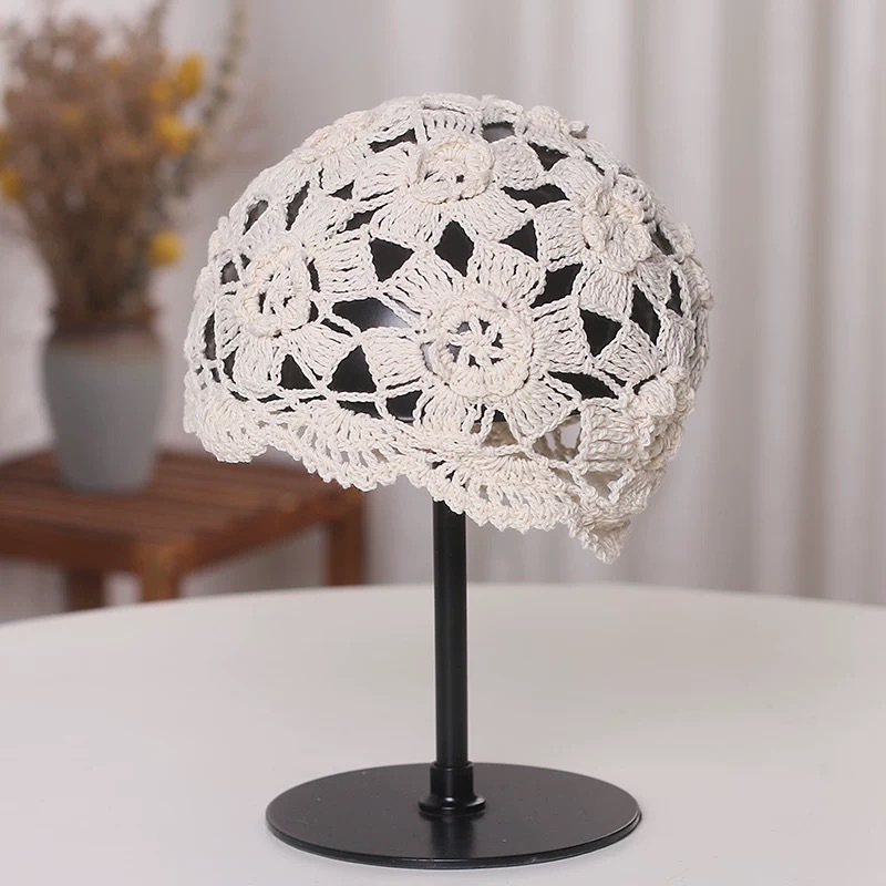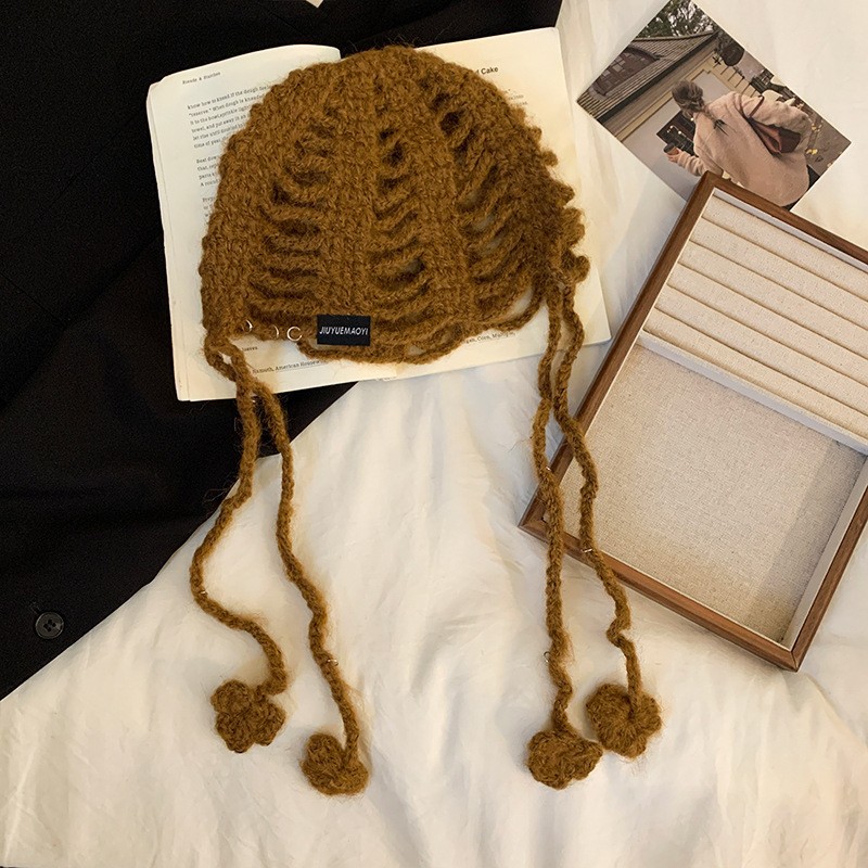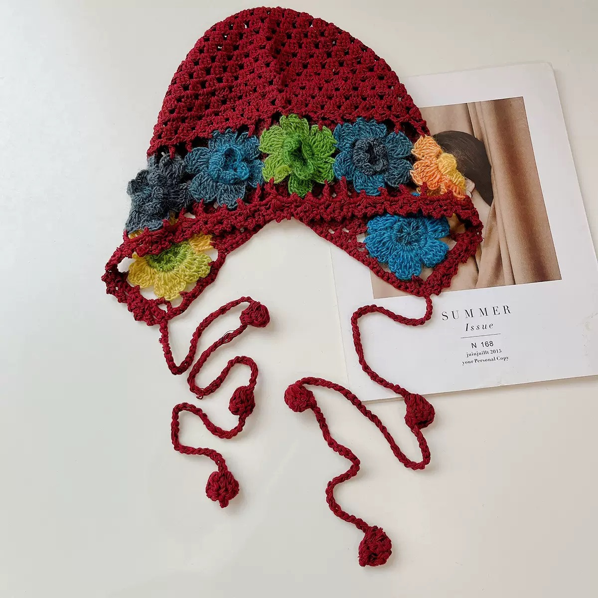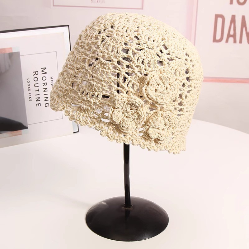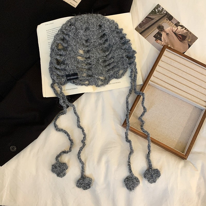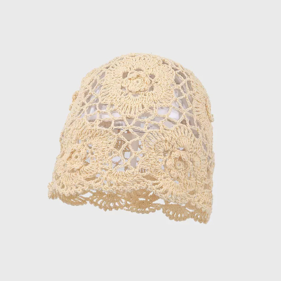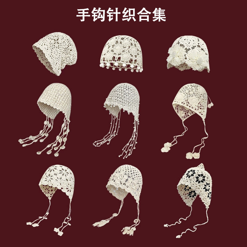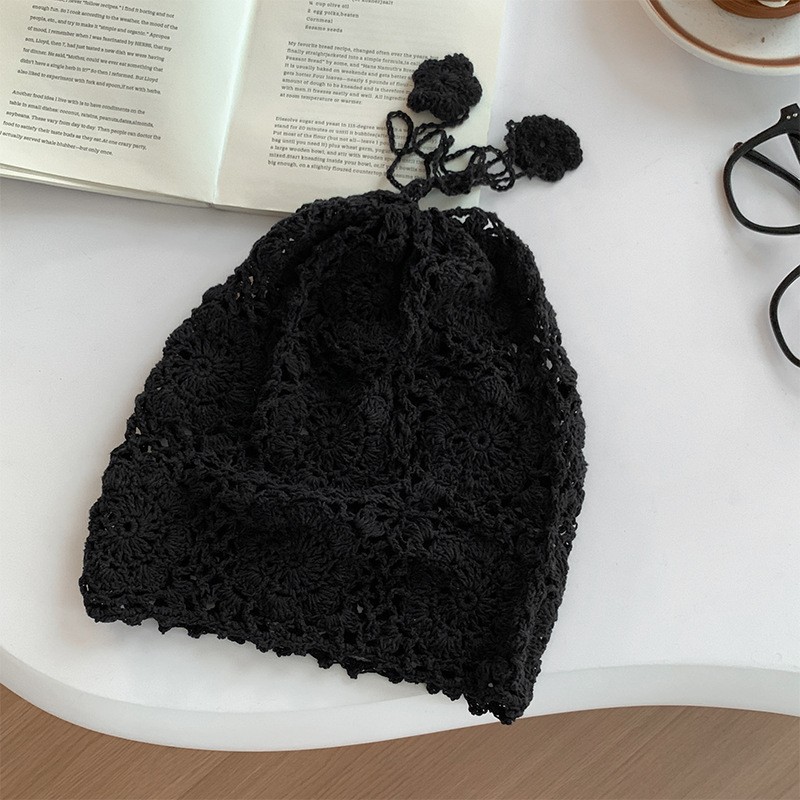 여성용 봄 여름 손으로 짠 중공 바오터우 모자, 뜨개질 민족 스타일 술 스트랩 풀오버 니트 모자, 다용도