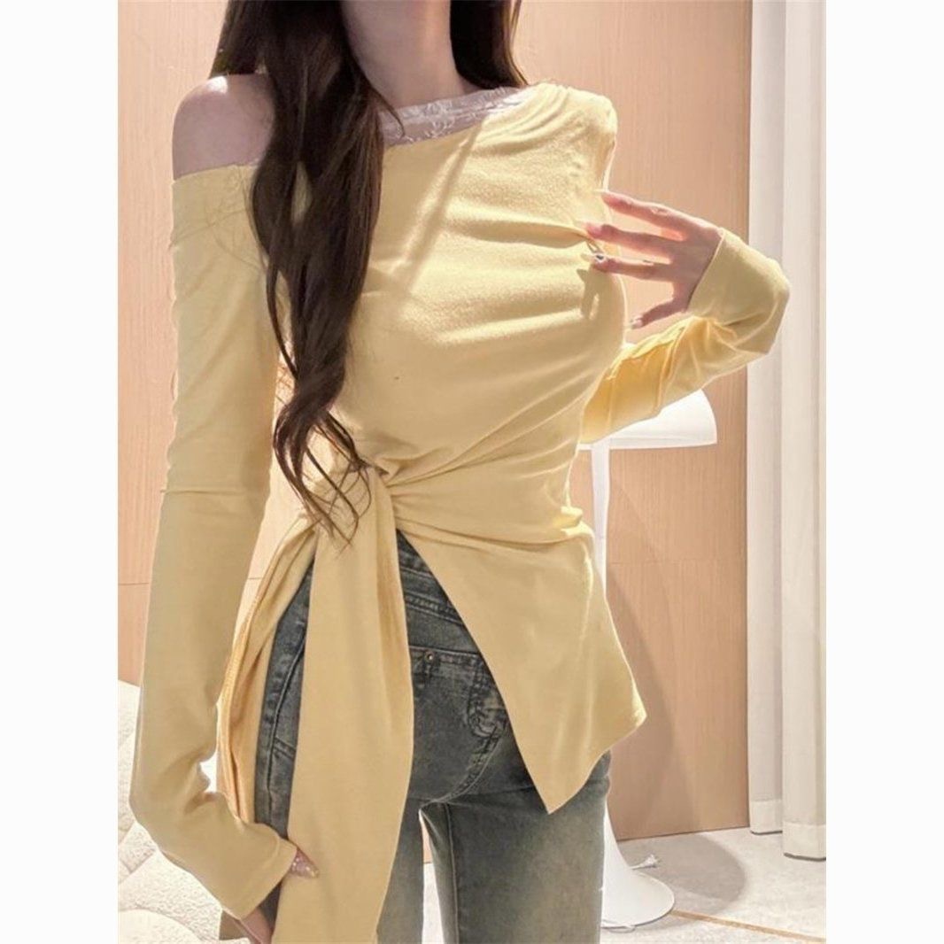 순수 셔츠 여성의 새로운 스타일 오프 숄더 사이드 스트랩 디자인 여성을위한 긴 소매 상단과 뜨거운 소녀 슬림베이스 셔츠스토어 가기