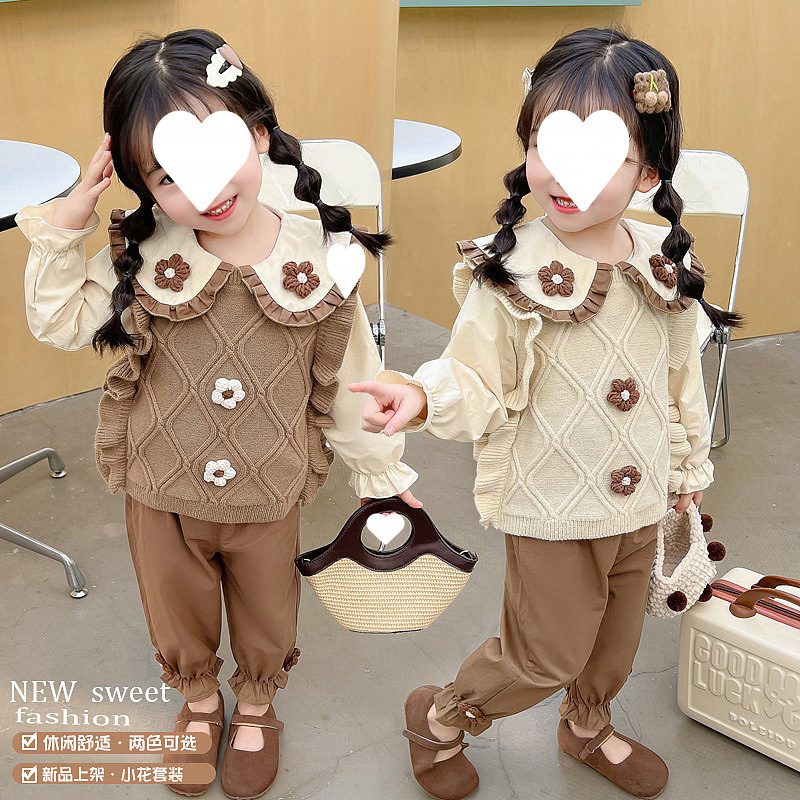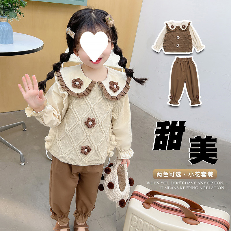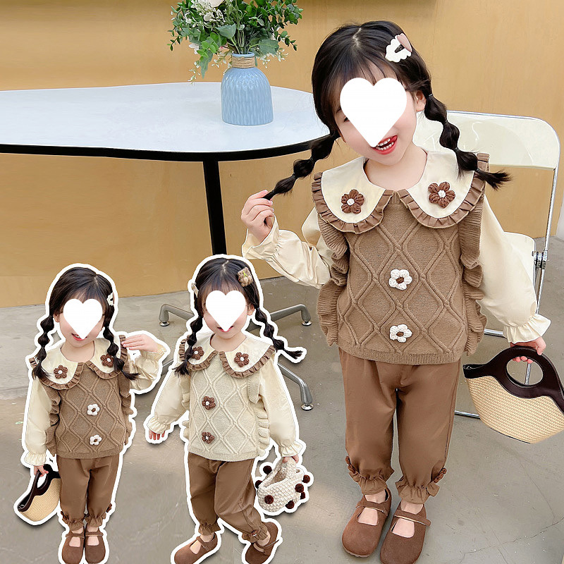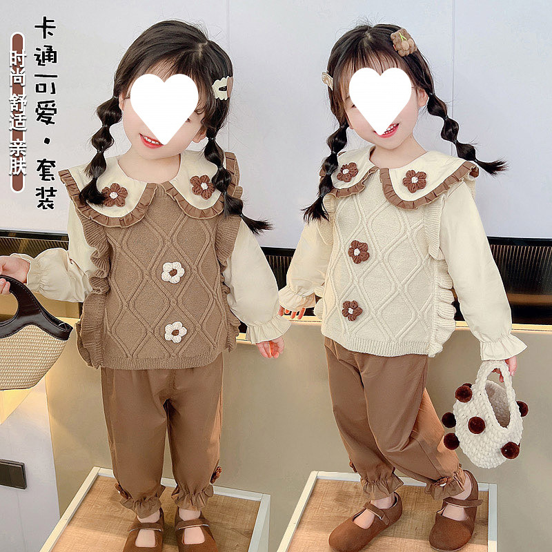 아기 소녀 봄 세트 2025 새로운 서양식 한국 어린이 봄과 가을 니트 스웨터 조끼 3 피스 트렌디스토어 가기