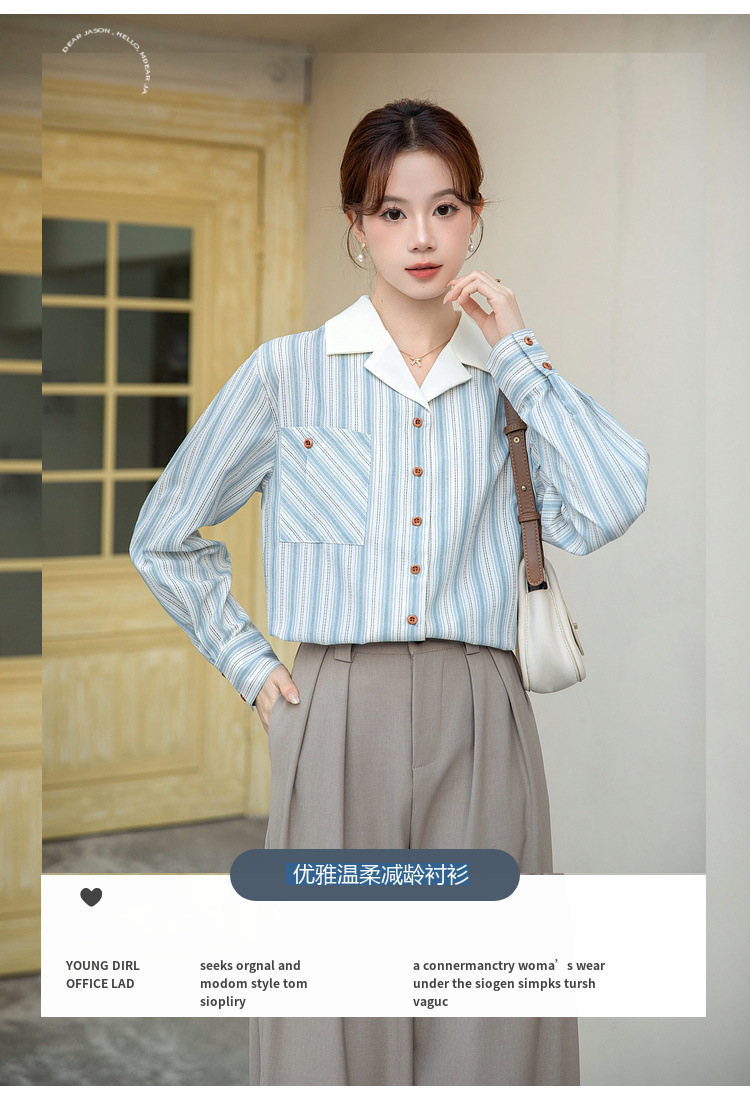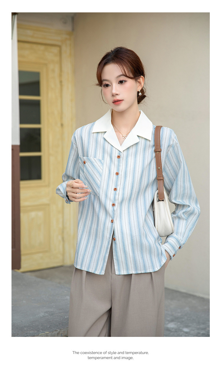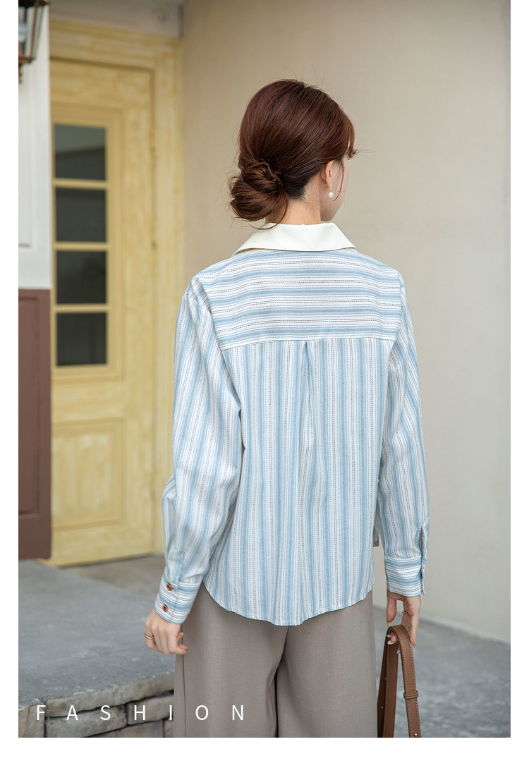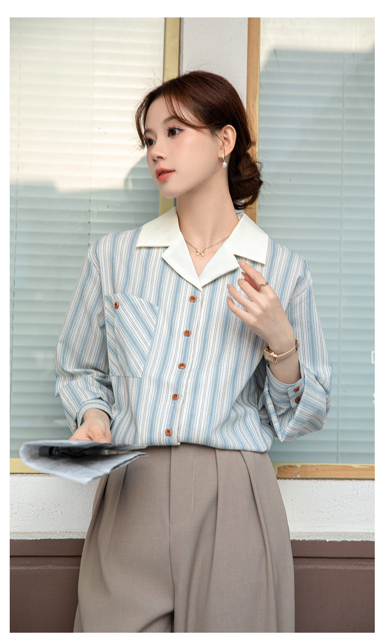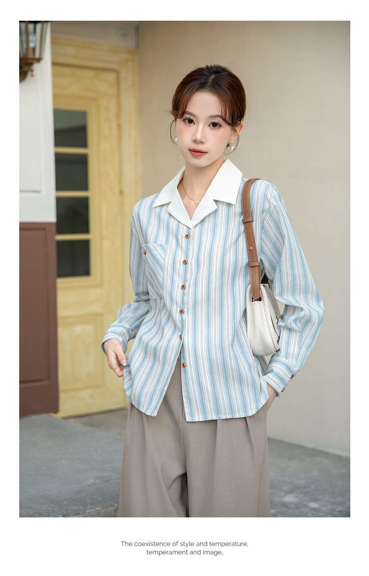 2025 년 봄 신형 통근 우아한 바느질 긴팔 디자인 느슨한 대조 색상 원피스 칼라 여성용 긴팔 줄무늬 셔츠스토어 가기