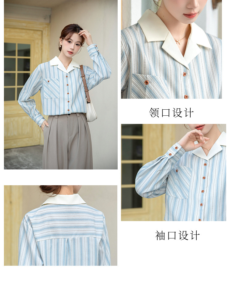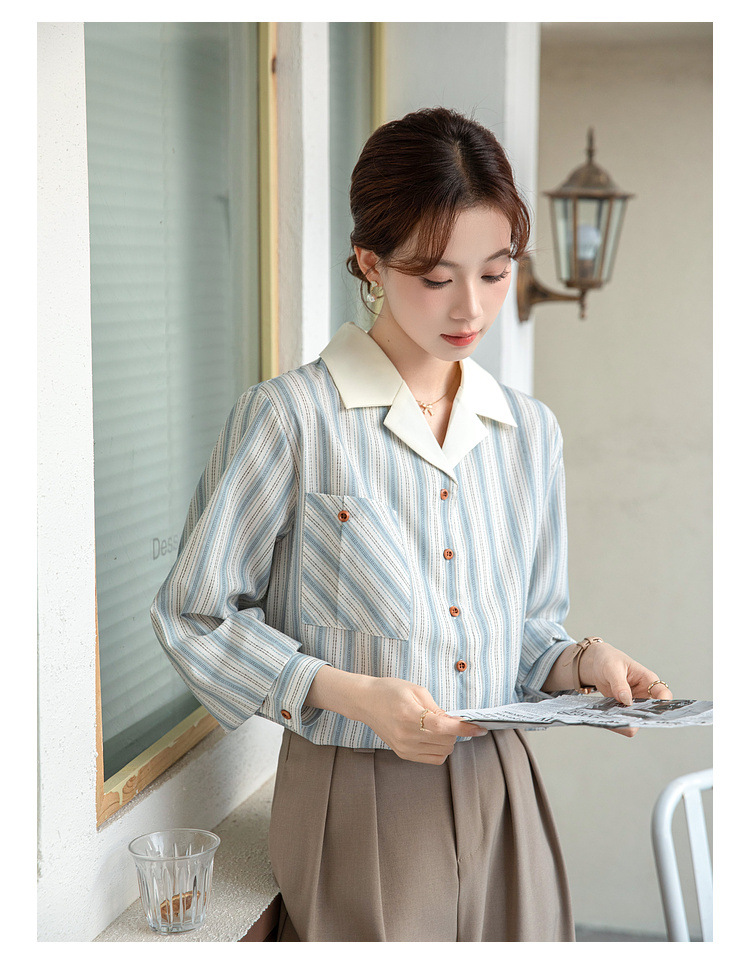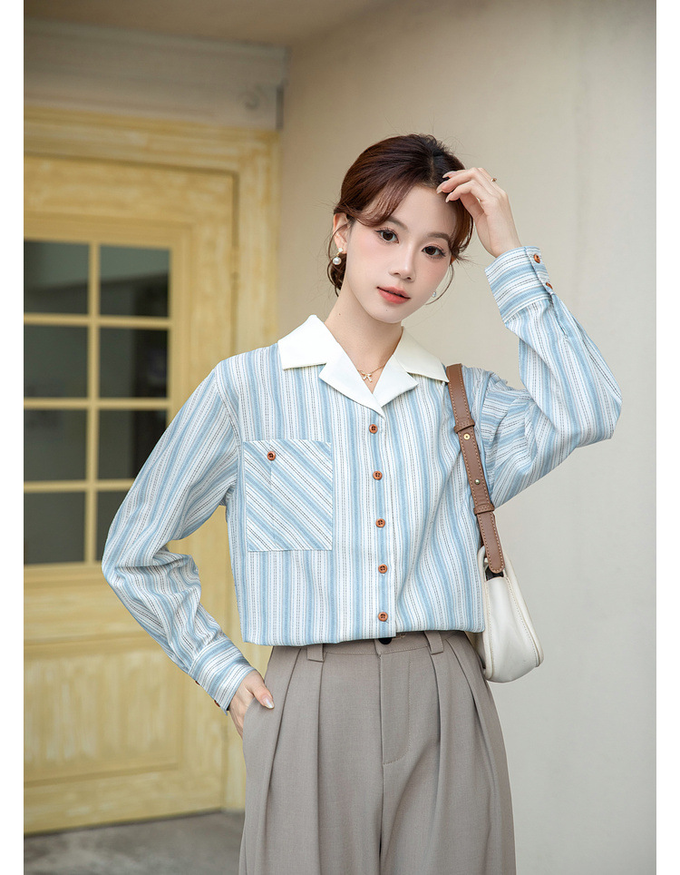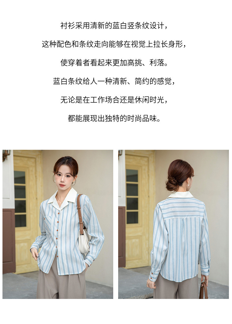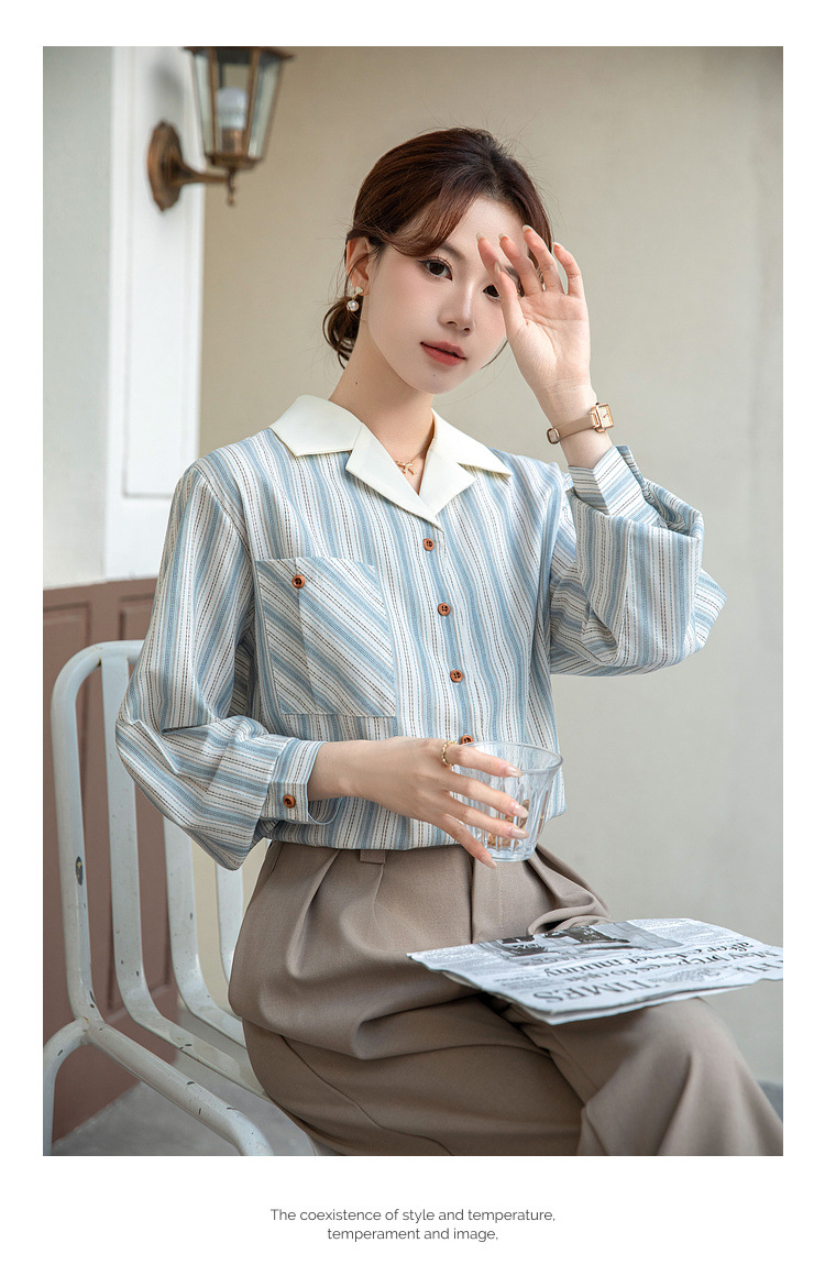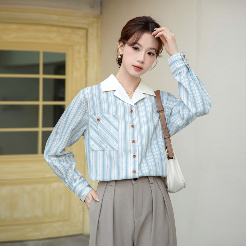 2025 년 봄 신형 통근 우아한 바느질 긴팔 디자인 느슨한 대조 색상 원피스 칼라 여성용 긴팔 줄무늬 셔츠스토어 가기