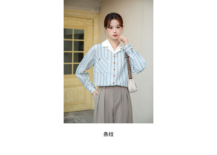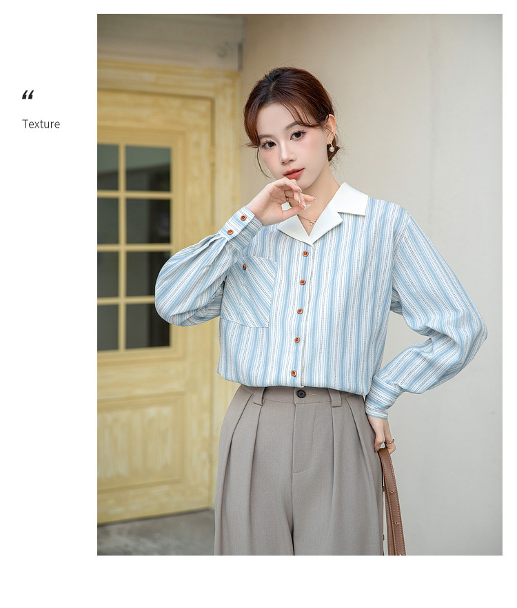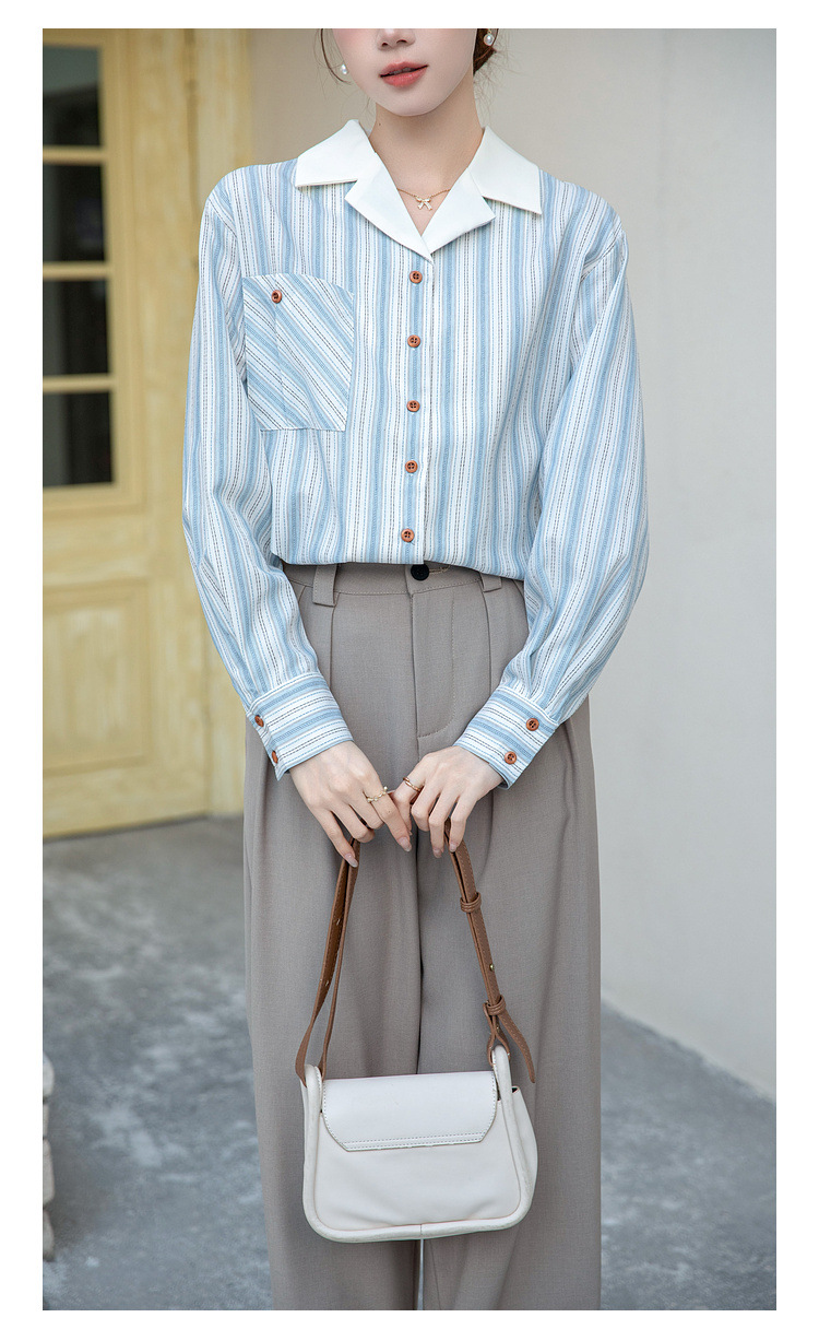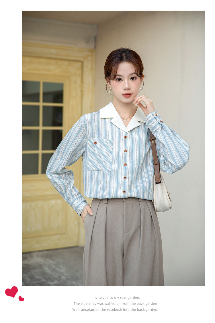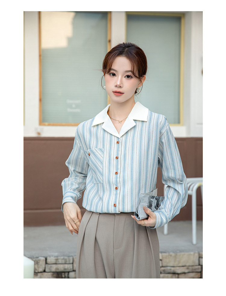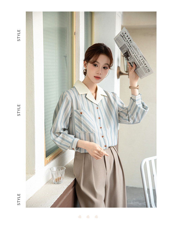 2025 년 봄 신형 통근 우아한 바느질 긴팔 디자인 느슨한 대조 색상 원피스 칼라 여성용 긴팔 줄무늬 셔츠스토어 가기