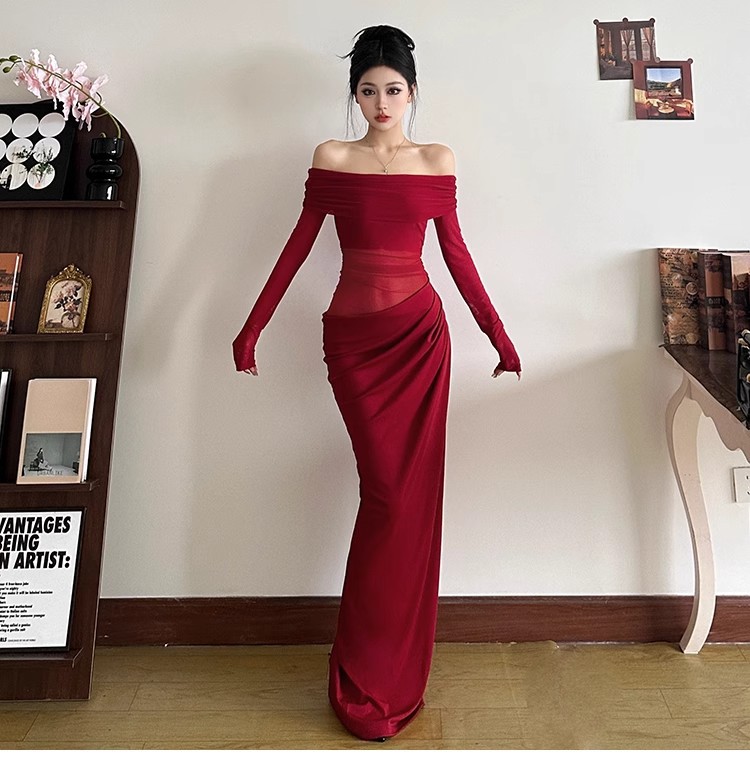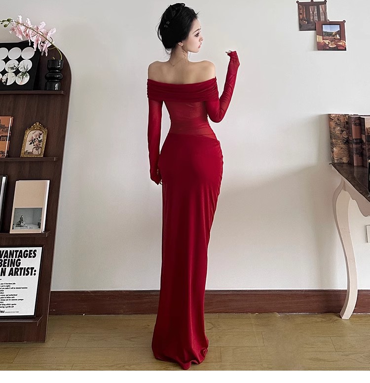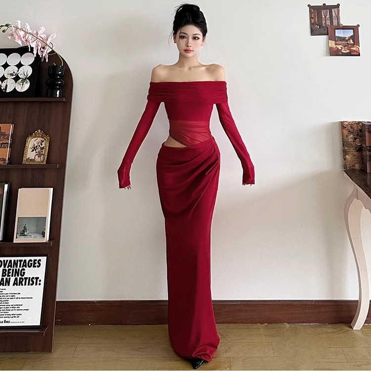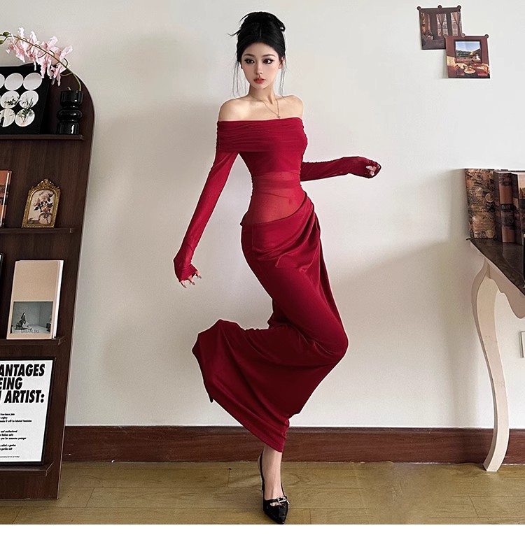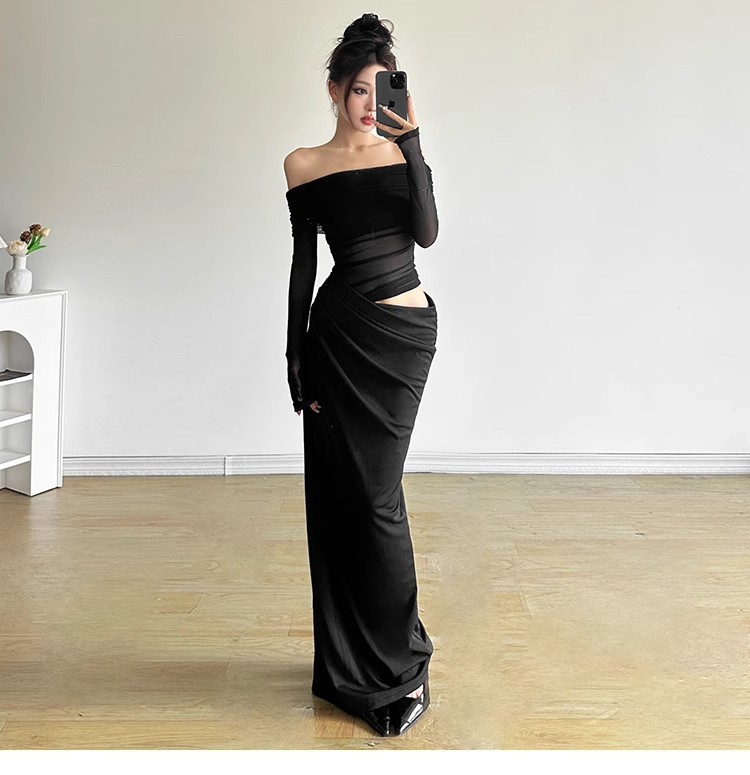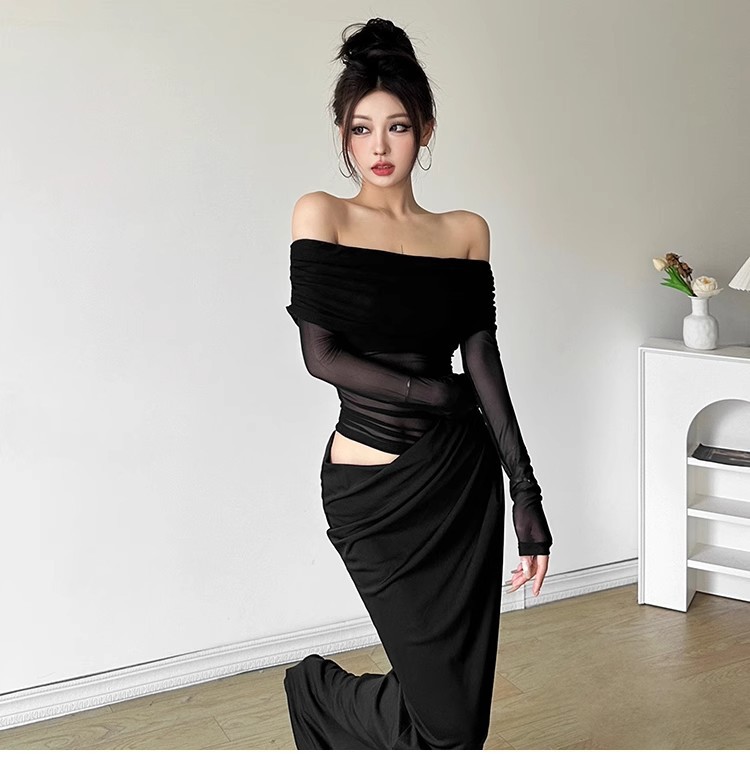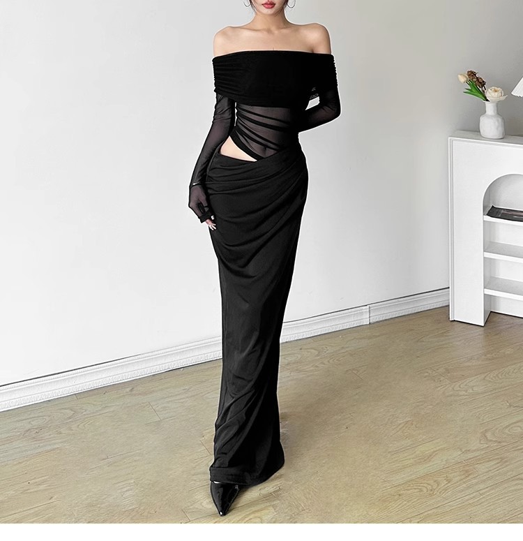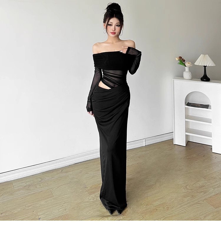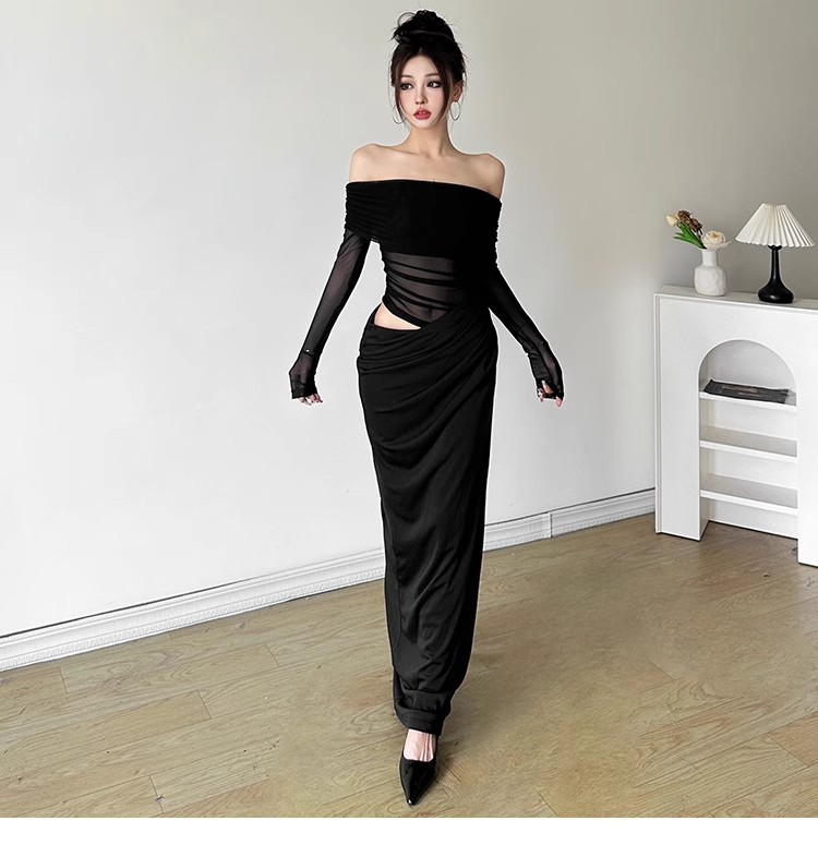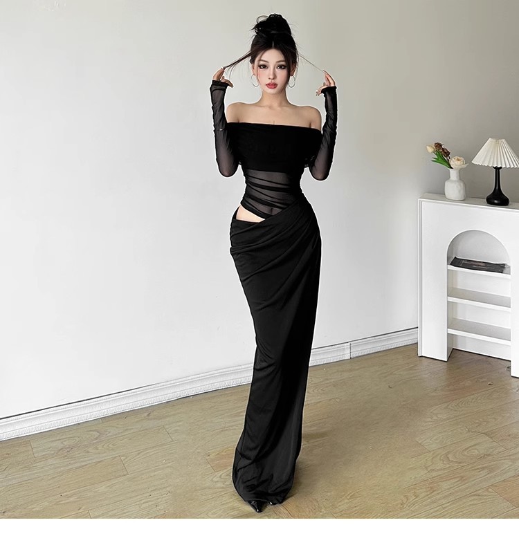 순수하고 섹시한 뜨거운 소녀 스타일 검은 메쉬 스티칭 섹시한 중공 허리 슬림 어깨 원피스 여성스토어 가기