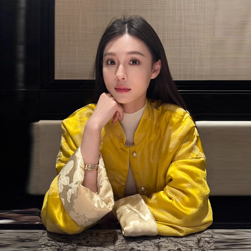 새로운 중국 스타일 국가 스타일 노란색 자카드 코트 여성의 2025 봄과 가을 새로운 하이 엔드 독특한 슈퍼 잘 생긴 탕 세트 탑스토어 가기