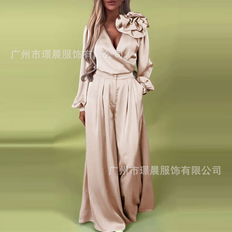 2025 봄 아마존 독립 역 대외 무역 여성 럭셔리 우아한 V 넥 새틴 긴 소매 탑 넓은 다리 바지 세트