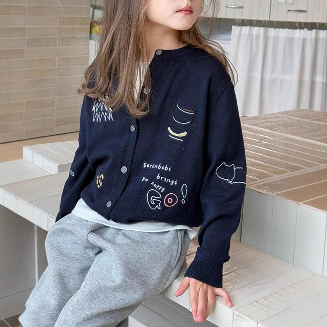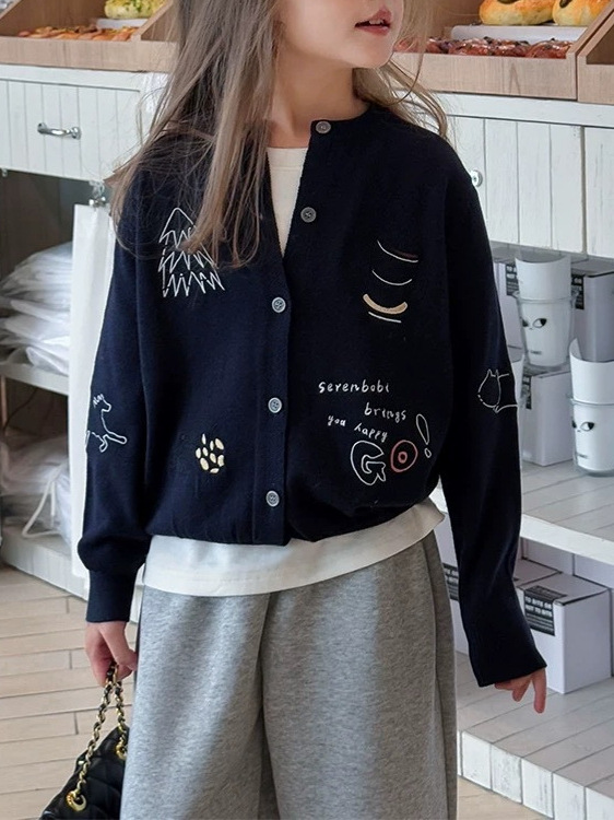 소녀 스웨터 카디건 재킷 봄 2025 새로운 한국식 어린이 레트로 올매치 소녀의 스타일라인 니트 탑스토어 가기