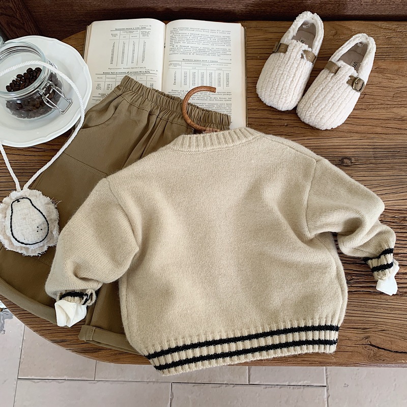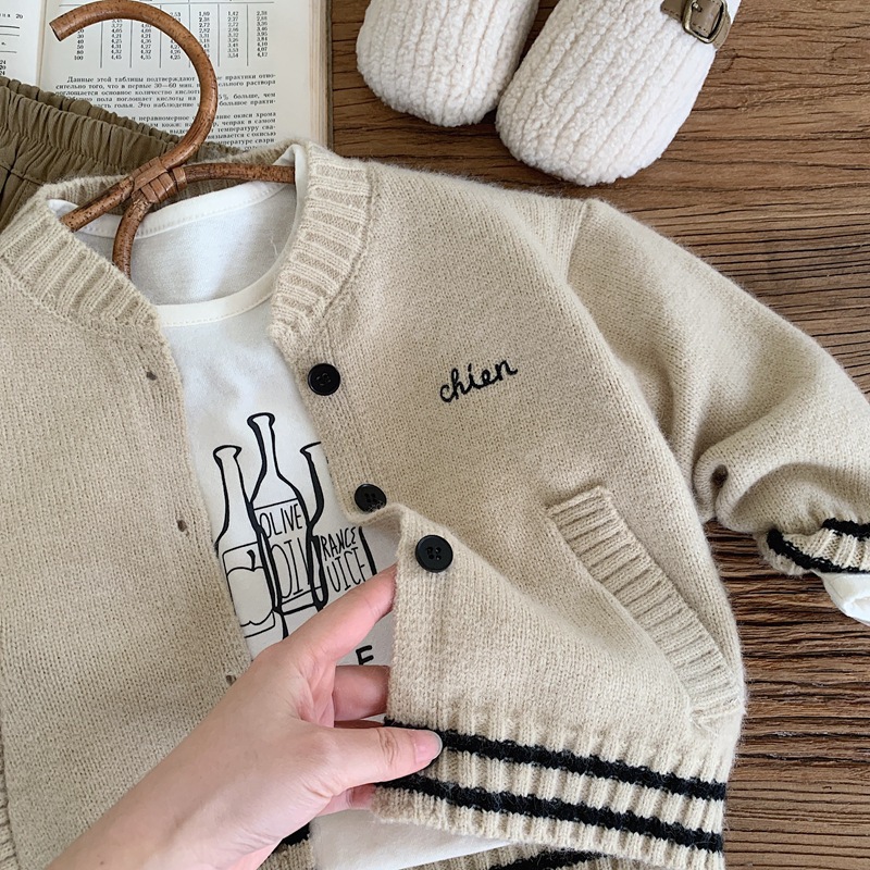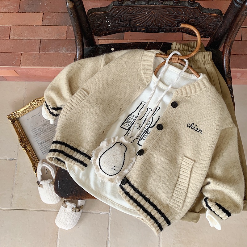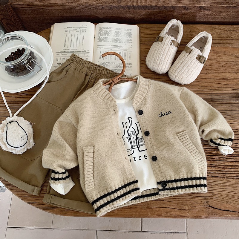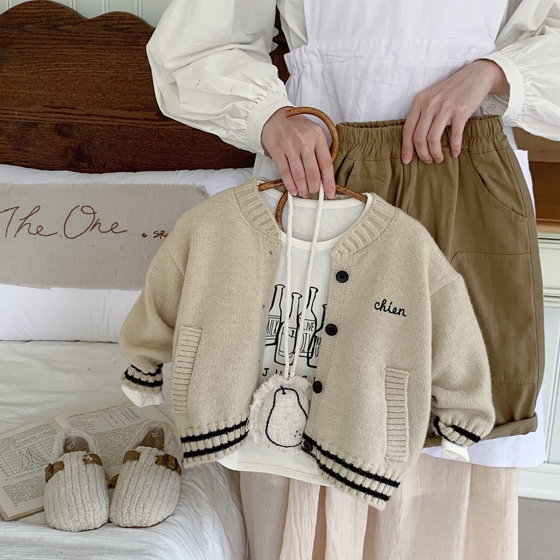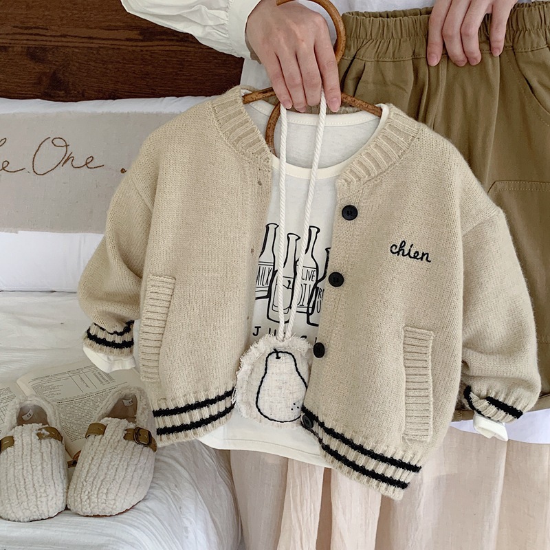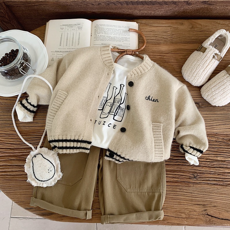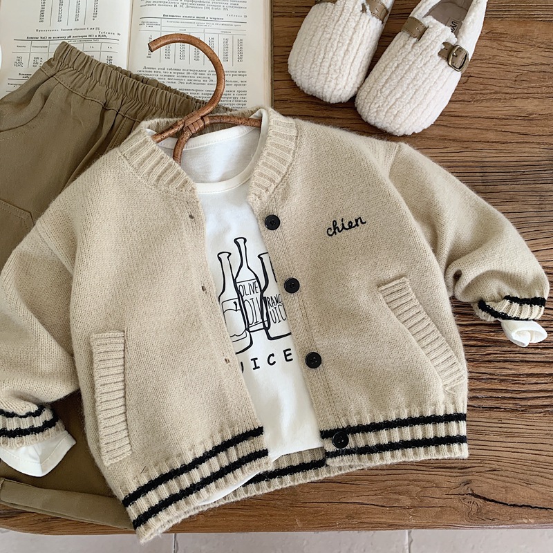 소년의 가을 니트 카디건 2024 새로운 어린이 스웨터 코트 가을과 겨울 스웨터 베이지 색 수제스토어 가기