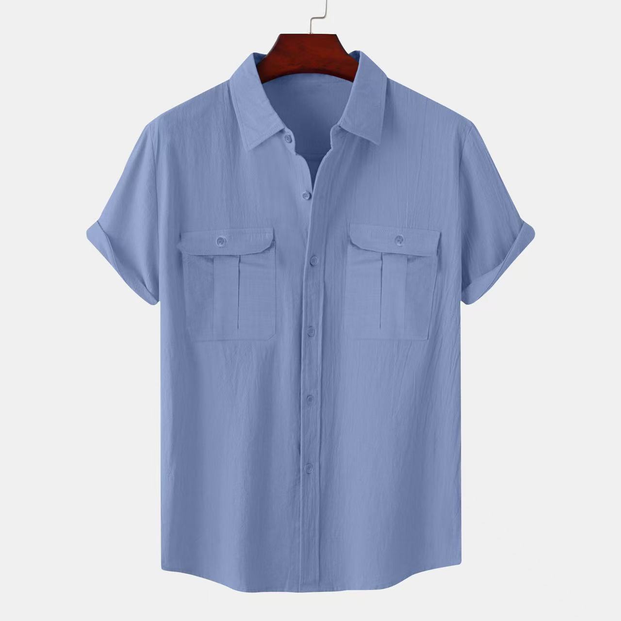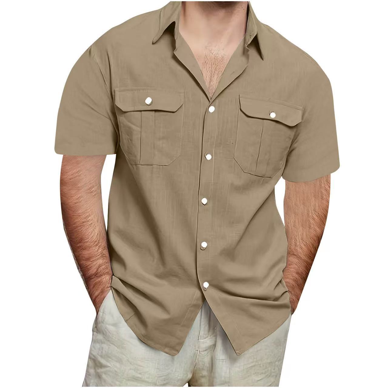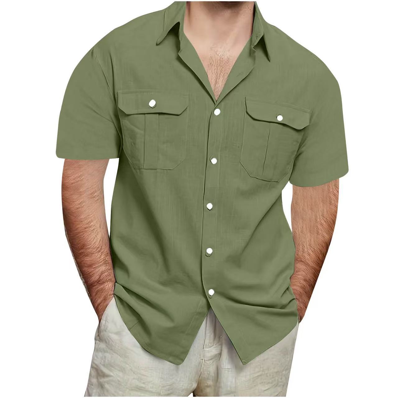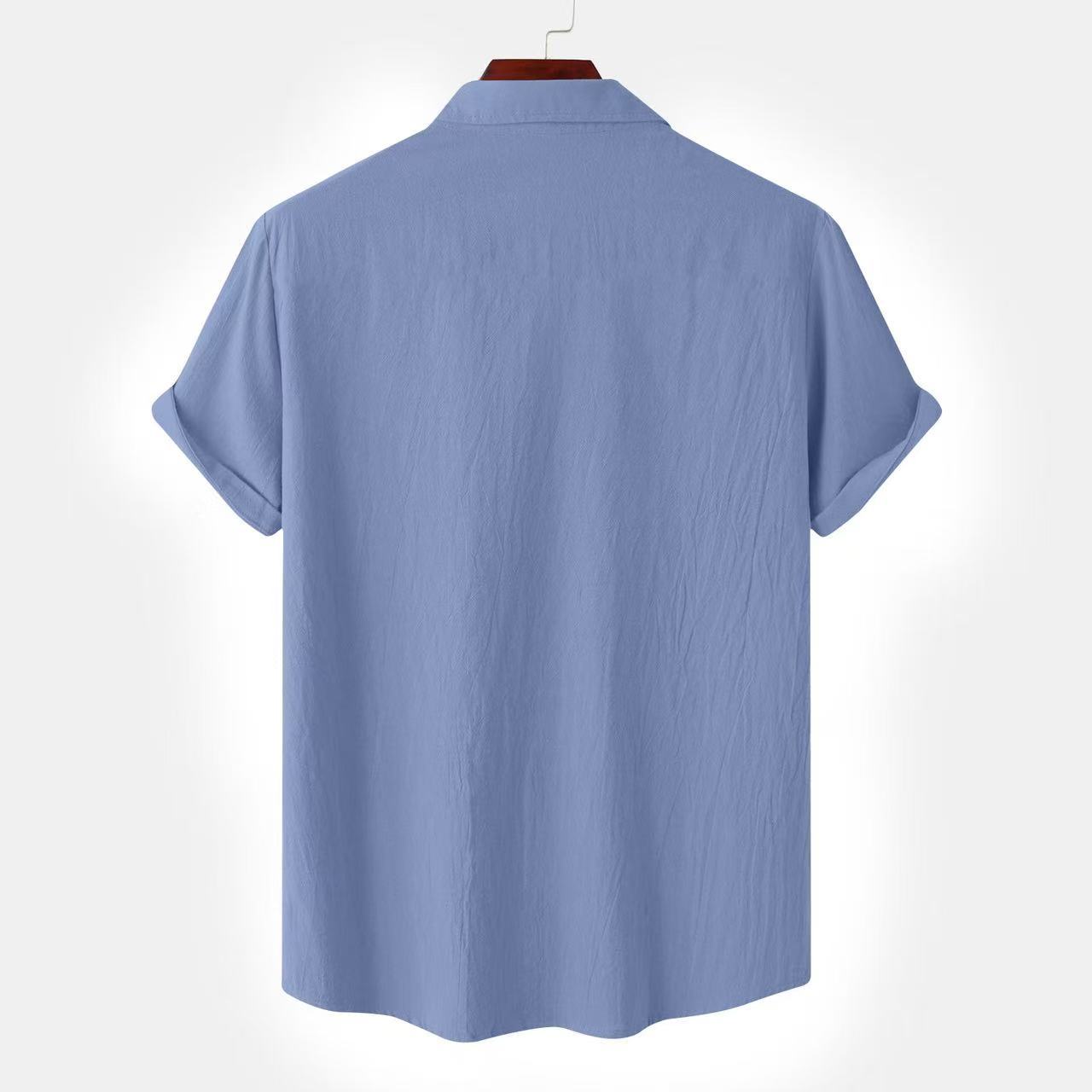 크로스 보더 AliExpress EBAY 유럽과 미국 남성 셔츠 더블 포켓 코튼 리넨 짧은 소매 셔츠 캐주얼 휴가 셔츠 8 색스토어 가기