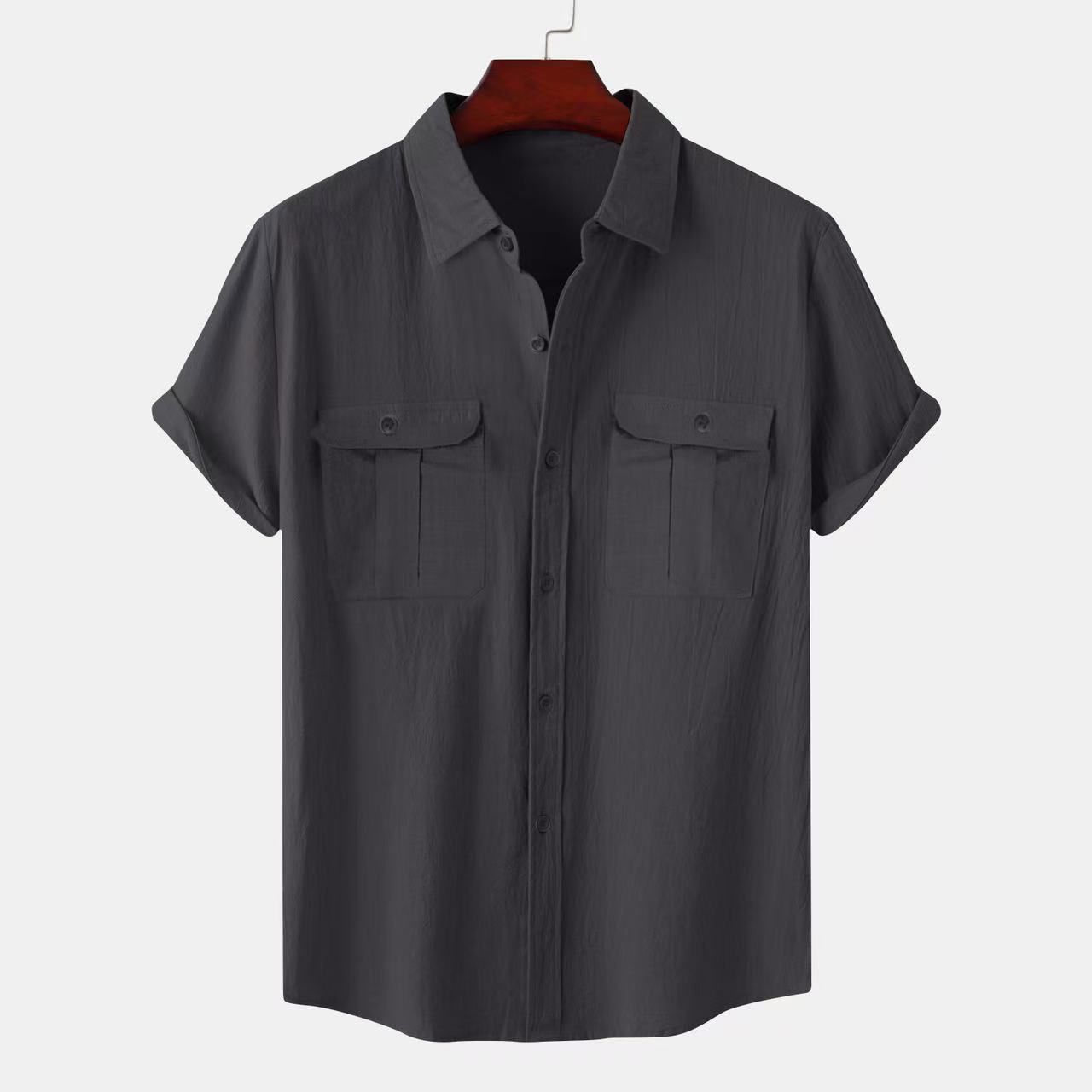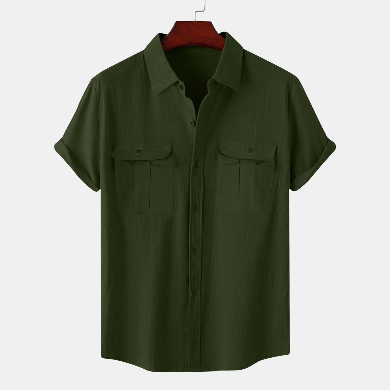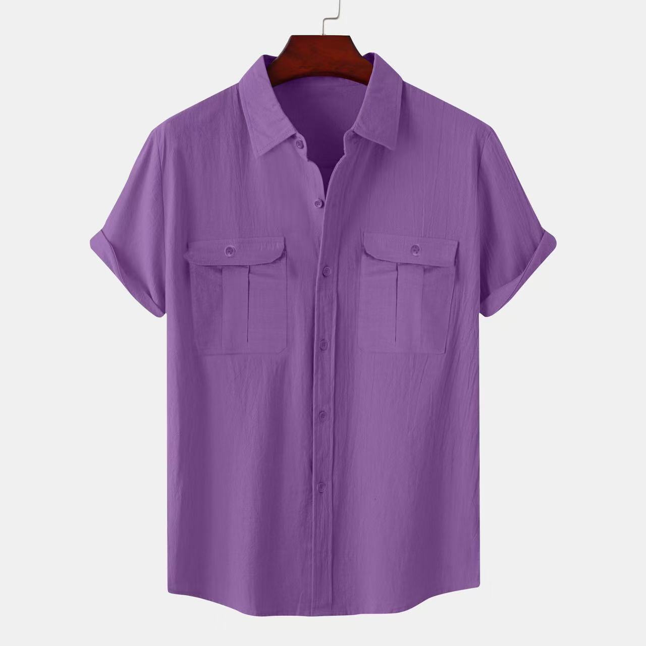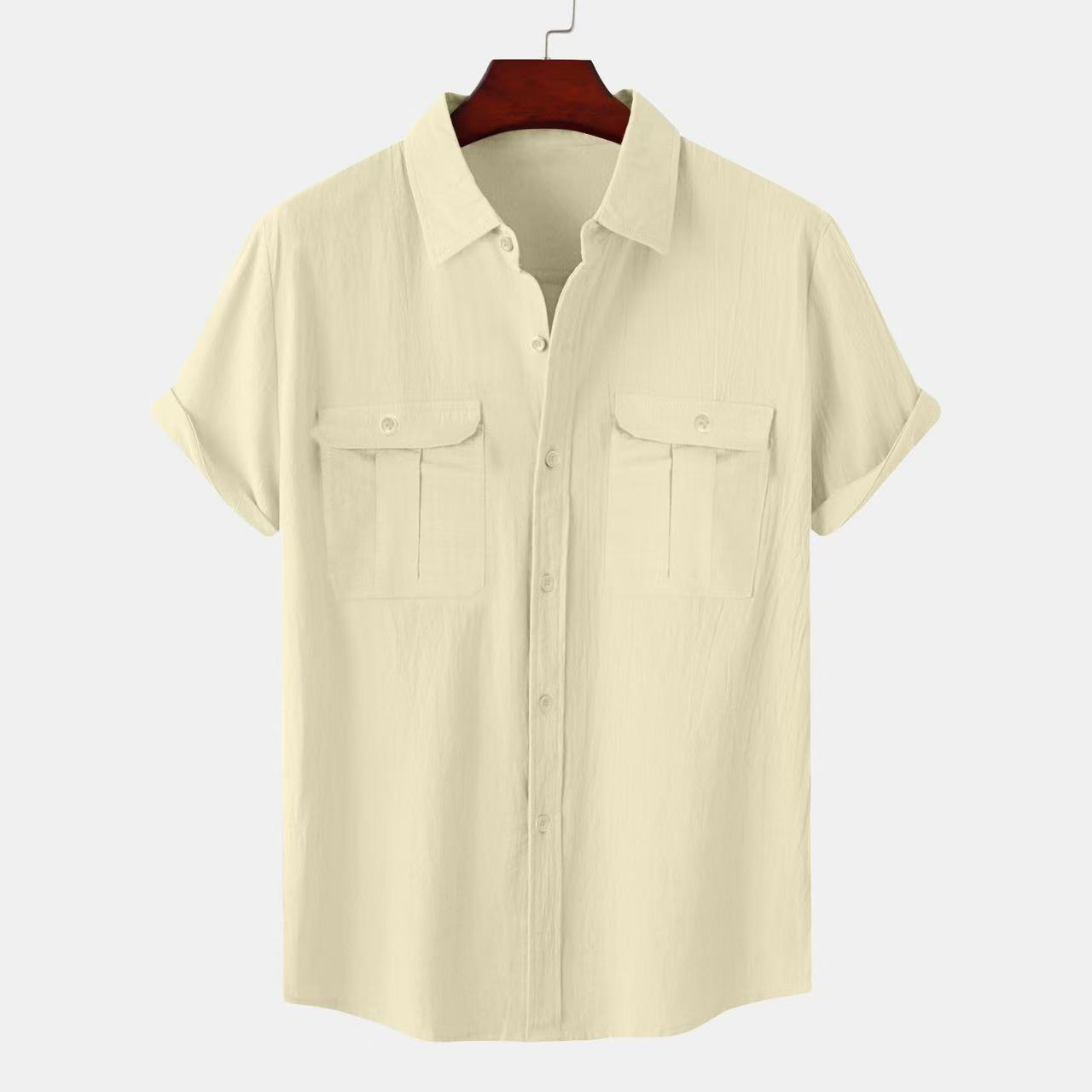 크로스 보더 AliExpress EBAY 유럽과 미국 남성 셔츠 더블 포켓 코튼 리넨 짧은 소매 셔츠 캐주얼 휴가 셔츠 8 색스토어 가기