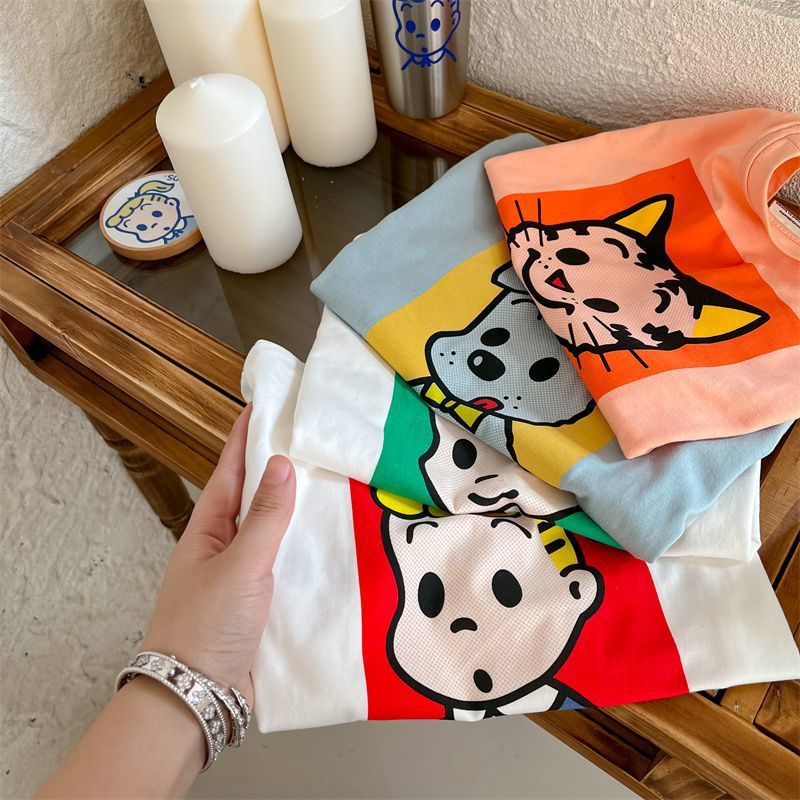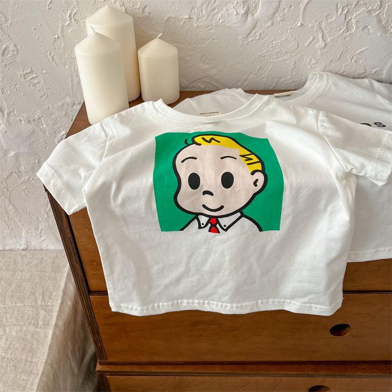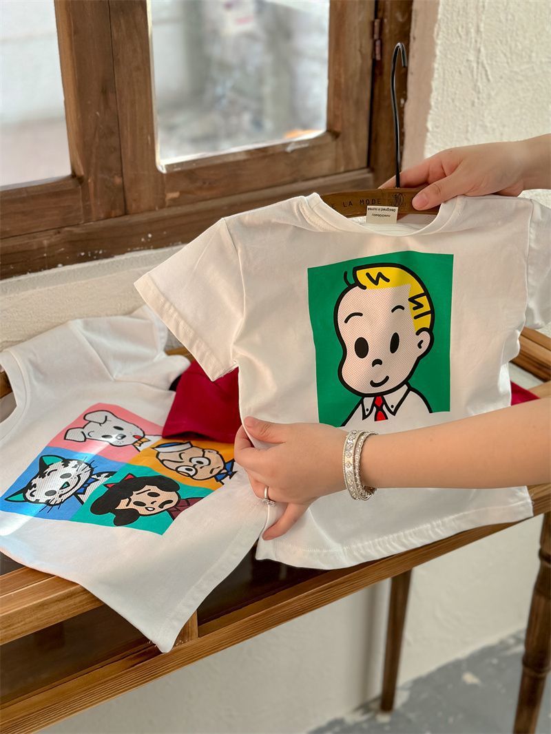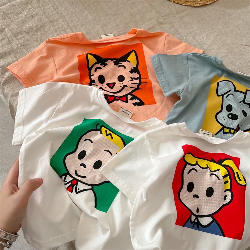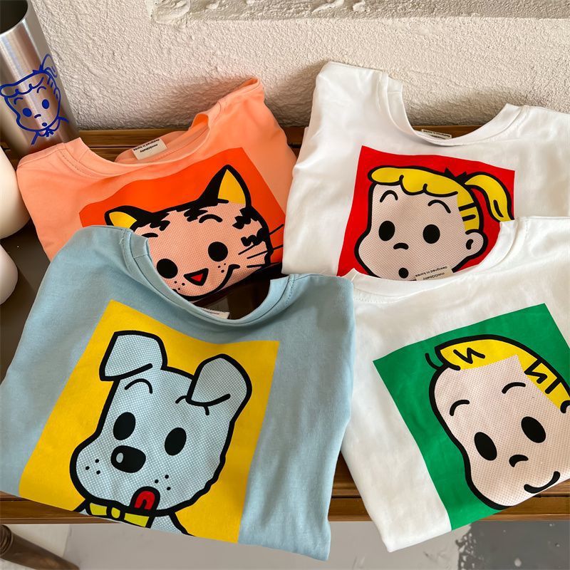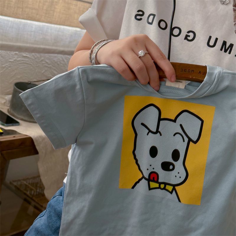 어린이 만화 반팔 티셔츠 여름 2023 소년 여름 반소매 탑 아기 한국식 블루 티셔츠 트렌디스토어 가기