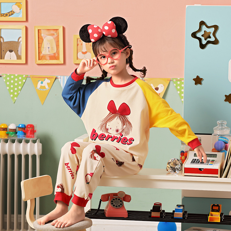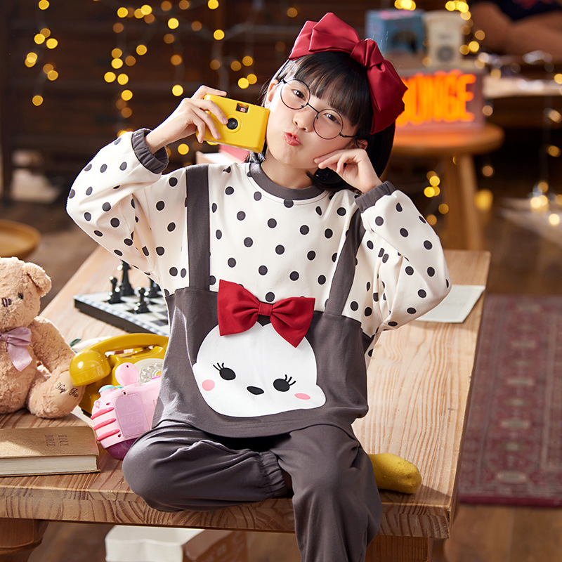 중년 및 대형 어린이와 소녀를위한 봄과 가을 느슨한 면 풀오버 홈 옷 잠옷 만화 긴 소매 바지