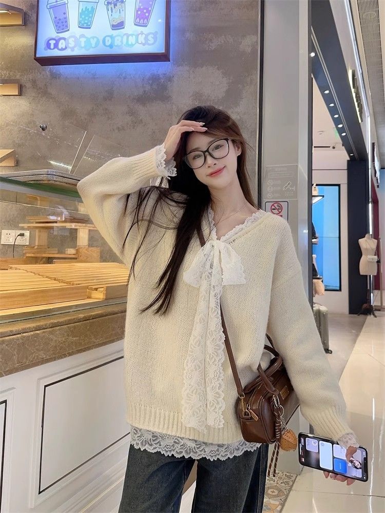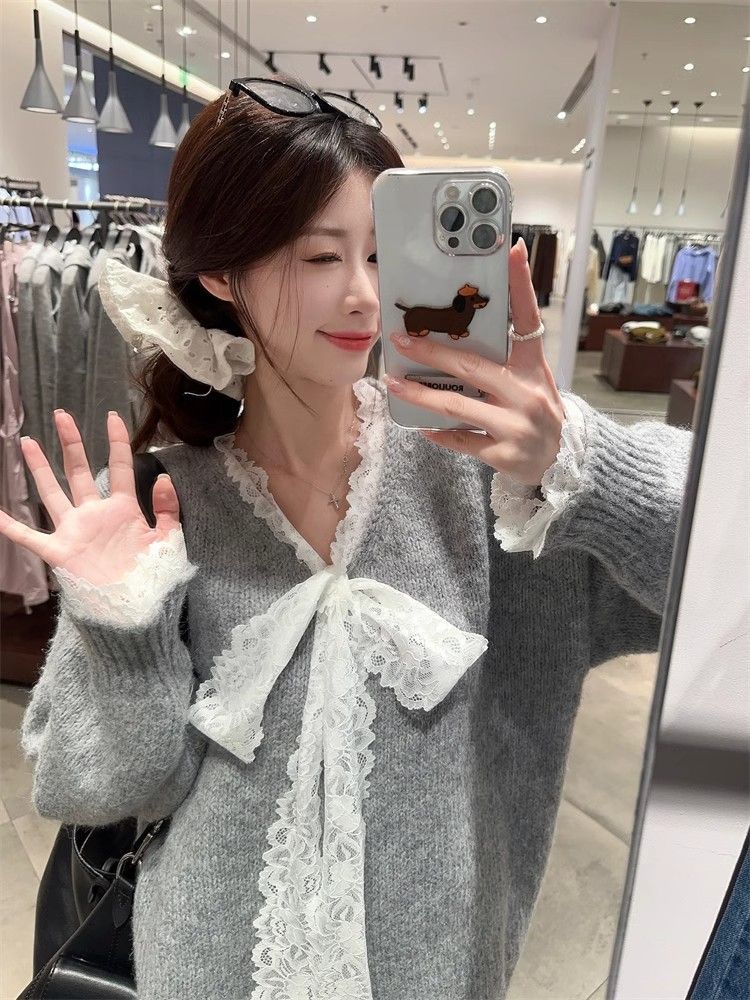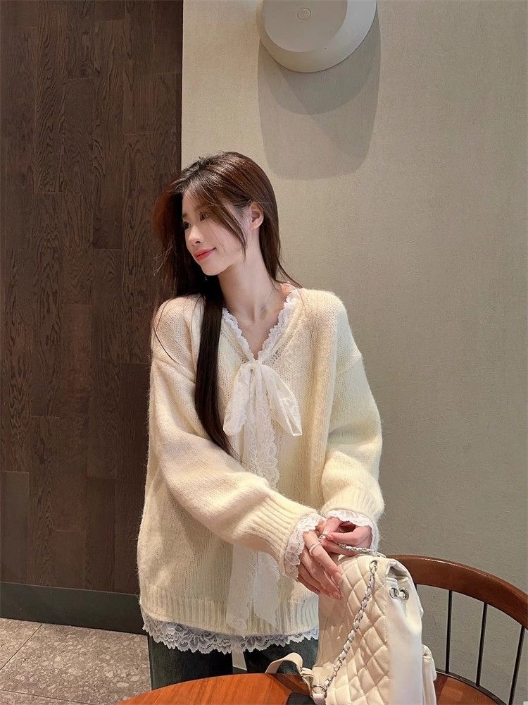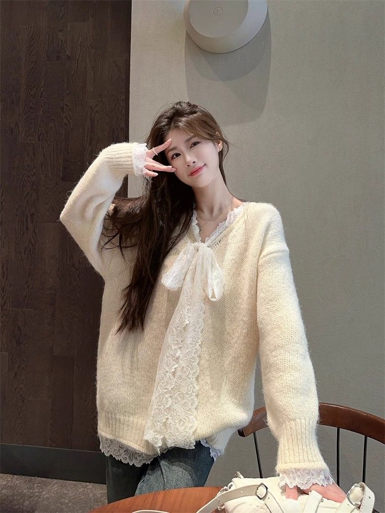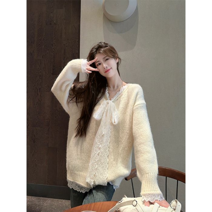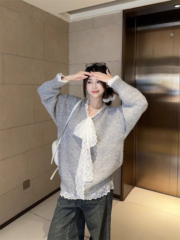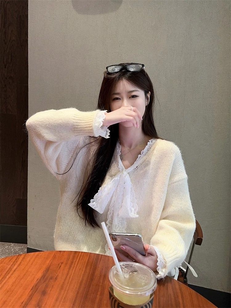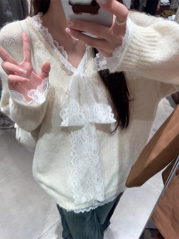 한국 스타일 레이스 활 칼라 긴 소매 니트 스웨터 가을과 겨울 디자인 감각 느슨한 탑