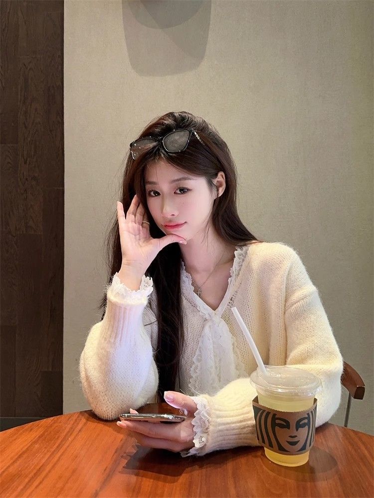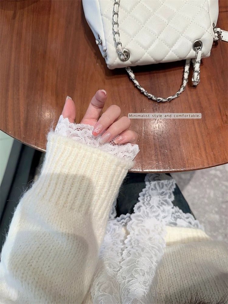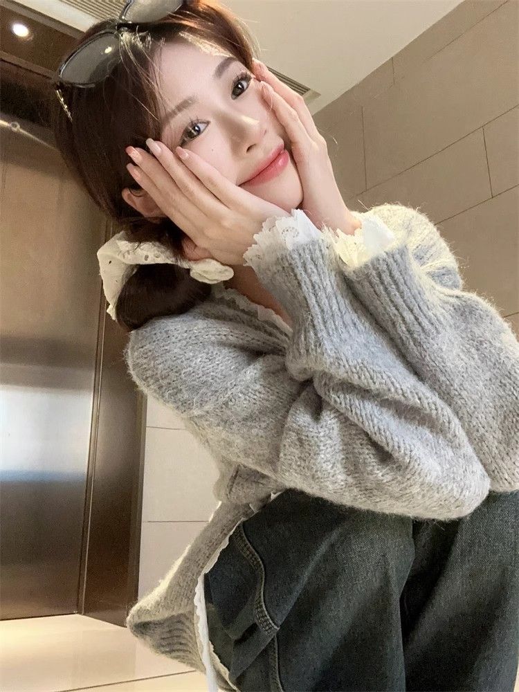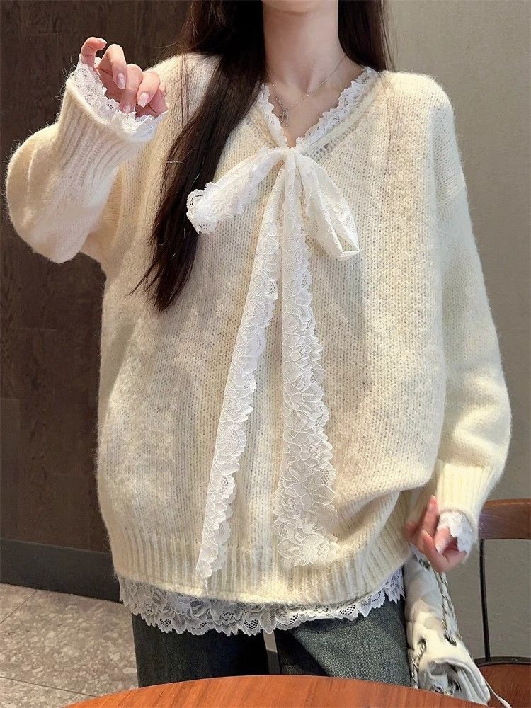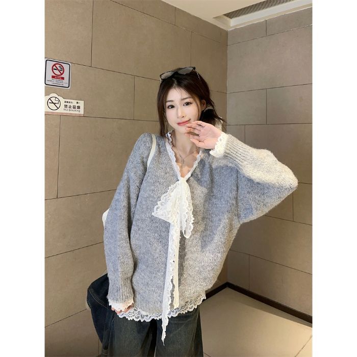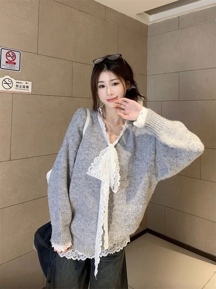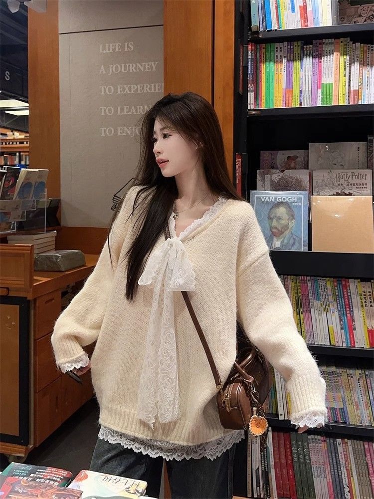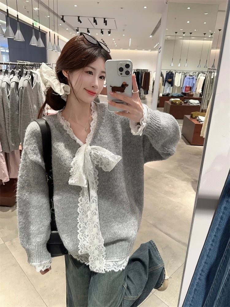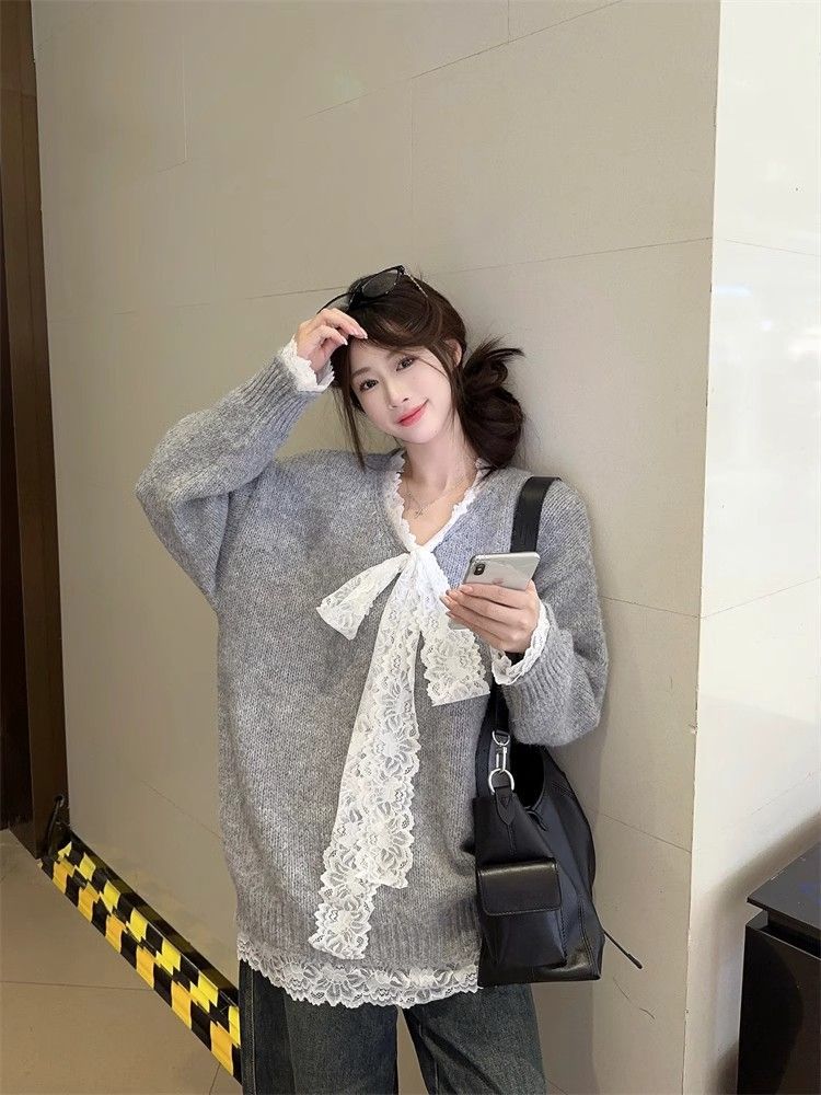 한국 스타일 레이스 활 칼라 긴 소매 니트 스웨터 가을과 겨울 디자인 감각 느슨한 탑