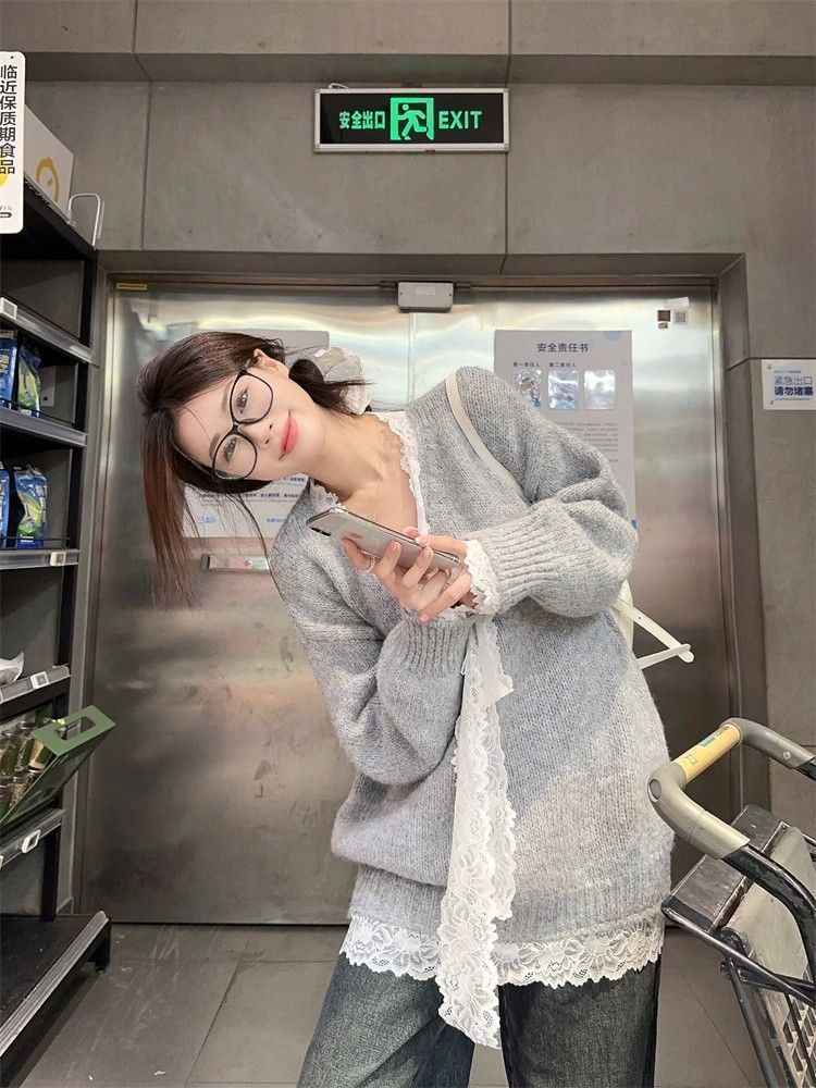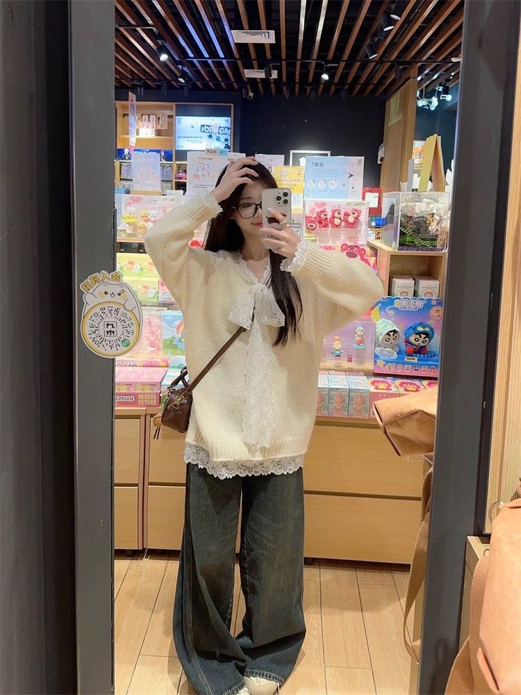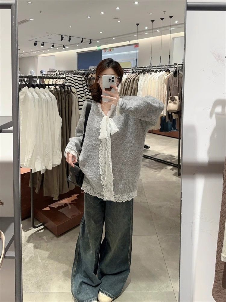 한국 스타일 레이스 활 칼라 긴 소매 니트 스웨터 가을과 겨울 디자인 감각 느슨한 탑스토어 가기