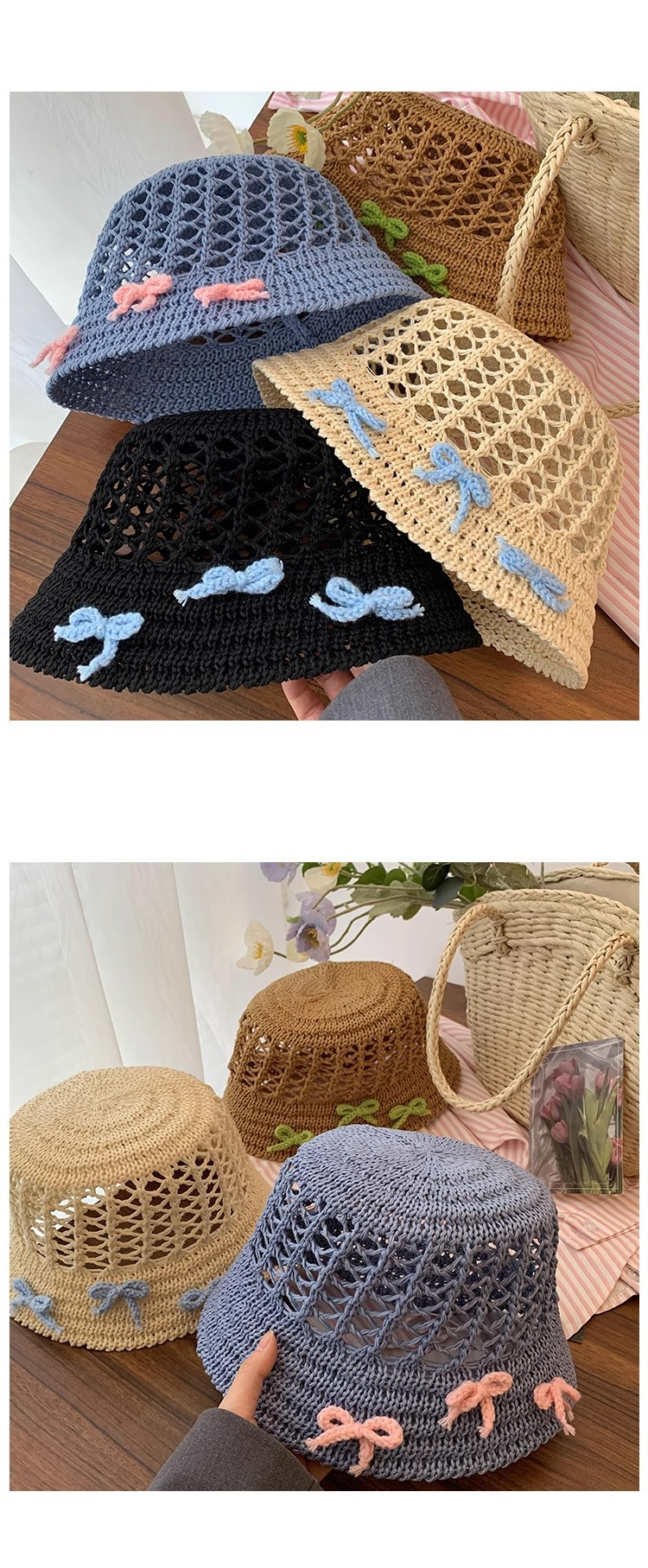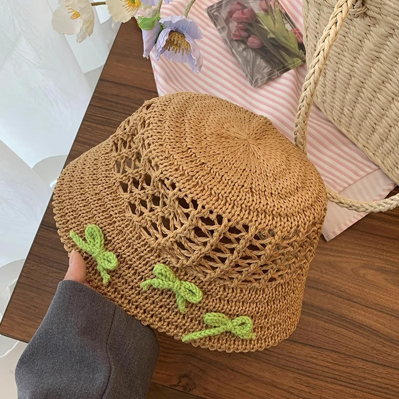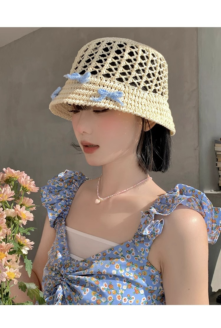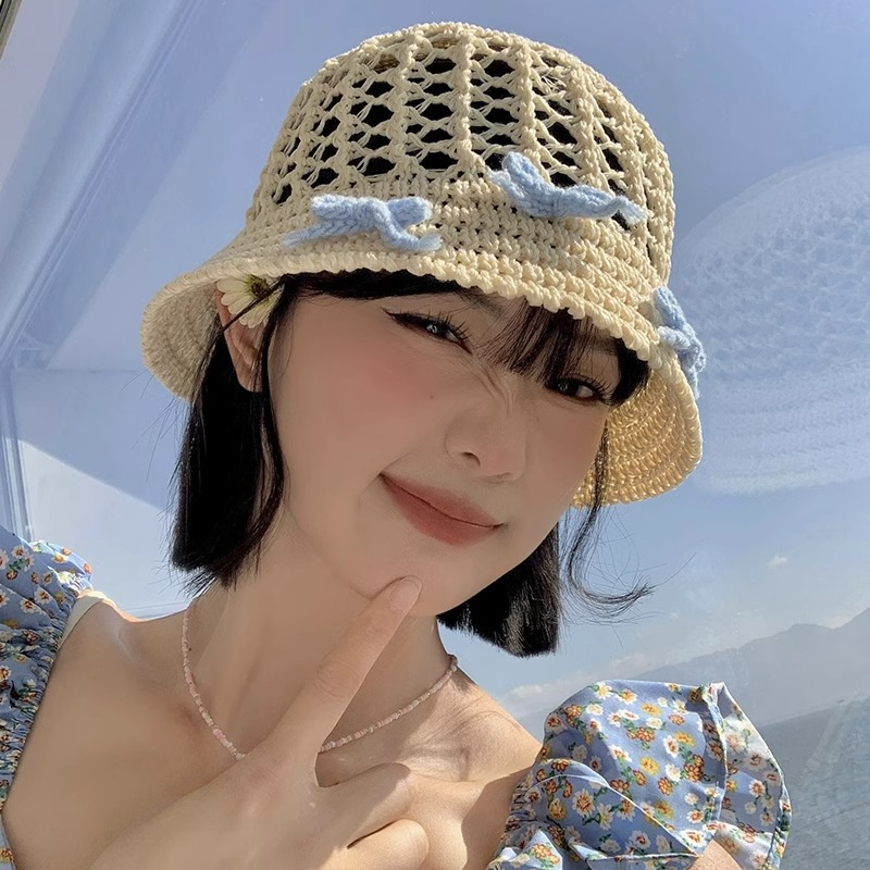 프랑스 할로우 블루 활 밀짚 모자 여성의 새로운 여름 해변 모자 틈새 디자인 선 스크린 태양 모자스토어 가기
