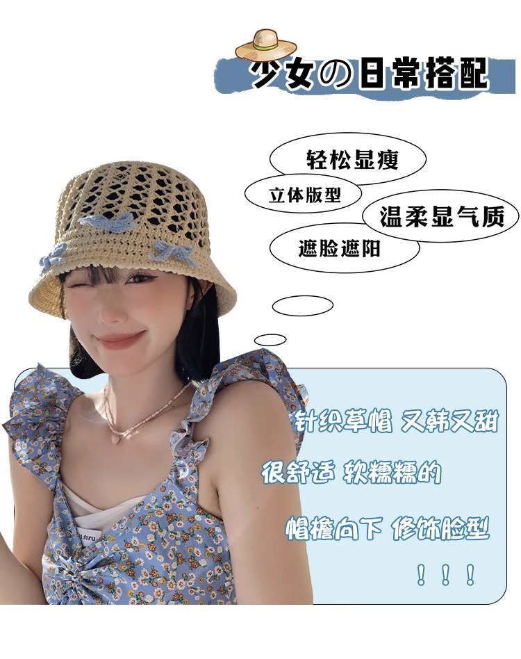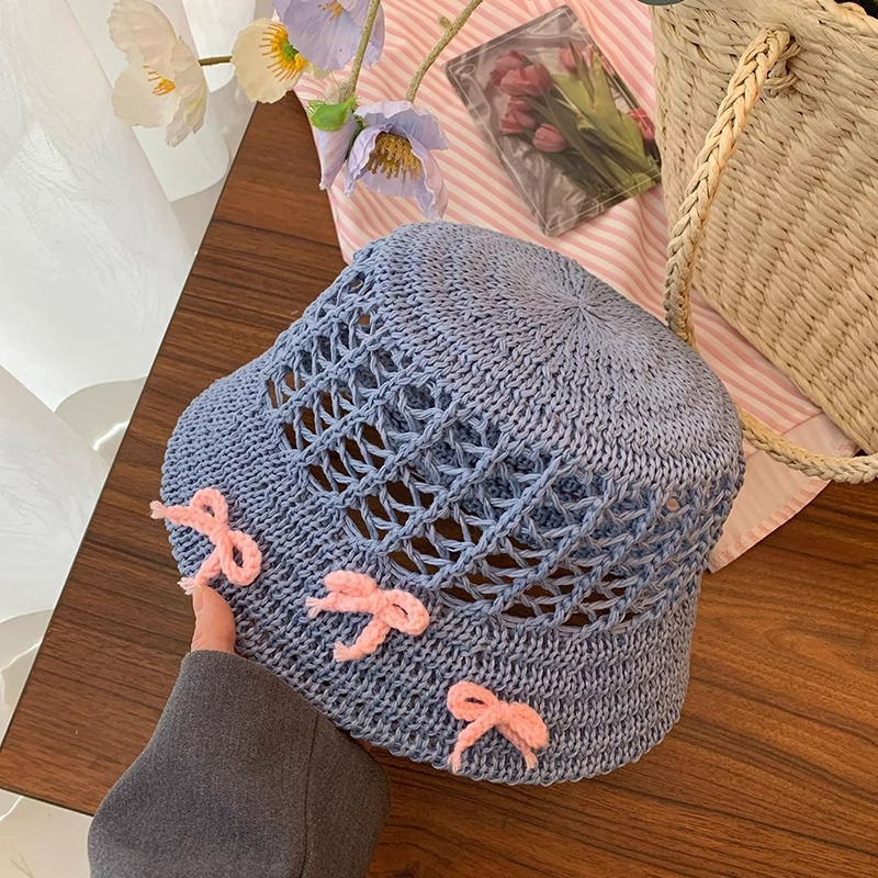 프랑스 할로우 블루 활 밀짚 모자 여성의 새로운 여름 해변 모자 틈새 디자인 선 스크린 태양 모자