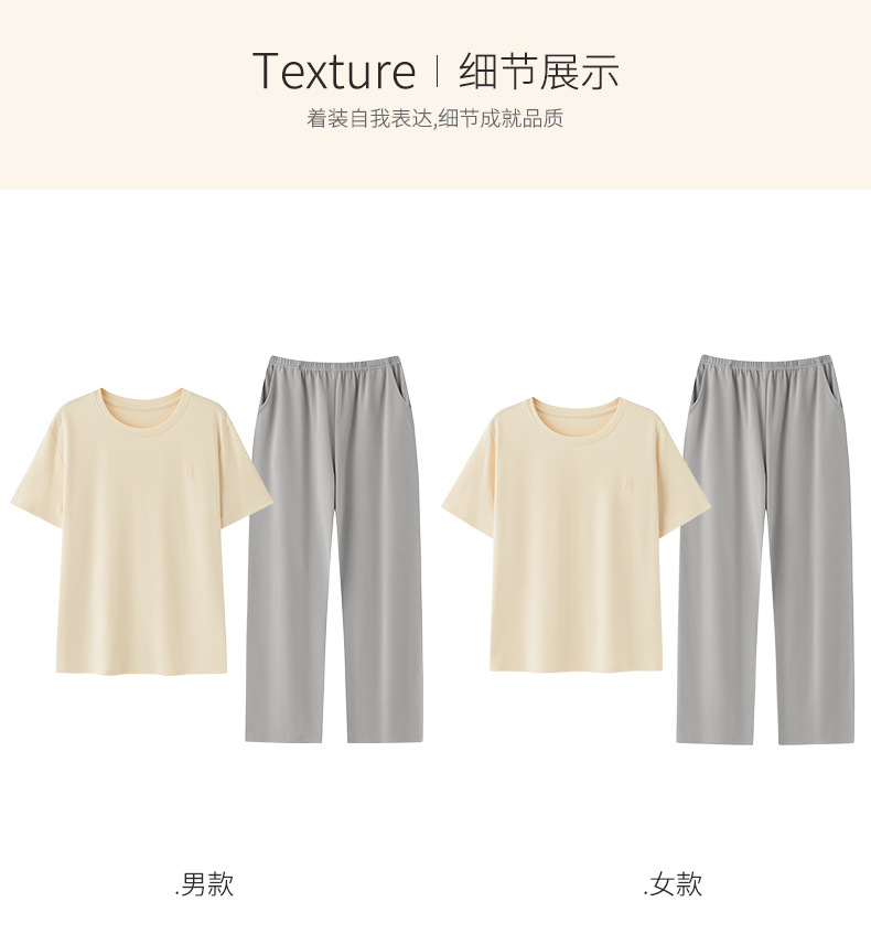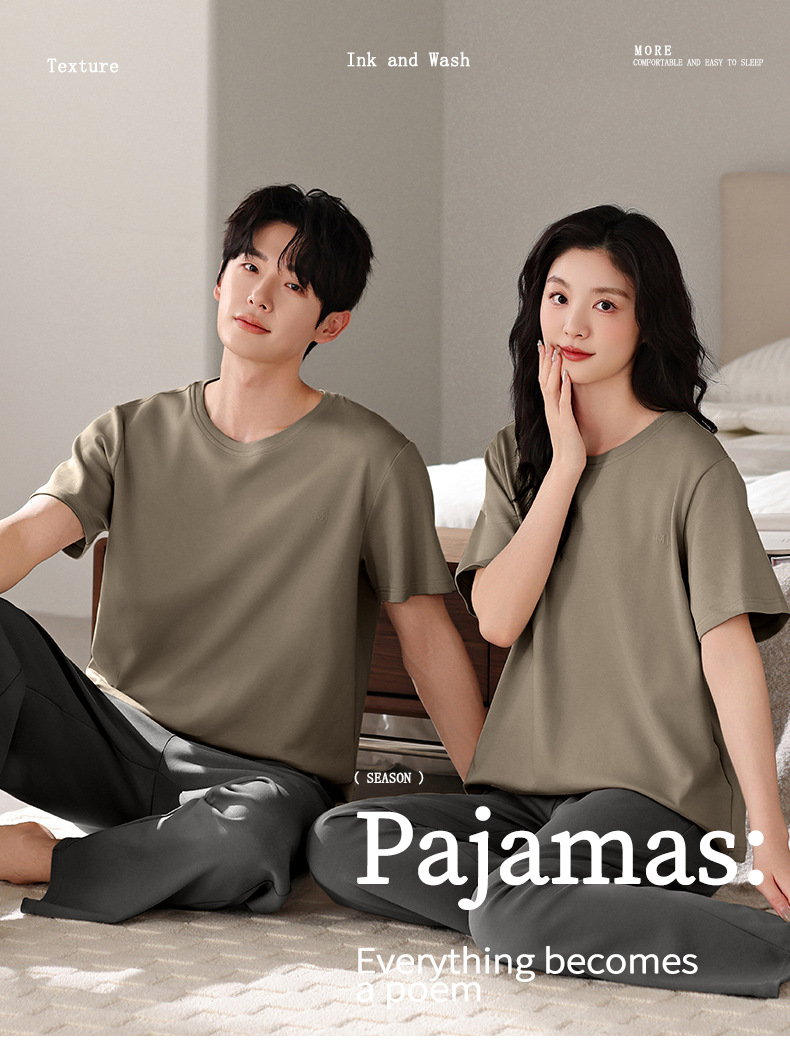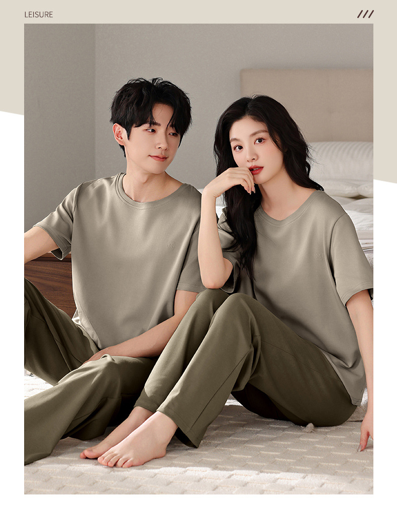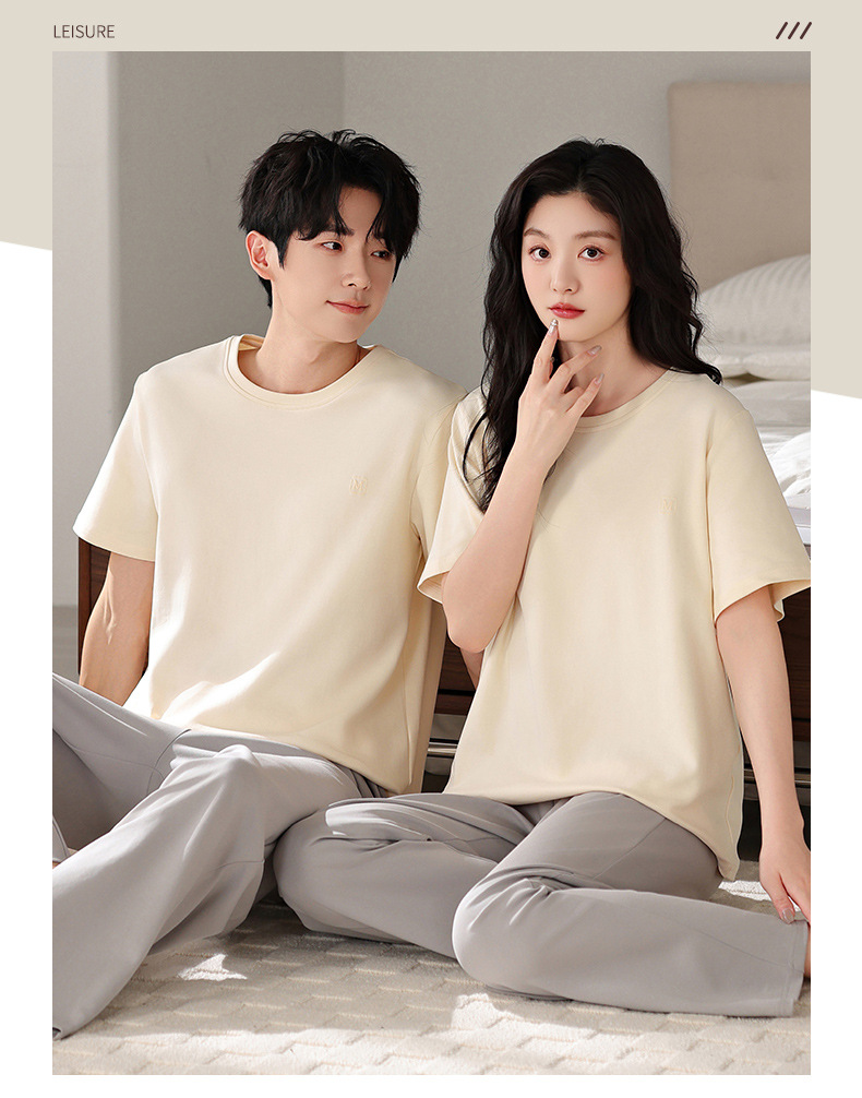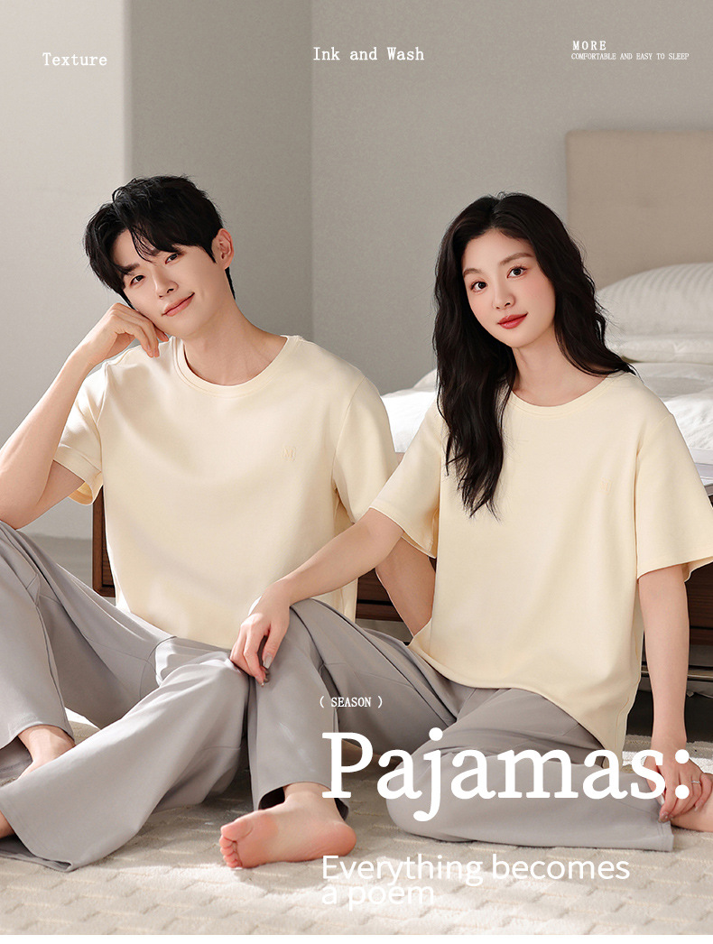 2025 새로운 커플 잠옷 여성 여름 풀오버 솔리드 컬러 코튼 반팔 바지 여성용 홈 의류 투피스 세트스토어 가기