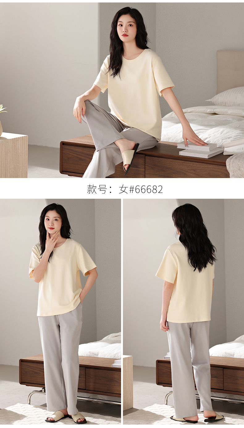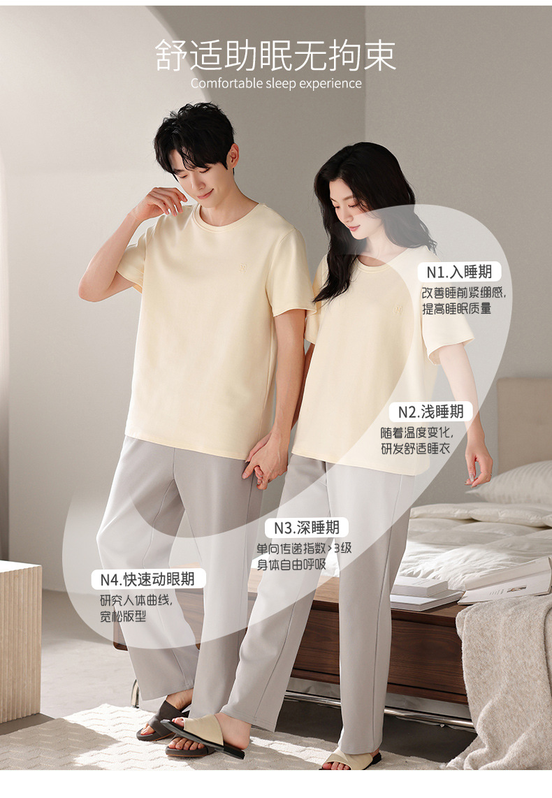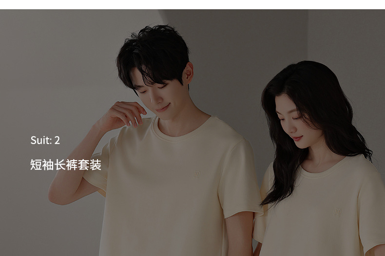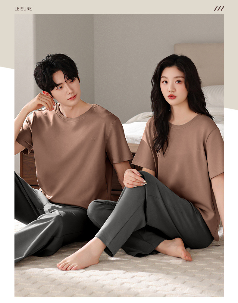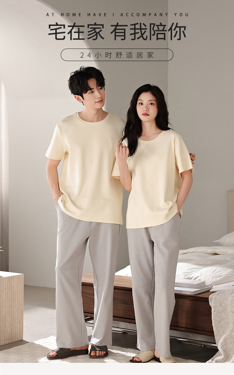 2025 새로운 커플 잠옷 여성 여름 풀오버 솔리드 컬러 코튼 반팔 바지 여성용 홈 의류 투피스 세트스토어 가기