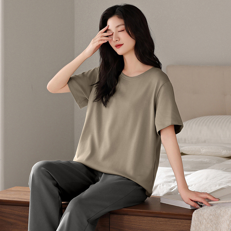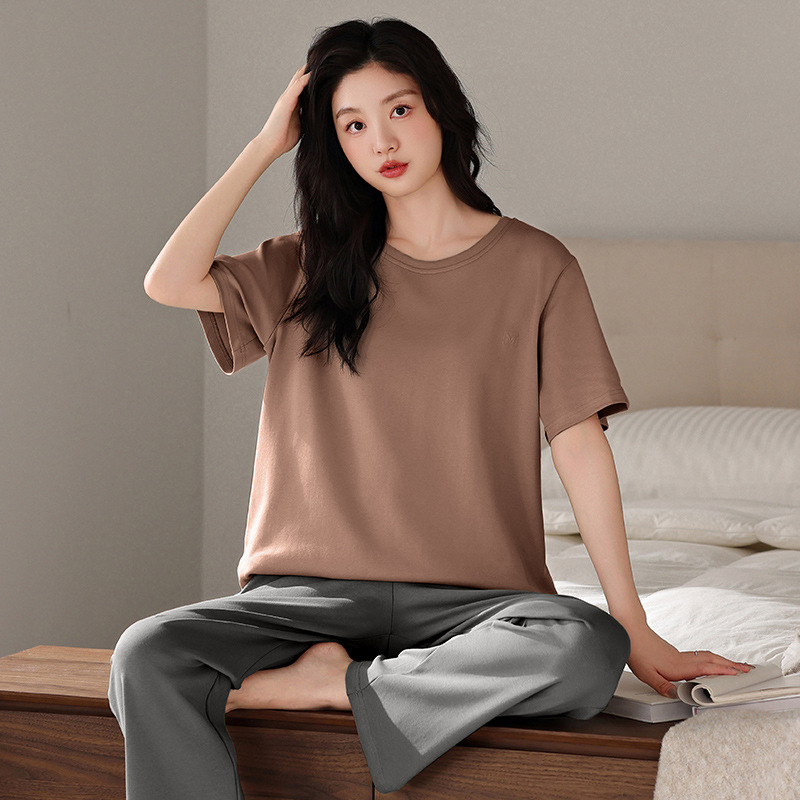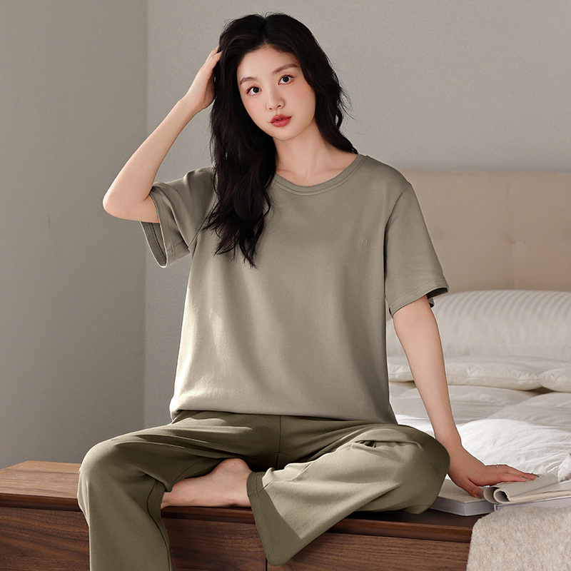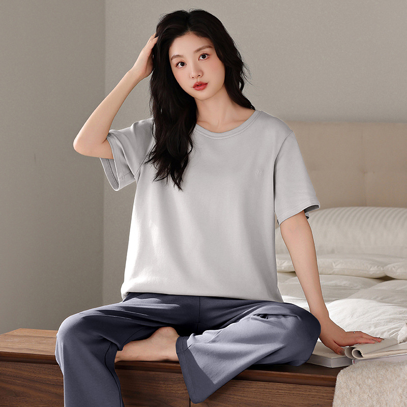 2025 새로운 커플 잠옷 여성 여름 풀오버 솔리드 컬러 코튼 반팔 바지 여성용 홈 의류 투피스 세트