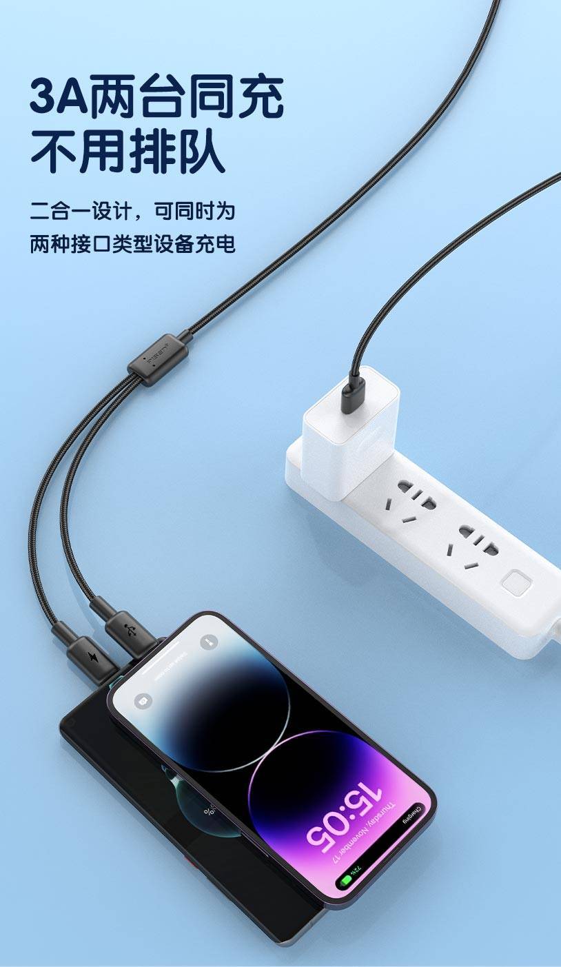 핀셩 2-in-1 데이터 케이블, 1대2 충전 케이블, 고속 충전, 삼중 연결구, 안드로이드 타입C 휴대폰 케이블, 다중 포트 도매스토어 가기