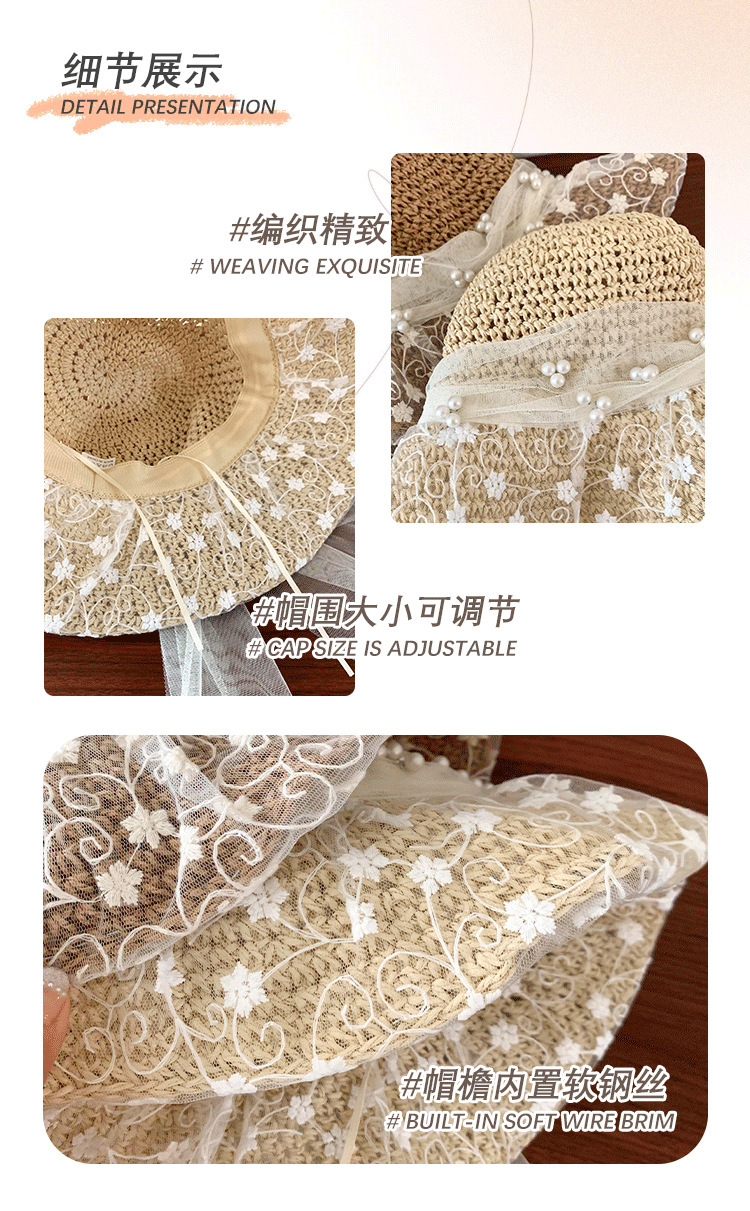 프랑스 레이스 펄 레이스 업 할로우 밀짚 모자 여성의 봄과 여름 햇빛 꽃 큰 브림 태양 모자 선 스크린 모자스토어 가기