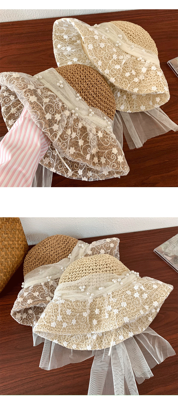 프랑스 레이스 펄 레이스 업 할로우 밀짚 모자 여성의 봄과 여름 햇빛 꽃 큰 브림 태양 모자 선 스크린 모자