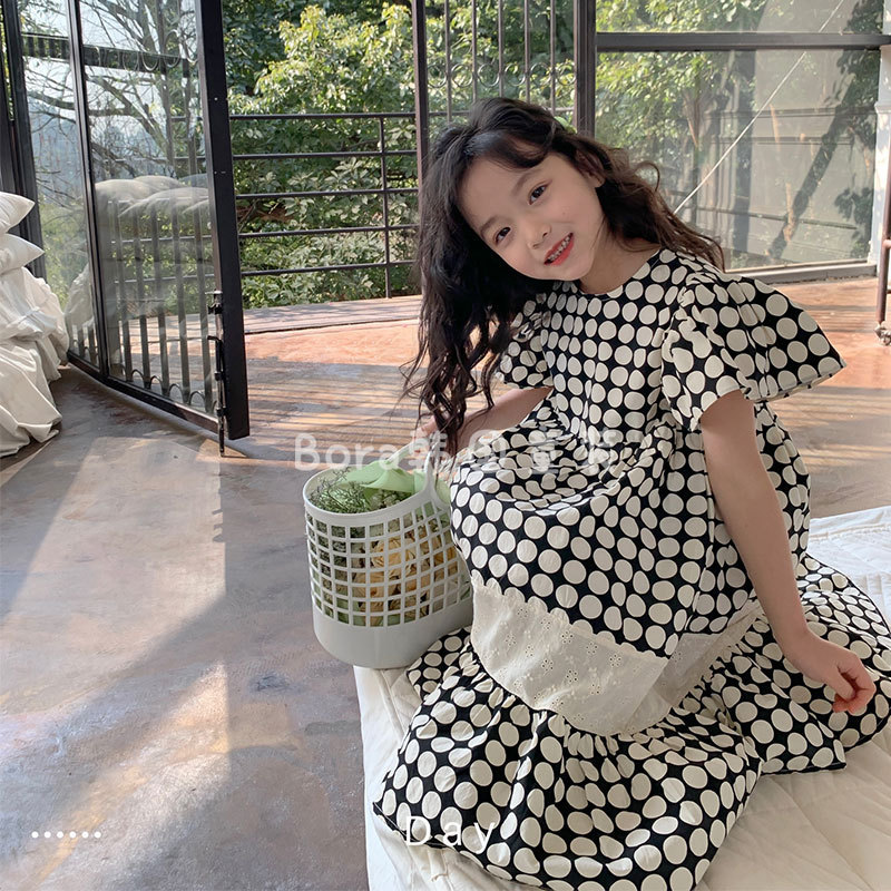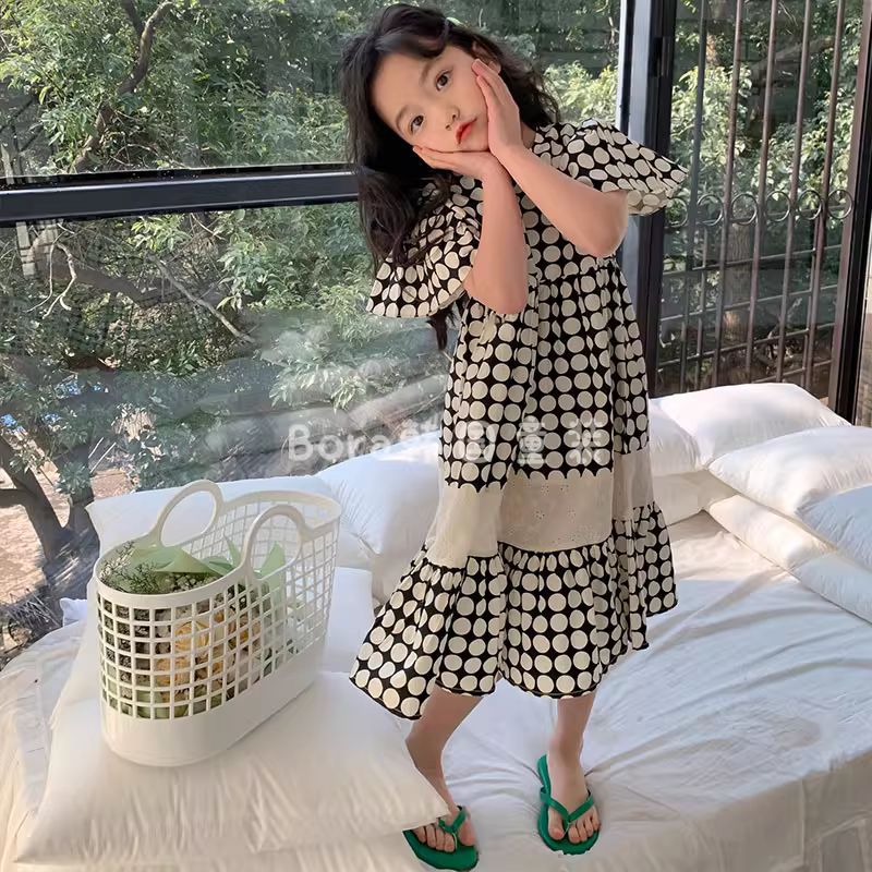 여아 드레스 여름 2025 새로운 스타일 아동용 반팔 시원한 스커트 큰 아동복 폴카 도트 무릎 위 롱 스커트
