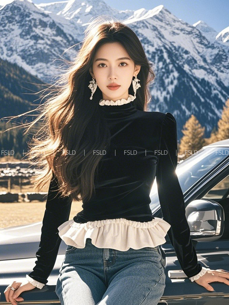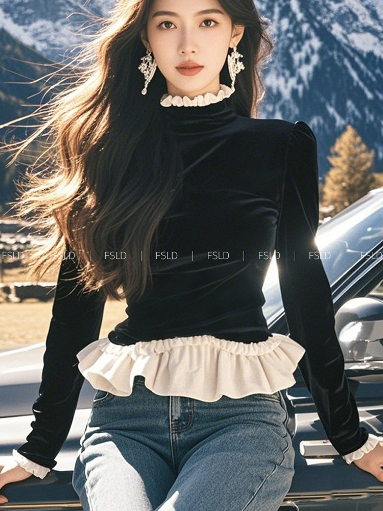YT396205 프랑스 독특한 작은 탑 블랙 하이 넥 벨벳 베이스 셔츠 2024 새로운 여성의 가을과 겨울 빛