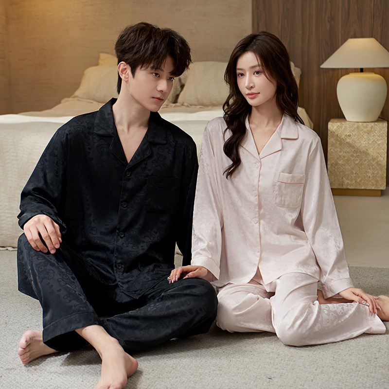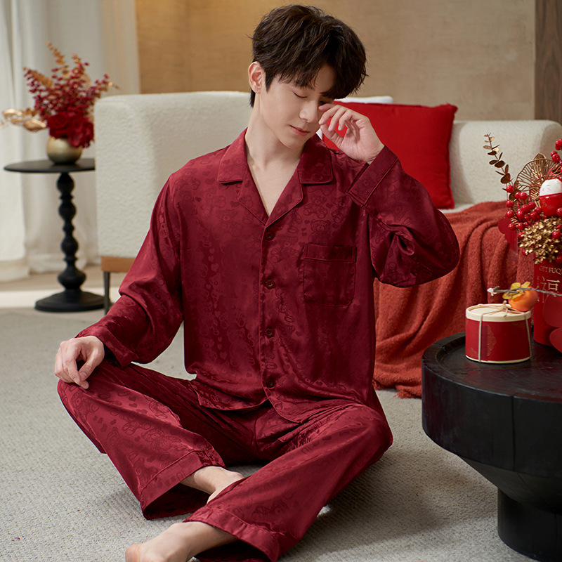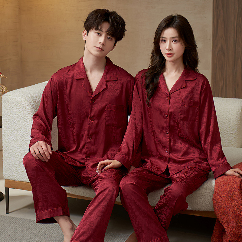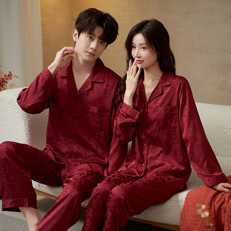 2025 새로운 웨딩 커플 잠옷 레드 아이스 실크 자카드 긴 소매 홈 의류 남성과 여성 세트