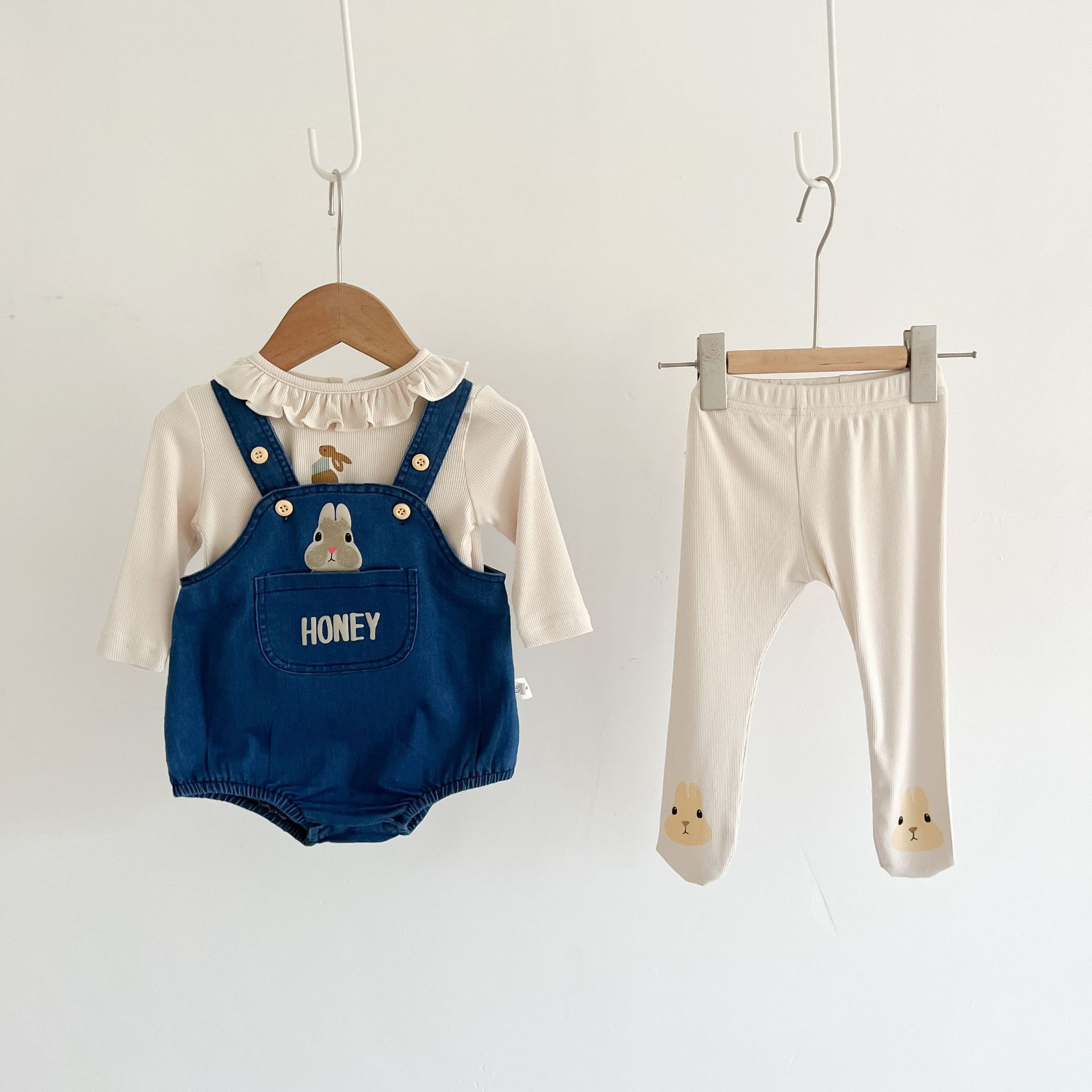 남성과 여성 아기 데님 멜빵 세트 가을 아기베이스 코트 데님 팬티 스타킹 싱글 샷
