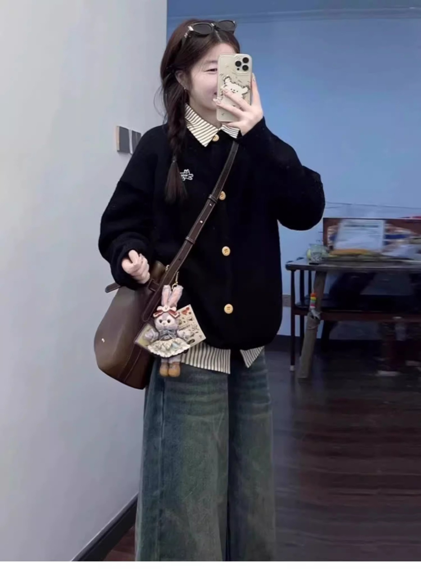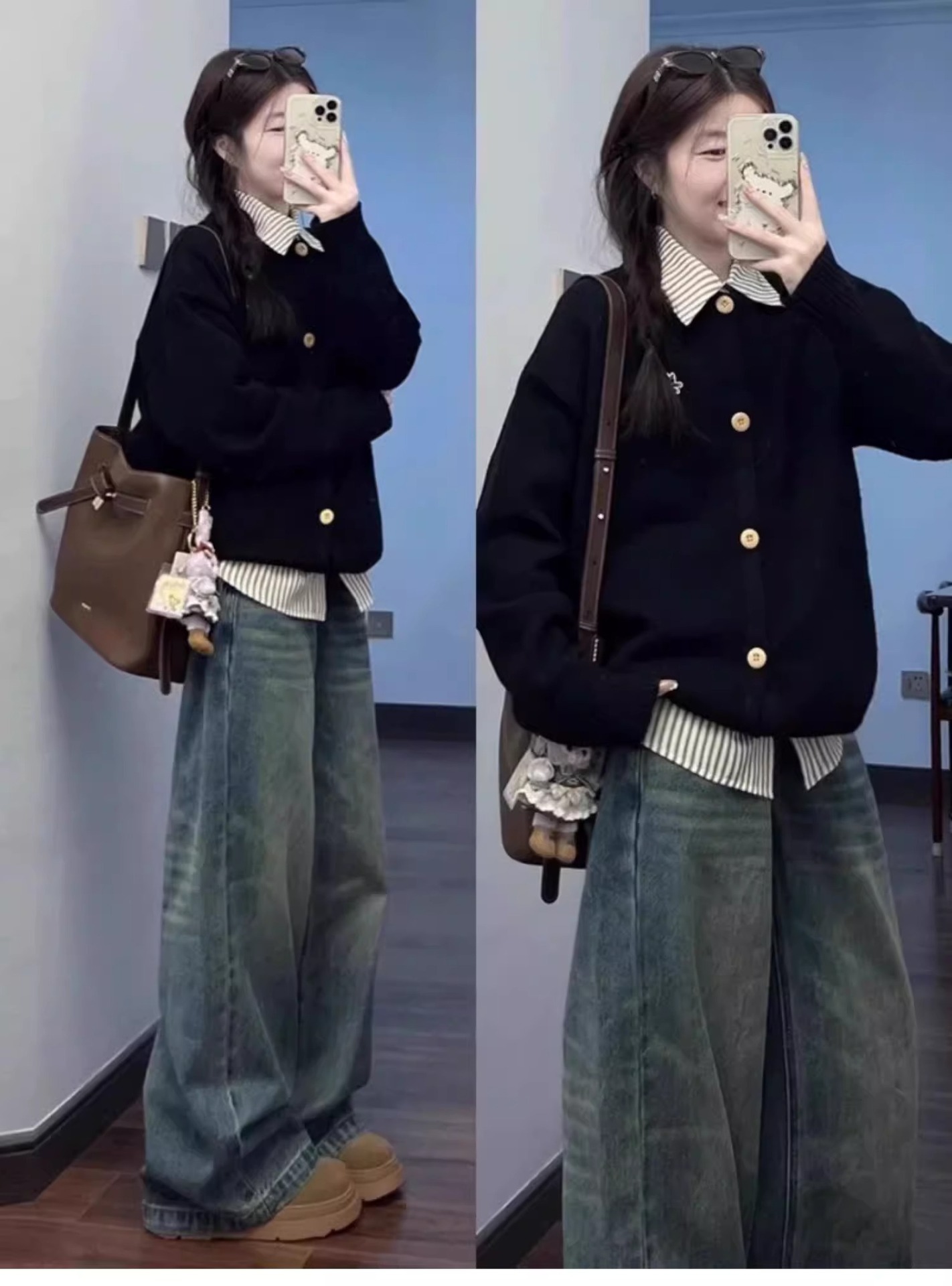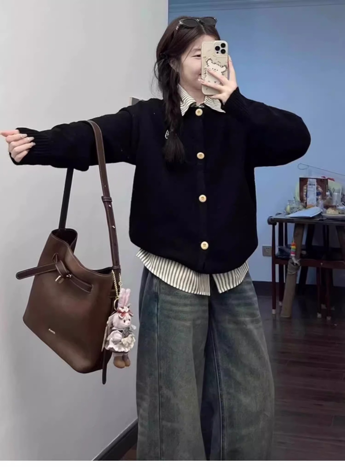 한국식 가짜 투피스 대학용 셔츠 칼라 스웨터 여성 코트 봄과 가을 폴로 칼라 라지 하이 엔드 니트 카디건스토어 가기