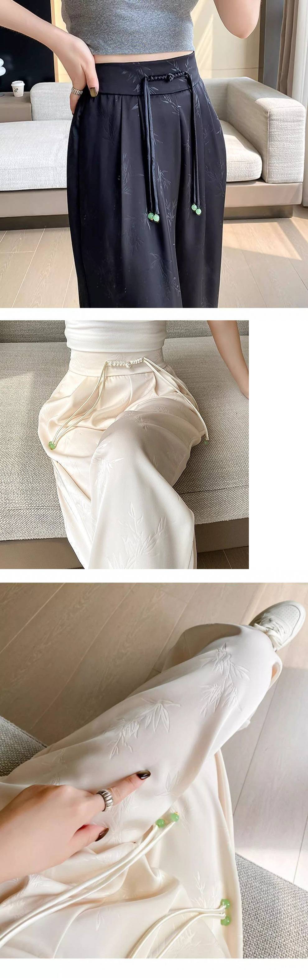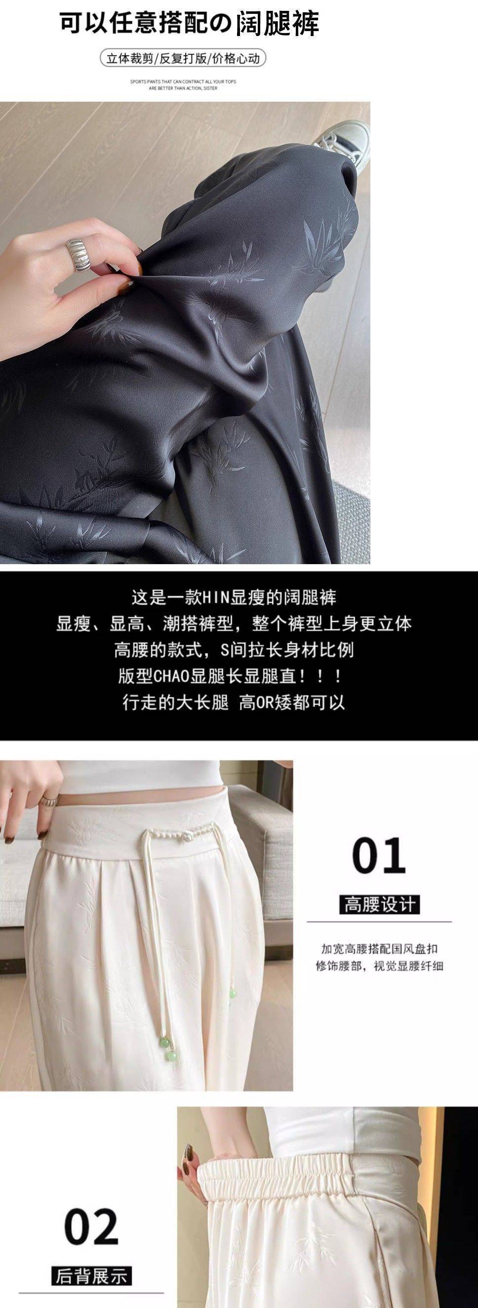 새로운 중국 새틴 자카드 넓은 다리 바지 여성 2025 봄 새로운 도착 버클 높은 허리 슬리밍 스트레이트 캐주얼 바지
