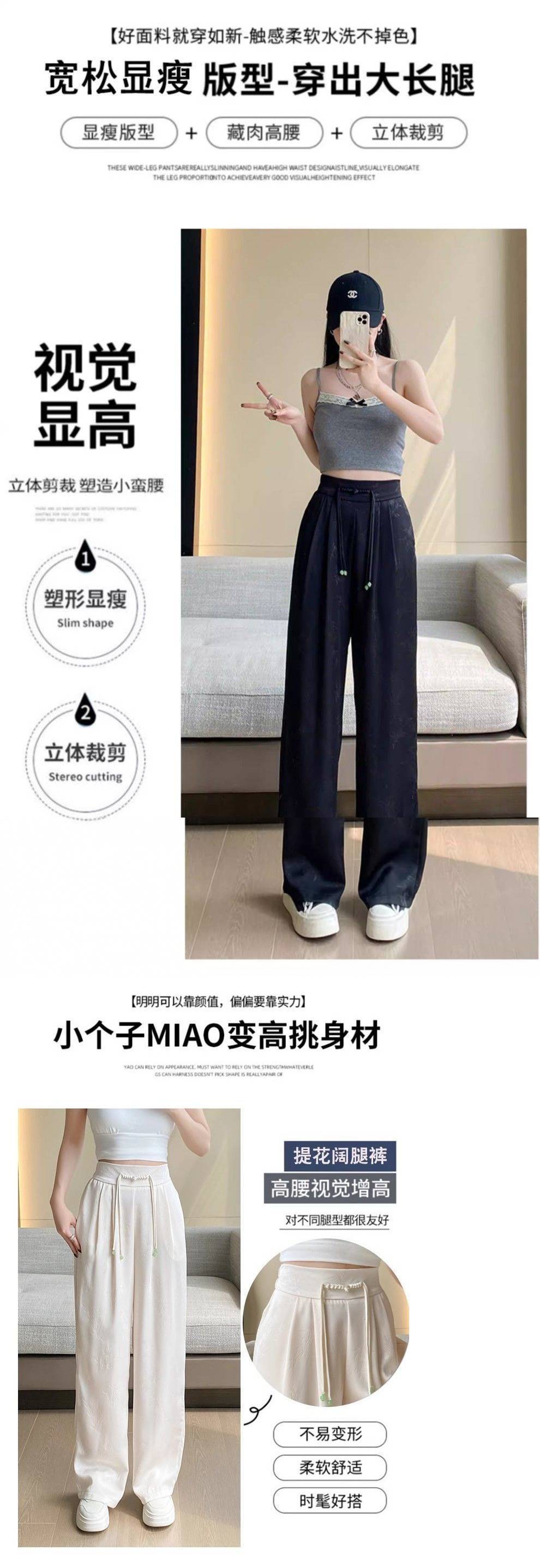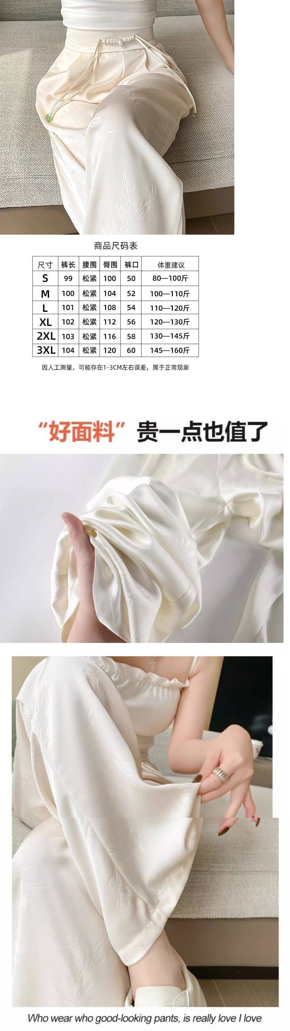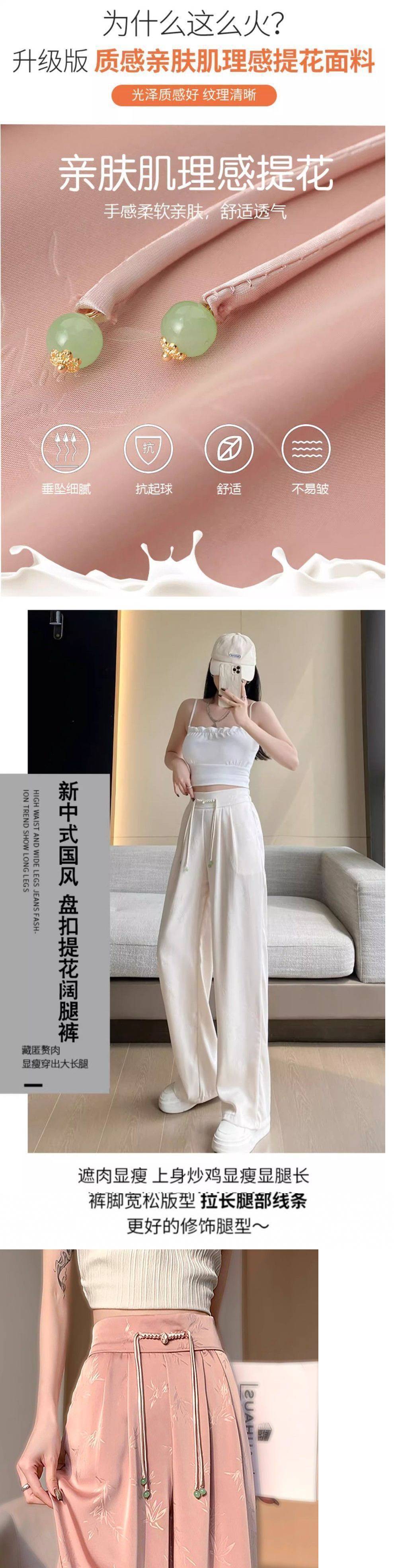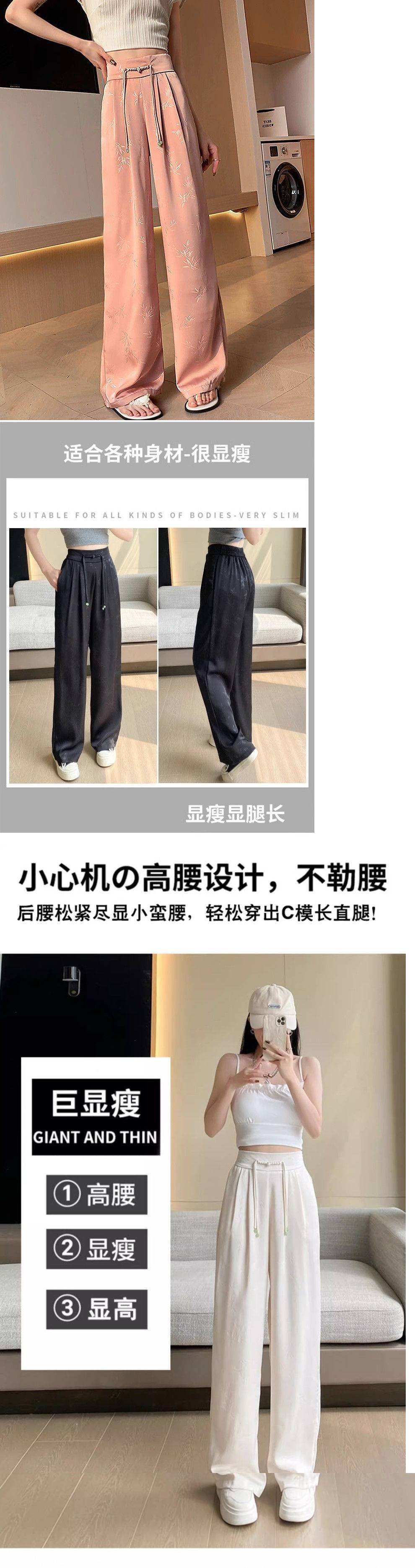 새로운 중국 새틴 자카드 넓은 다리 바지 여성 2025 봄 새로운 도착 버클 높은 허리 슬리밍 스트레이트 캐주얼 바지스토어 가기